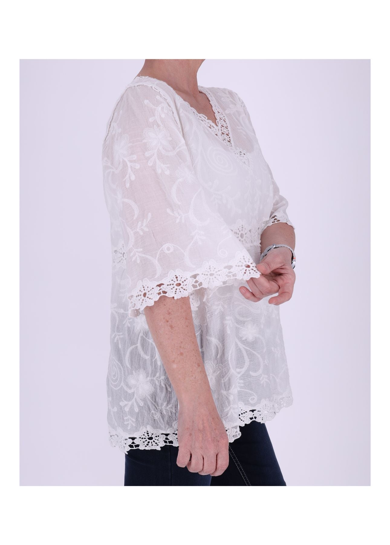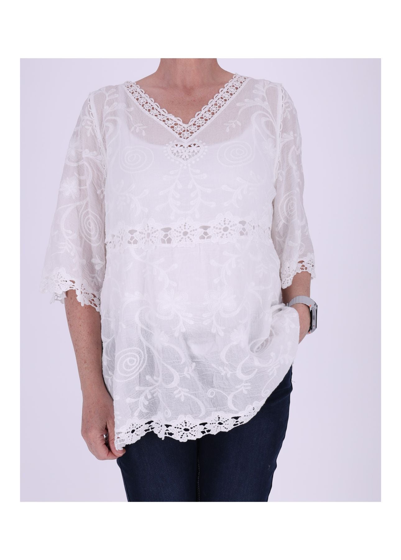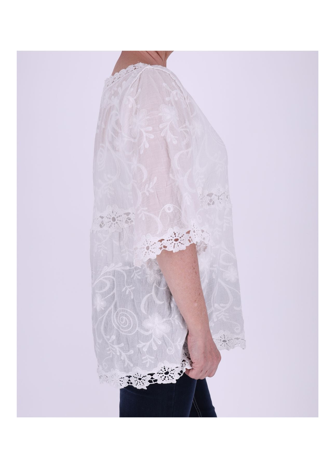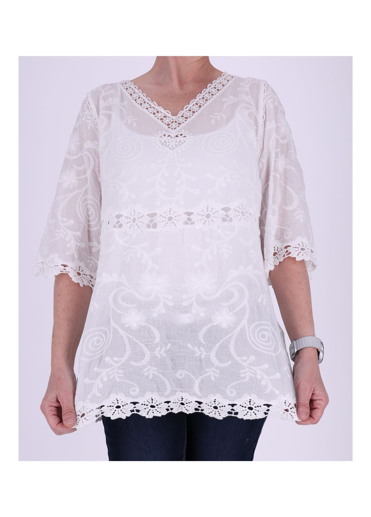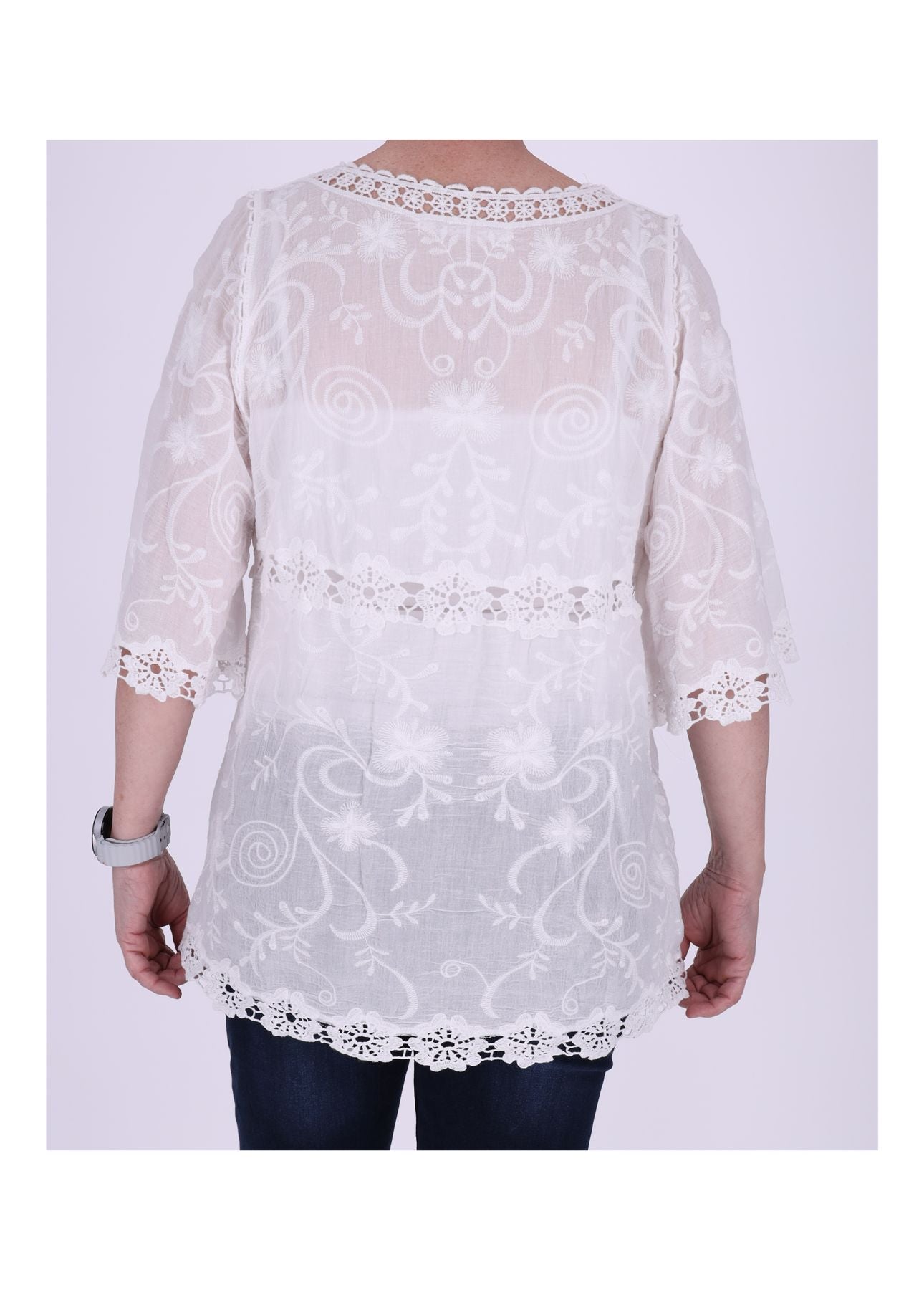 Diese Tunika ist wie gemacht für sonnige Tage, laue Abende und deinen ganz persönlichen Boho-Moment. Der weiche, leichte Baumwollstoff schmiegt sich angenehm an die Haut, während die zarten, gehäkelten Applikationen in Blumenoptik einen Hauch Romantik und Handwerkskunst versprühen. Durchsichtige Einsätze und liebevoll gehäkelte Säume sowie ein detailverliebter Halsausschnitt machen dieses Piece zu einem echten Sommerliebling – feminin, luftig, selbstbewusst.