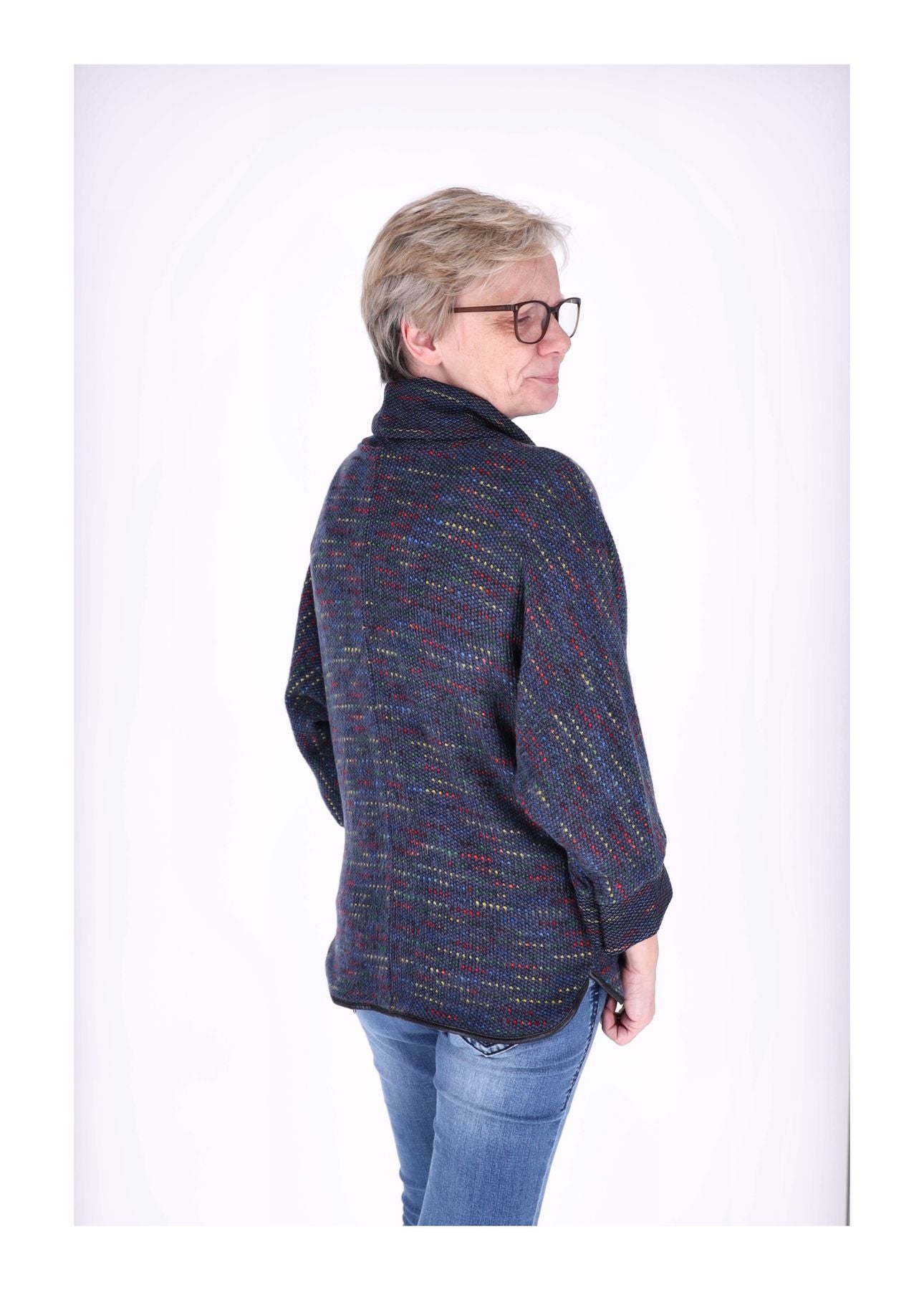 Die Raglanärmel und der 3/4-Arm-Schnitt sorgen für Bewegungsfreiheit und einen modernen Look, während das gemusterte Wolloptik-Material für angenehme Wärme und ein hochwertiges Tragegefühl sorgt.