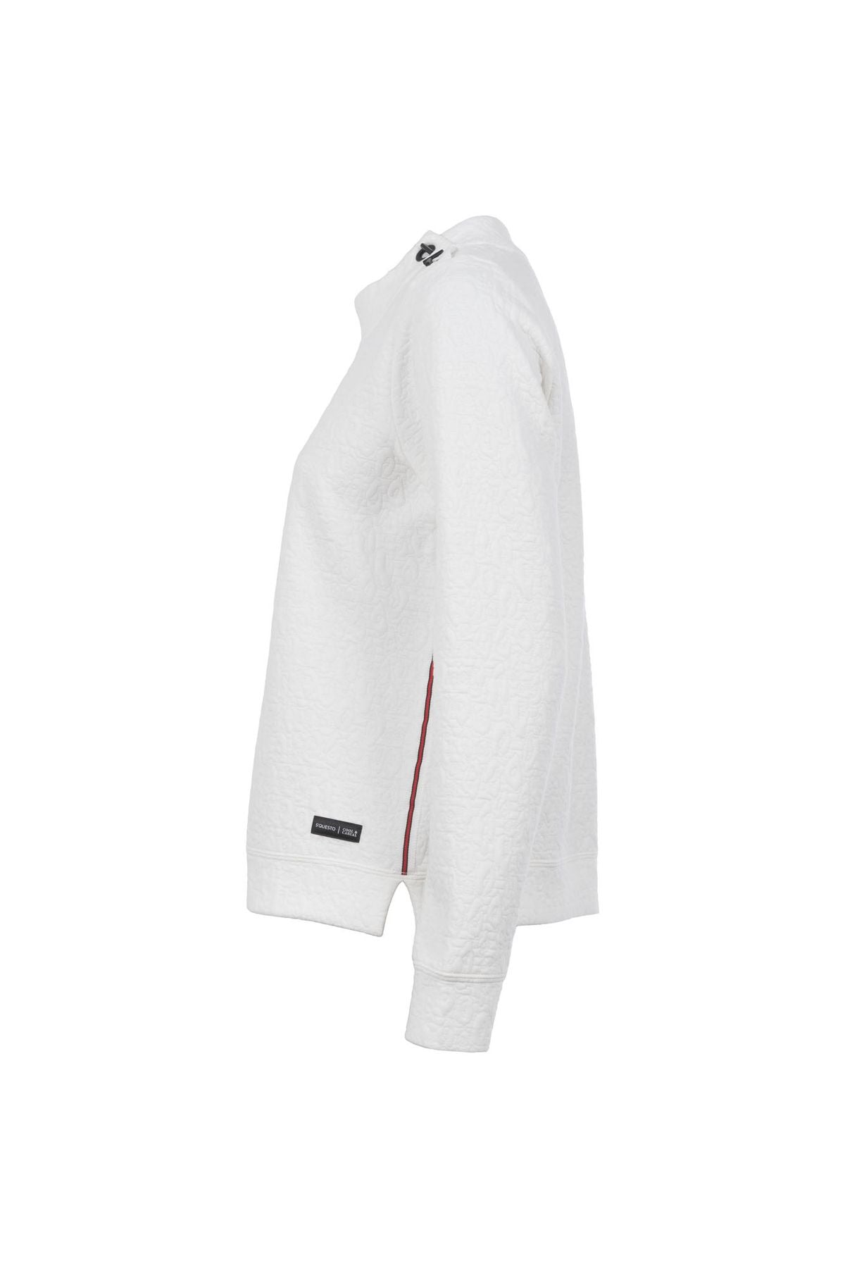 Sweatpullover in Musteroptik mit leichtem Stehkragen. Ein echter Hingucker sind die besondere Knopflösung an der linken Schulter und die Tapes entlang der Seitennaht.