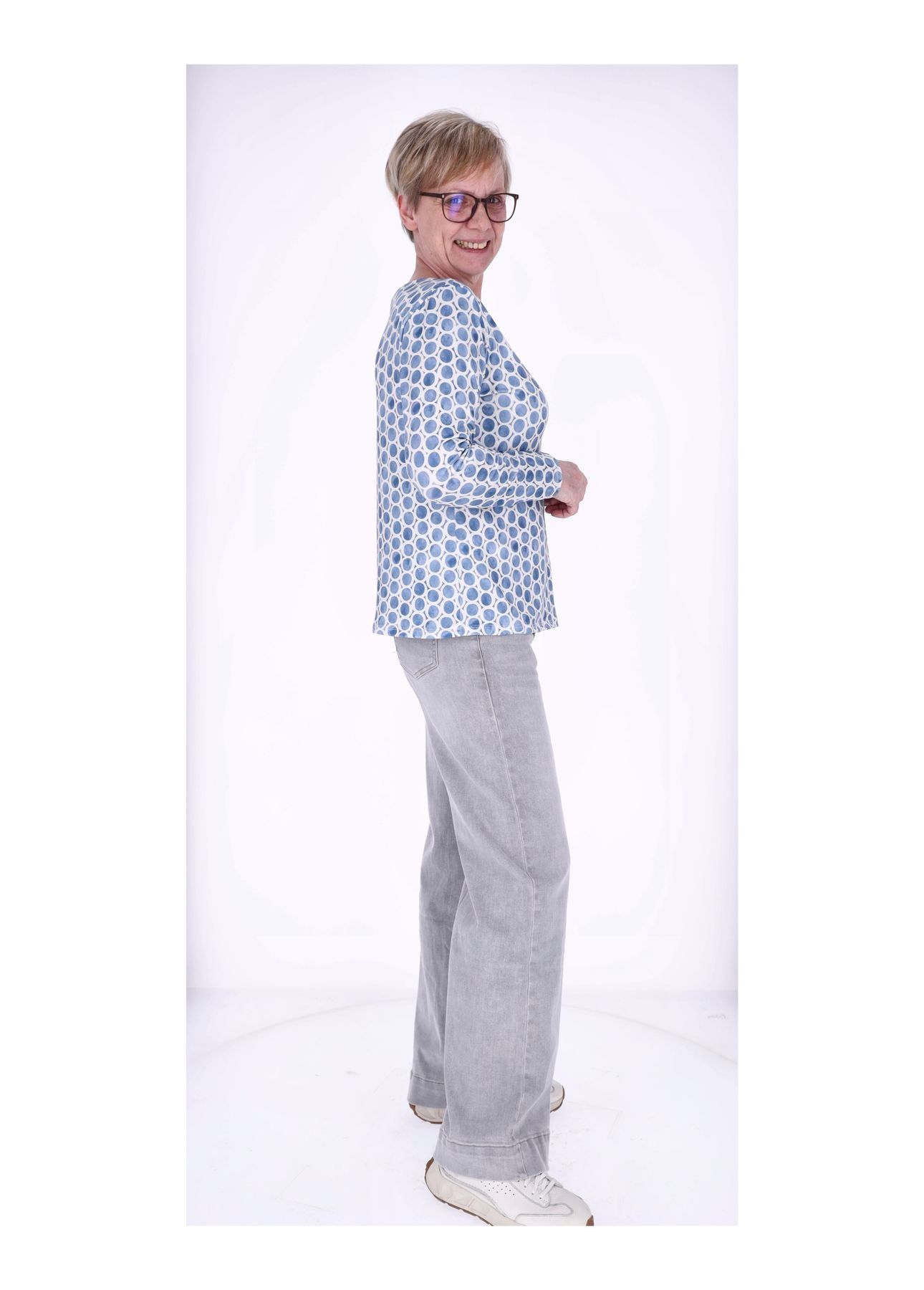 Dieses Damen-Shirt überzeugt mit einem allover Kreis-Muster und einem bequemen Schnitt. Aus elastischem Material gefertigt, passt es sich angenehm an den Körper an und sorgt für einen modernen Freizeit- oder City-Look.