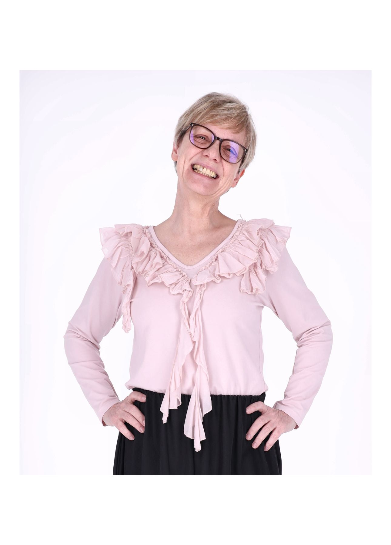 Dieses Damen-Shirt überzeugt mit femininem Detail: Ein V-Ausschnitt und feine Rüschen am Hals verleihen dem Shirt einen romantischen Touch. Die Rüschen fallen leicht nach vorne und schaffen einen fließenden Look – ideal für Casual- oder City-Outfits.