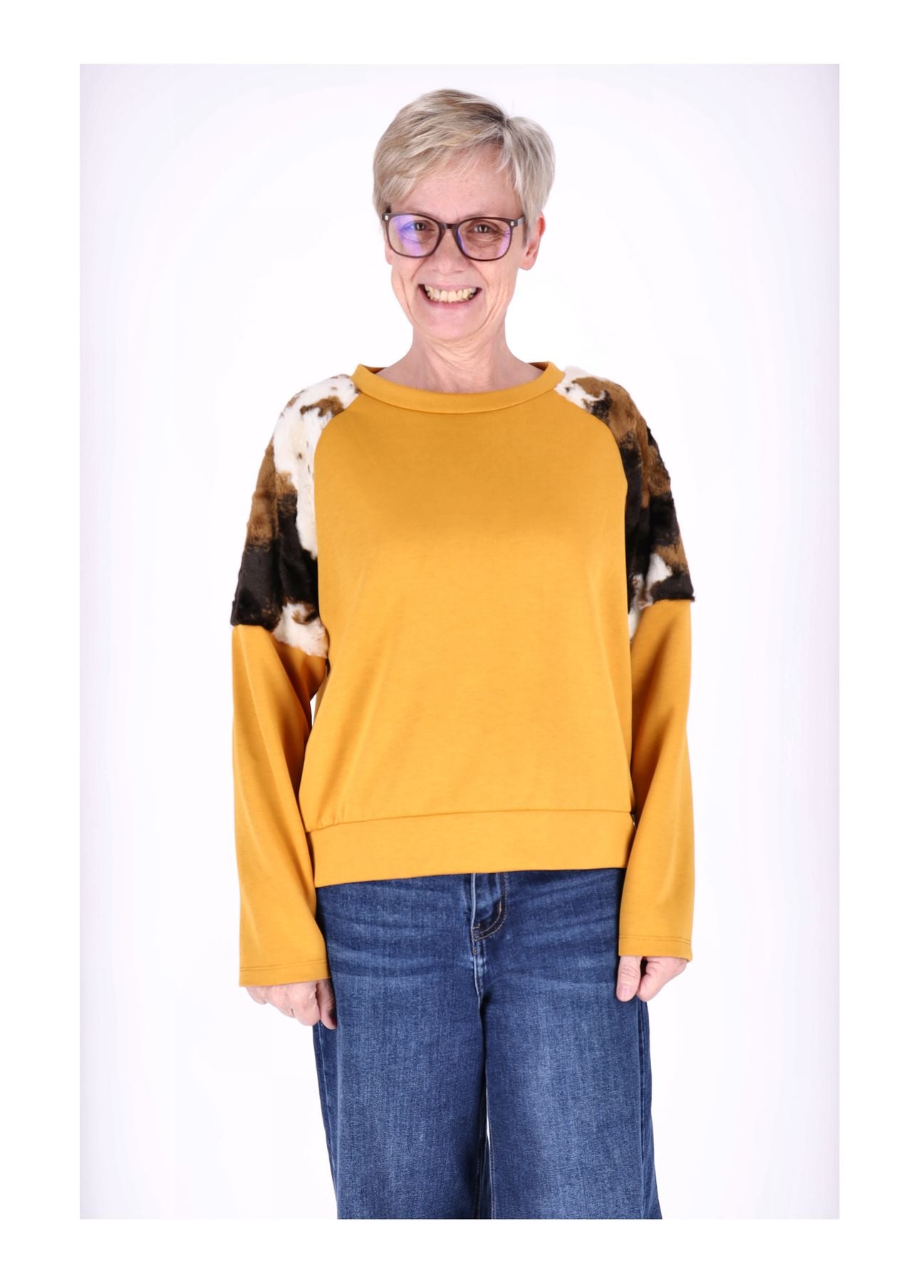Das Highlight: flauschiger Stoff an den Schultern mit stylischem Kuhfell-Muster, der dem klassischen Sweatpullover einen modernen, auffälligen Twist verleiht und garantiert Blicke auf sich zieht.