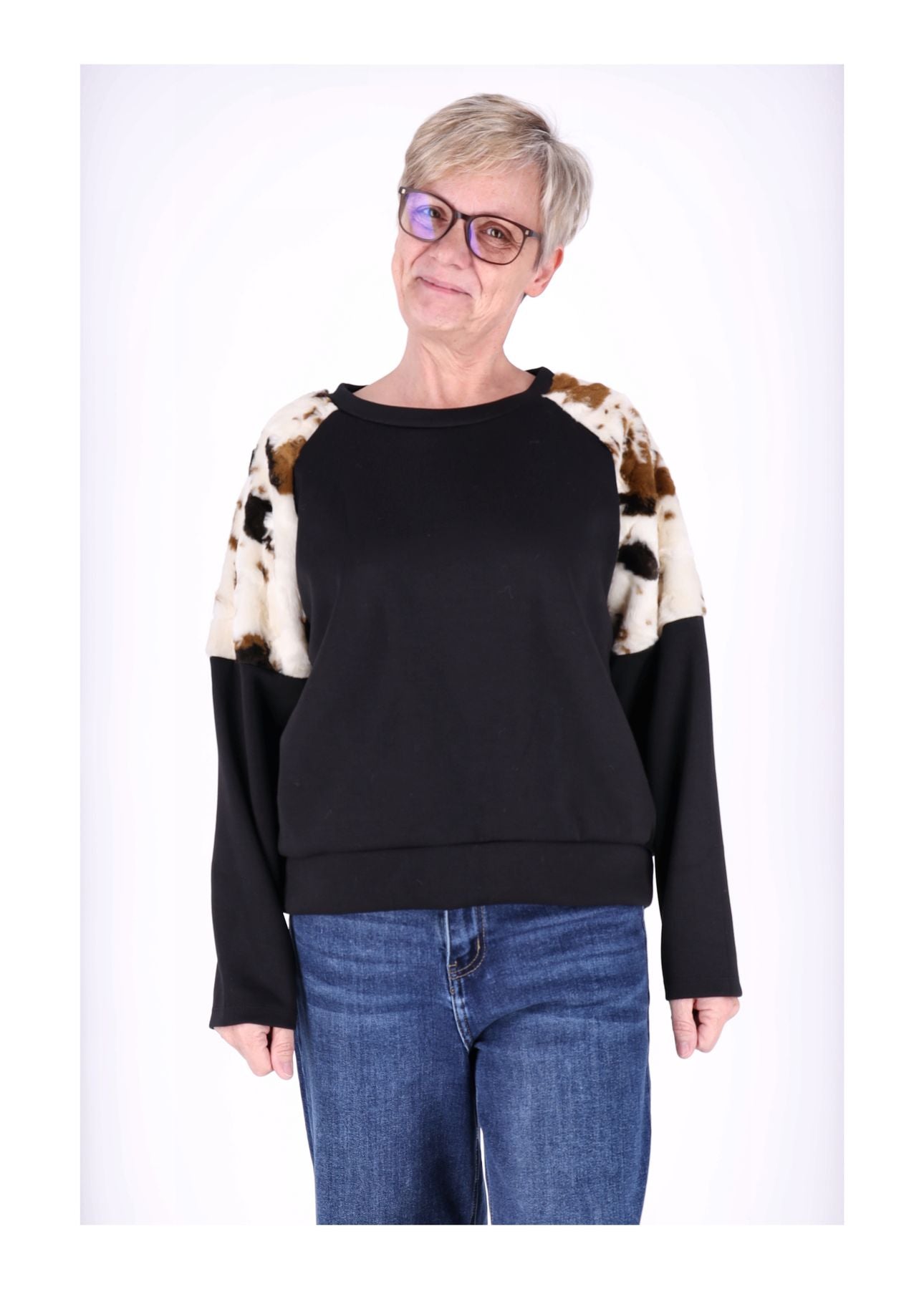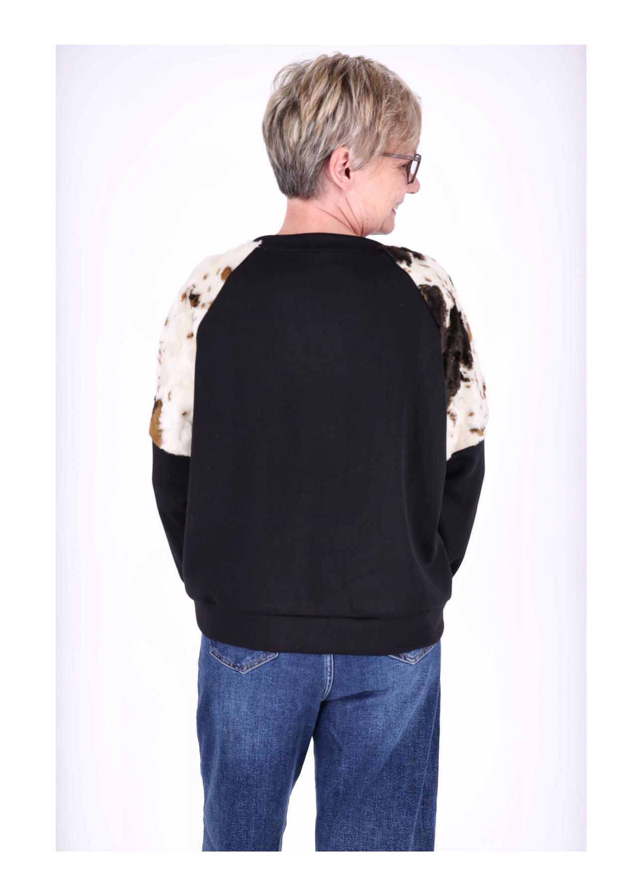 Das Highlight: flauschiger Stoff an den Schultern mit stylischem Kuhfell-Muster, der dem klassischen Sweatpullover einen modernen, auffälligen Twist verleiht und garantiert Blicke auf sich zieht.