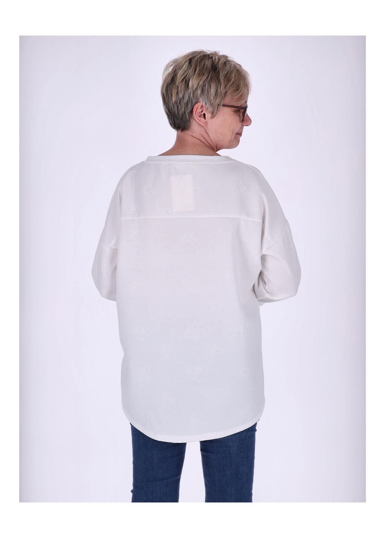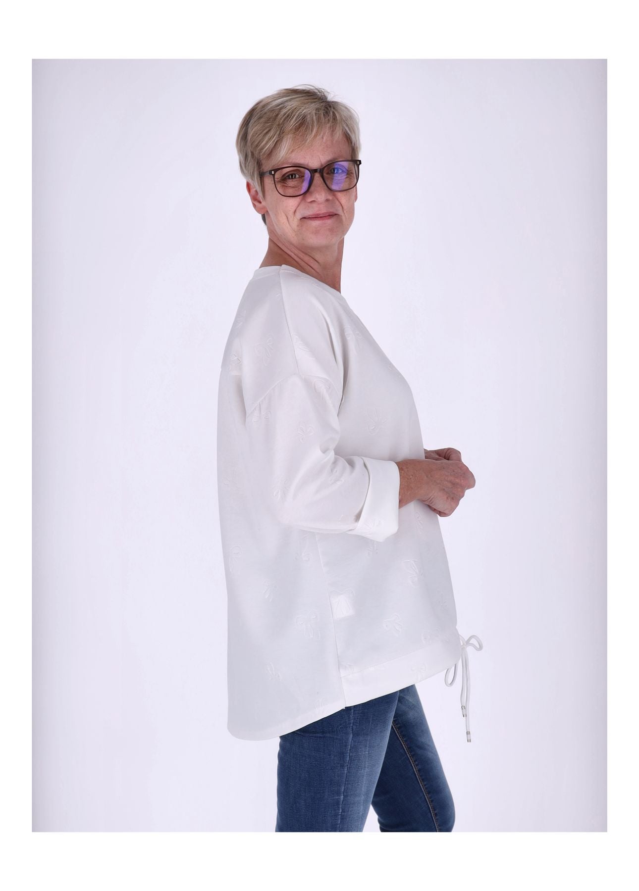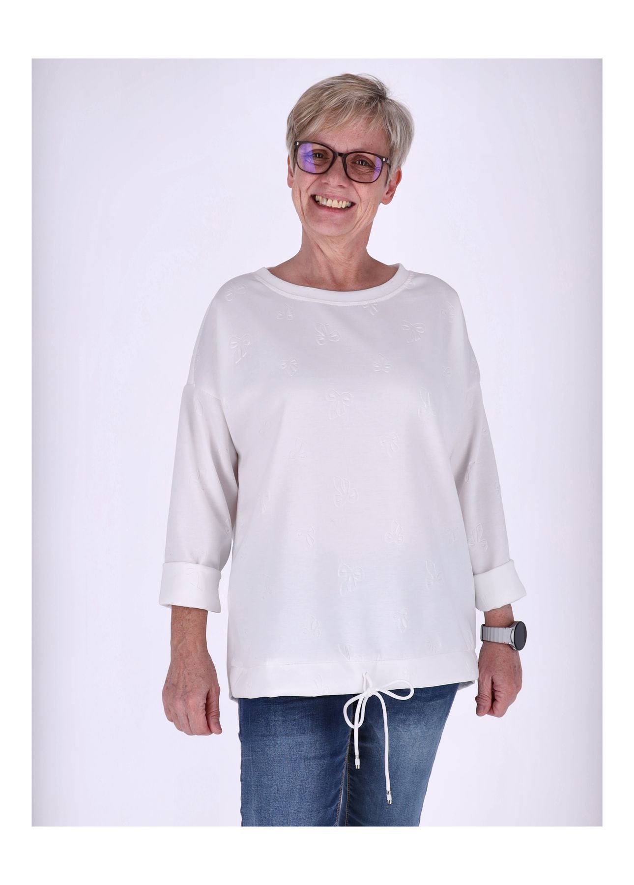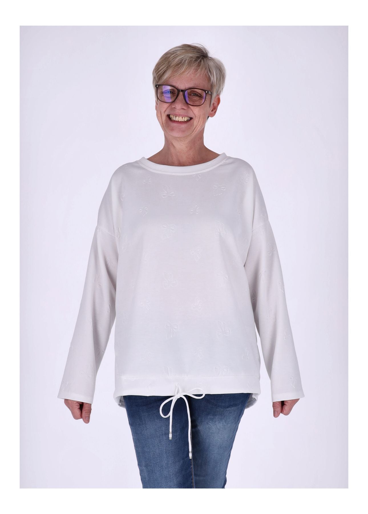 Das Highlight: eine dezente Prägung in Form einer Schleife verleiht dem Pullover einen femininen Akzent. Ein Zugband am Saum ermöglicht eine individuelle Anpassung und sorgt für eine perfekte Silhouette. Der klassische Rundhals rundet das Design stilvoll ab.