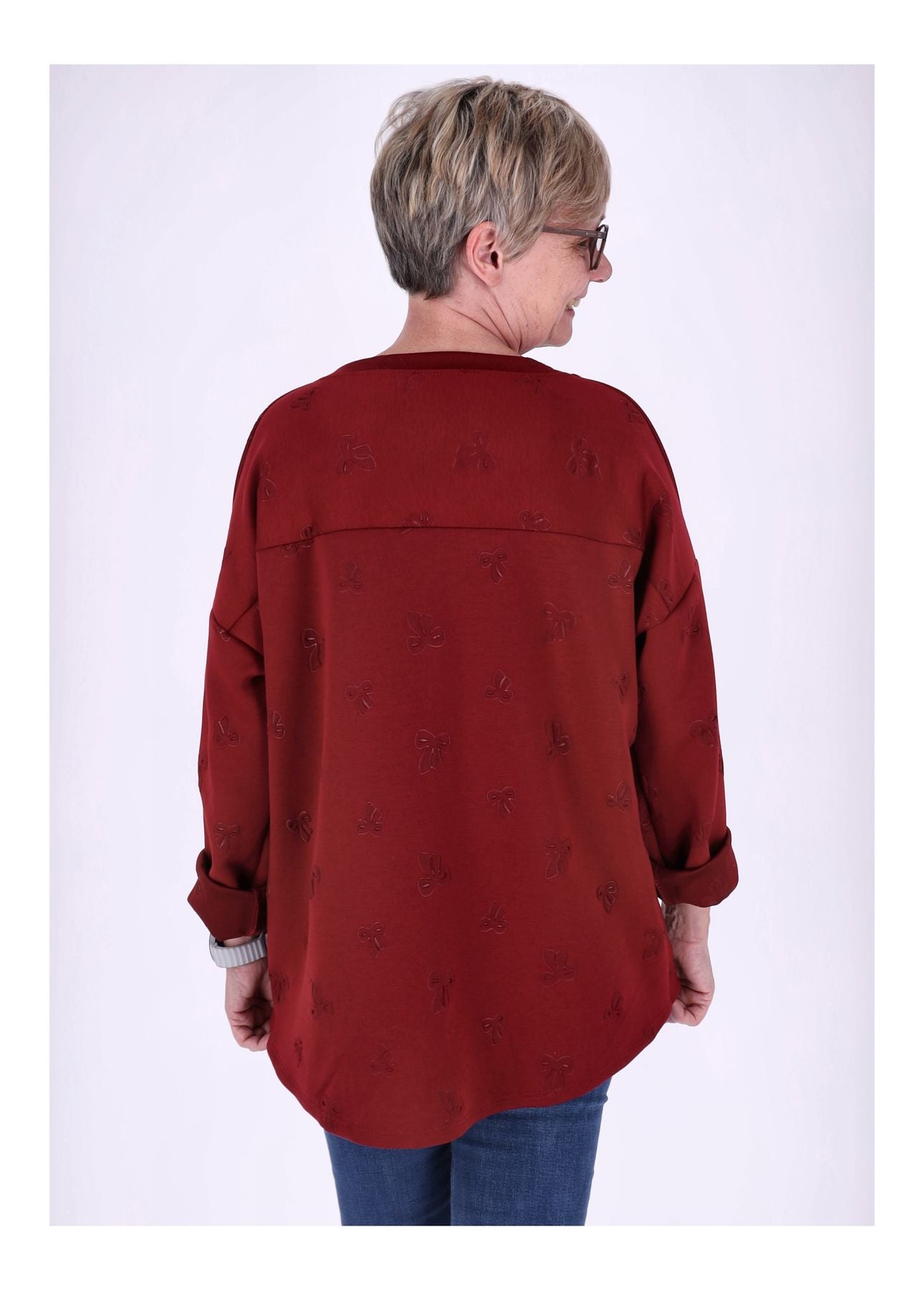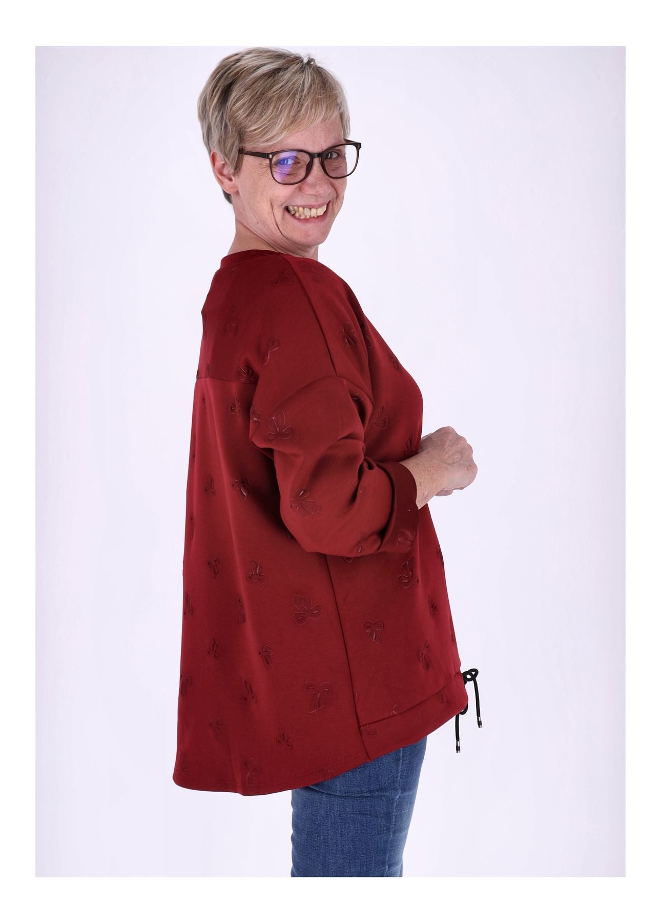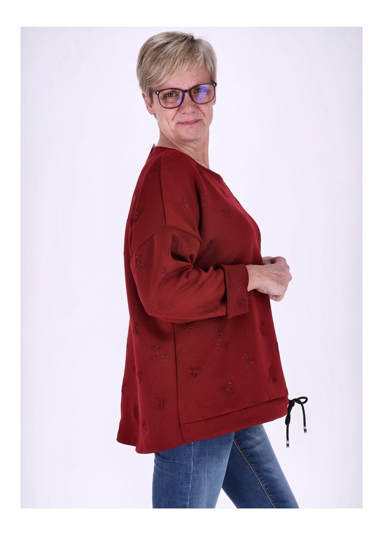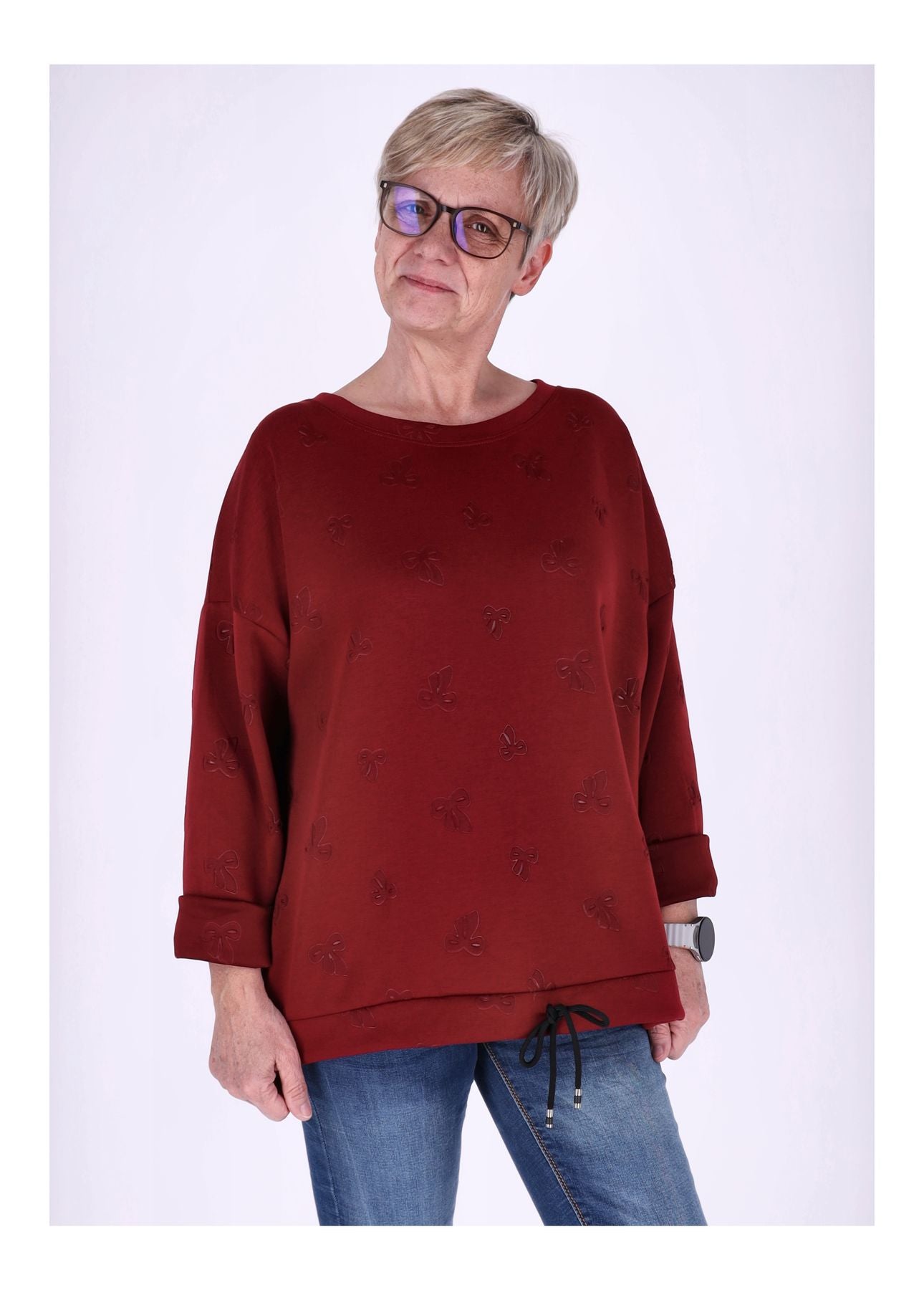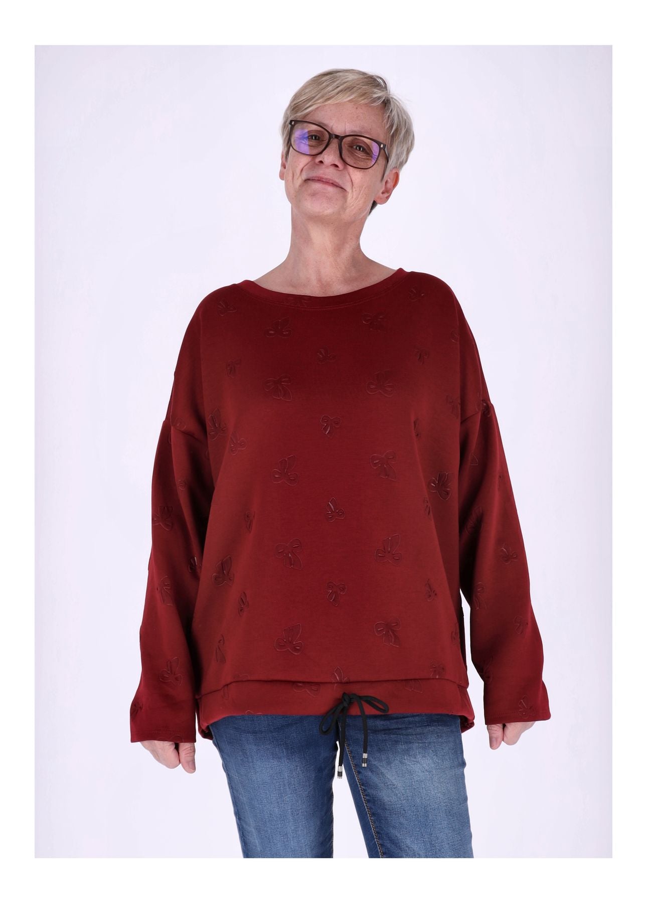Das Highlight: eine dezente Prägung in Form einer Schleife verleiht dem Pullover einen femininen Akzent. Ein Zugband am Saum ermöglicht eine individuelle Anpassung und sorgt für eine perfekte Silhouette. Der klassische Rundhals rundet das Design stilvoll ab.