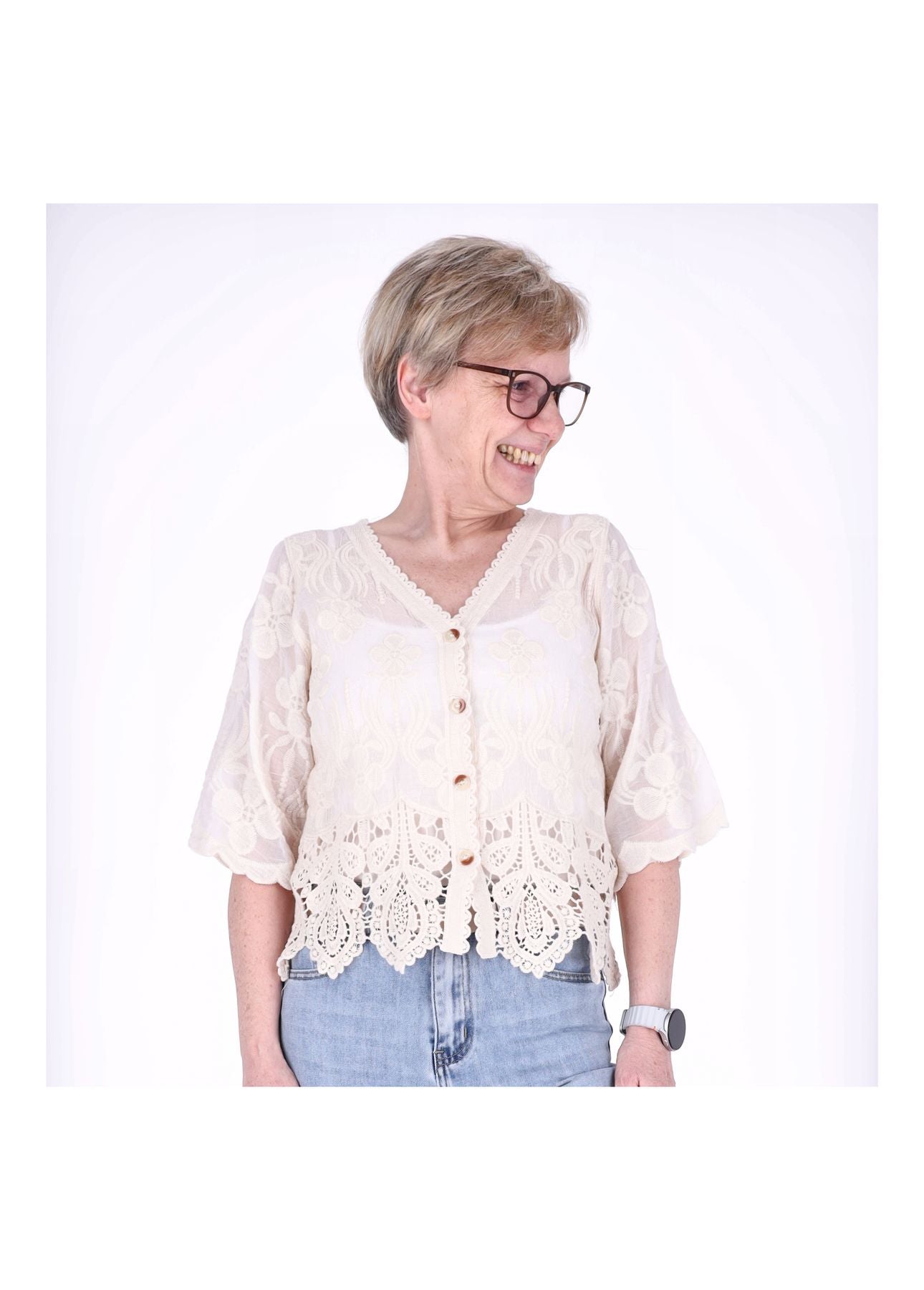 Leicht, feminin und mit liebevollen Details: Diese BOHO-Strickjacke verzaubert mit zarter Spitze, floralen Mustern und einer dekorativen Knopfleiste. Der 3/4-Arm sorgt für eine sommerliche Leichtigkeit, während der feine Baumwollstoff angenehm auf der Haut liegt. Perfekt zu Jeans, Kleid oder Top – für einen entspannten, romantischen Look.
