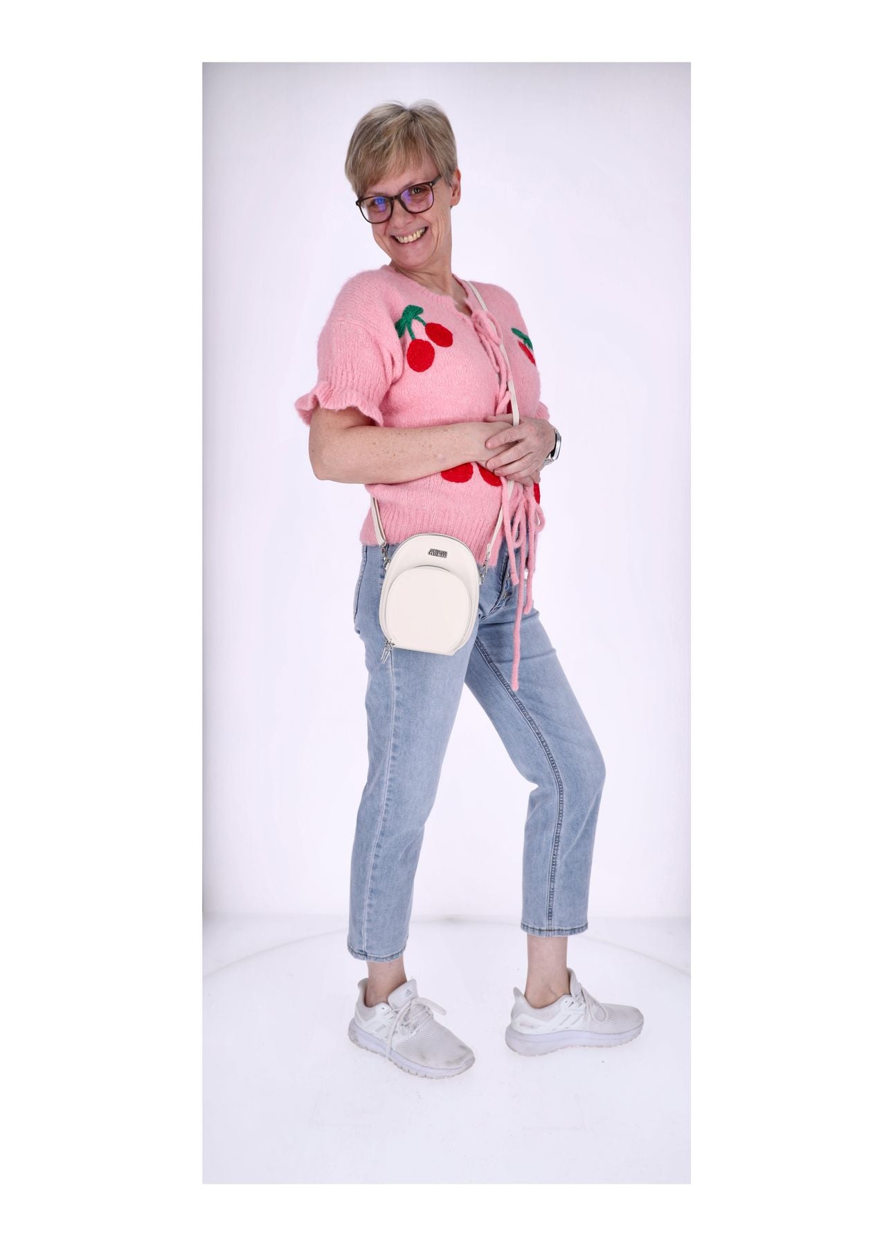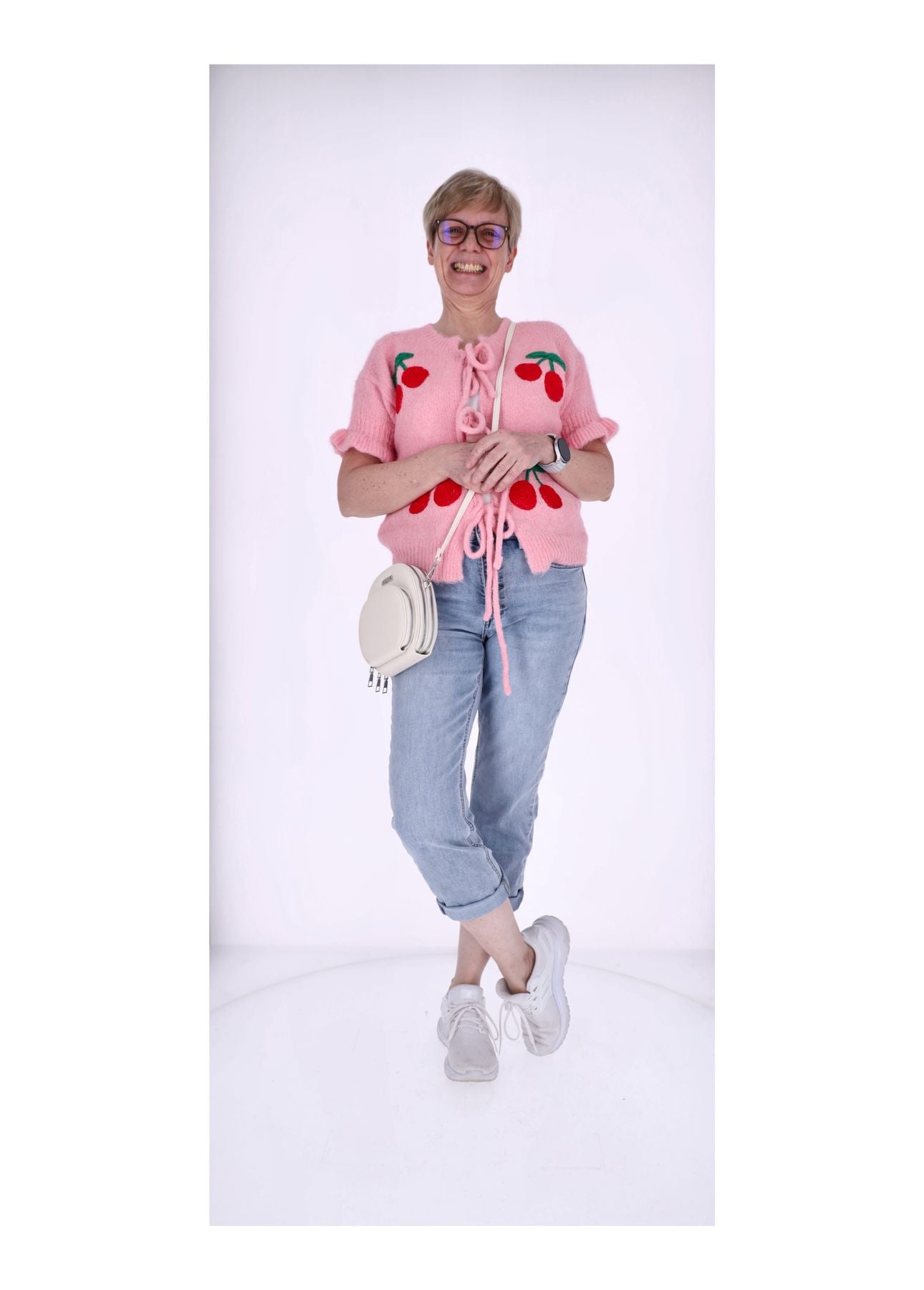 Verspielt und feminin: Kurzarm-Strickjacke mit plastischen Kirsch-Applikationen, gerafften Ärmeln und dekorativer Schnürung vorne. Weich, formstabil und perfekt für Alltag, Freizeit oder Layering.