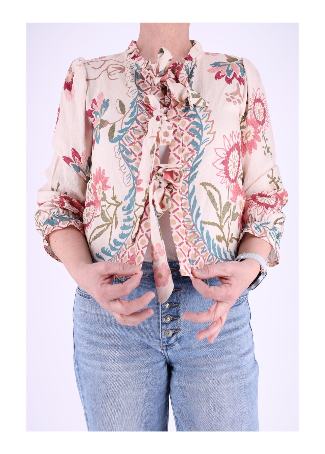 Diese leichte Blusenjacke vereint romantischen Stil mit einem Hauch von Lässigkeit. Das zarte Blümchenmuster verleiht ihr eine feminine Ausstrahlung, während die raffinierten Rüschen-Details am Kragen und an den Ärmeln für eine elegante Note sorgen.
