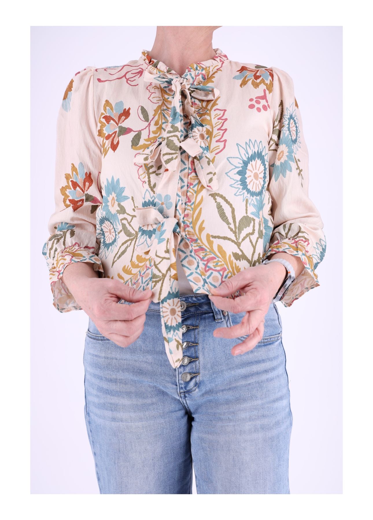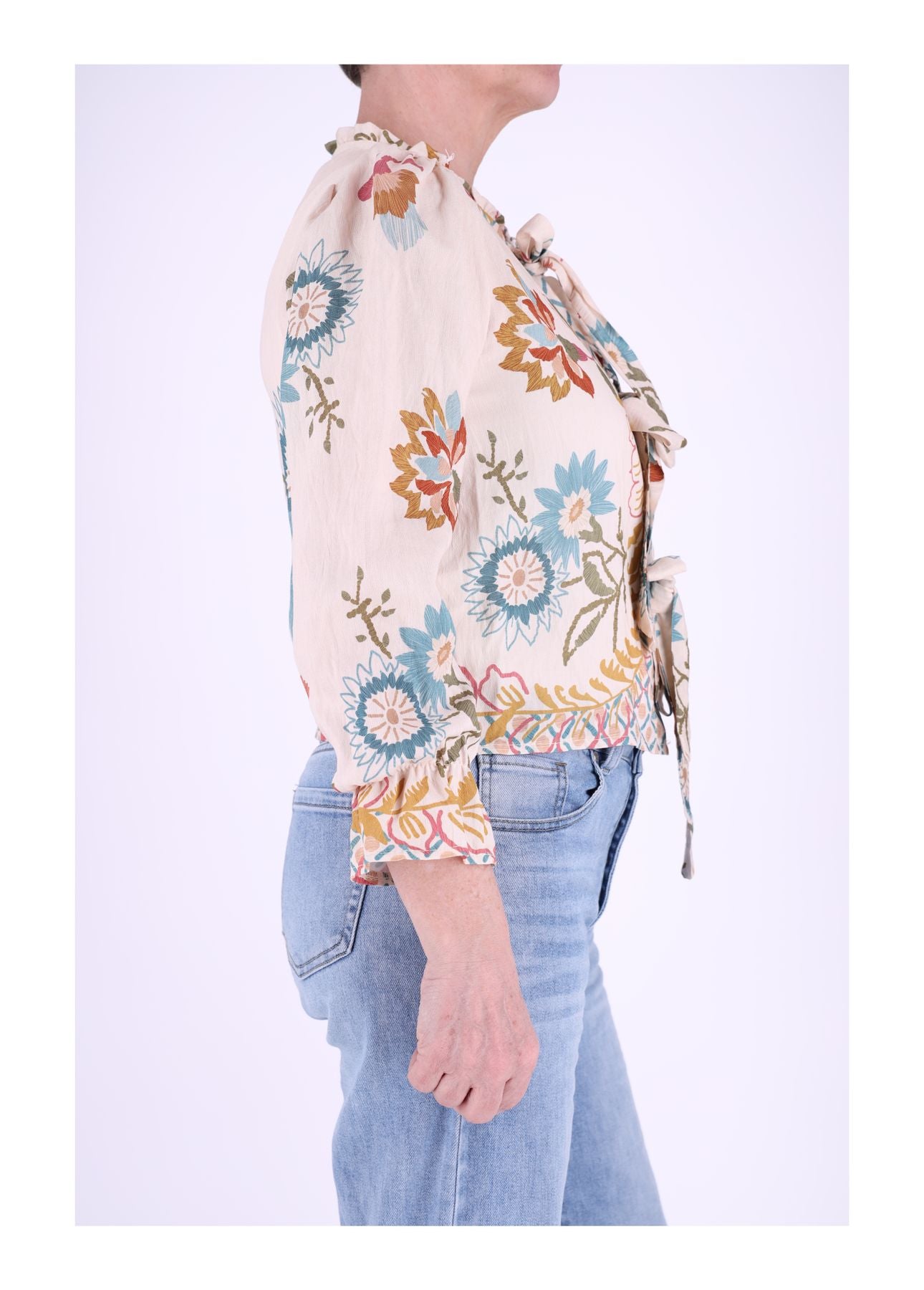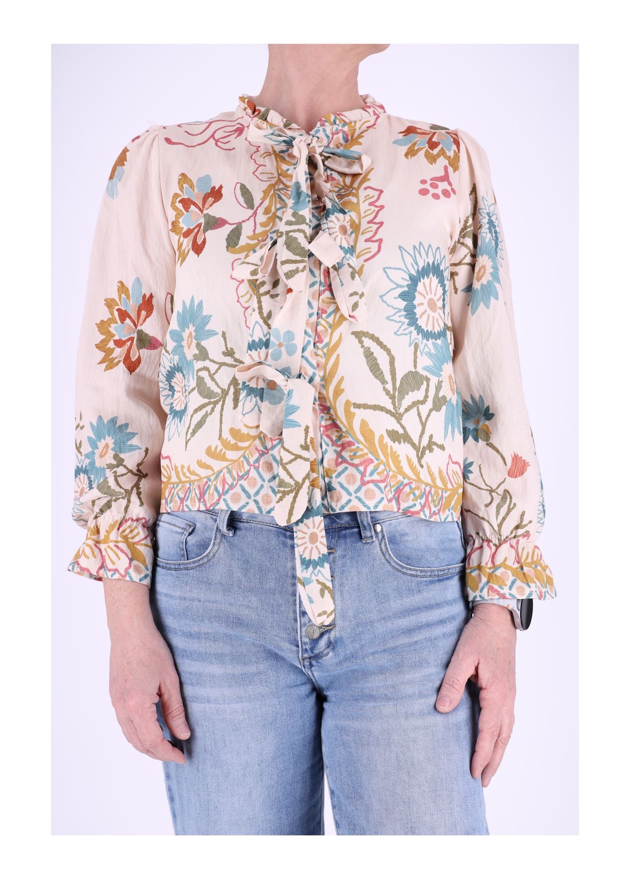 Diese leichte Blusenjacke vereint romantischen Stil mit einem Hauch von Lässigkeit. Das zarte Blümchenmuster verleiht ihr eine feminine Ausstrahlung, während die raffinierten Rüschen-Details am Kragen und an den Ärmeln für eine elegante Note sorgen.