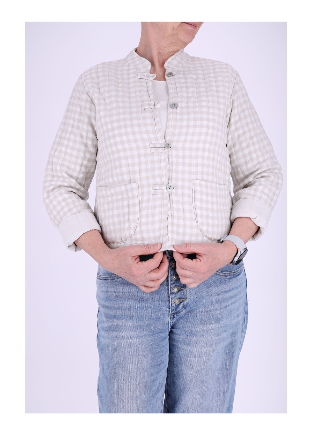 Diese stilvolle Damen Steppjacke überzeugt mit ihrem zeitlosen Karomuster und einem angenehmen Tragegefühl. Der Stehkragen schützt vor Wind und verleiht der Jacke eine elegante Note.