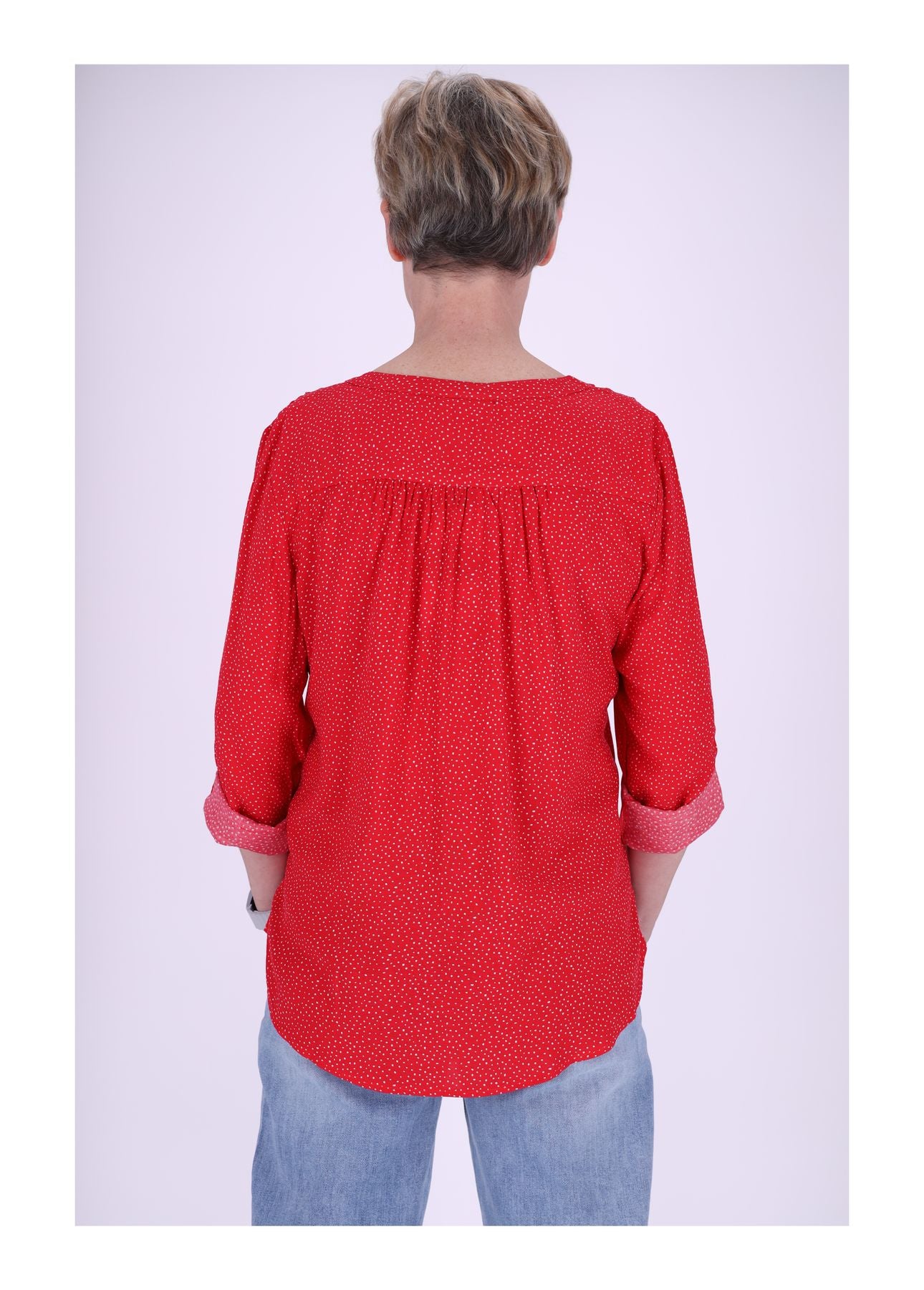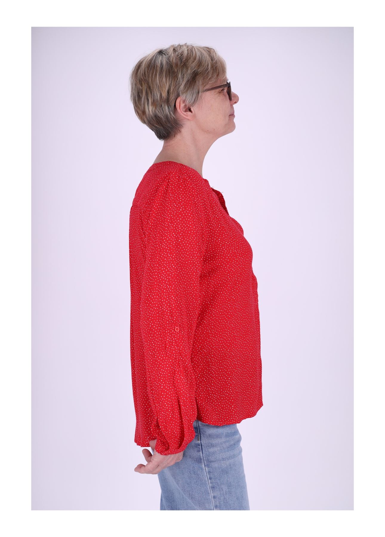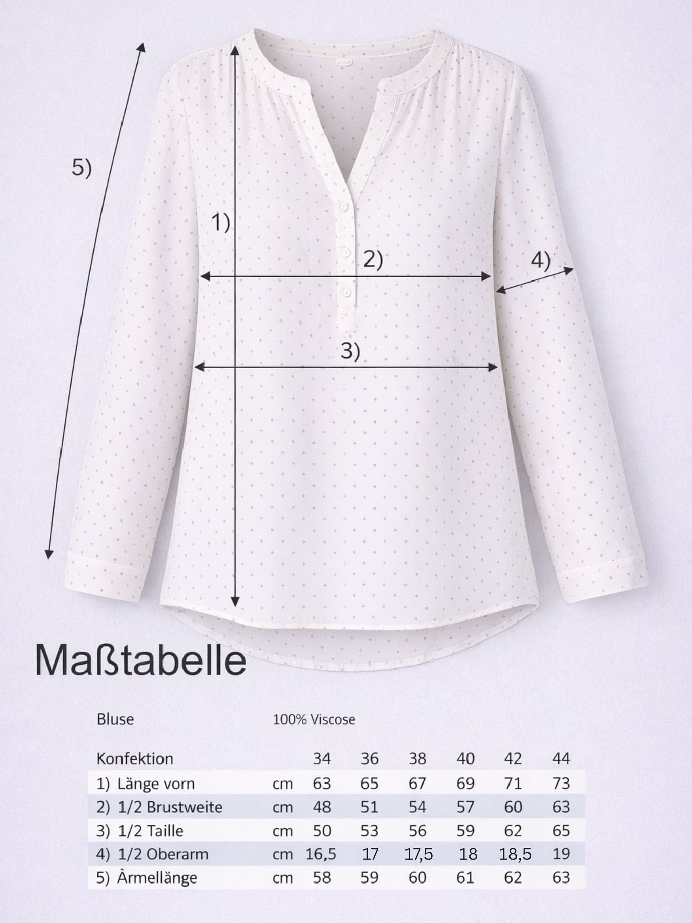 Der fröhliche Punkte-Print setzt verspielte Akzente, und der zarte Stoff aus 100 % Viskose sorgt für ein wunderbar leichtes Tragegefühl. Zudem ist dieses Blusenshirt nach dem OEKO-TEX® Standard 100 zertifiziert – schadstoffgeprüft, hautfreundlich und verantwortungsvoll gefertigt.