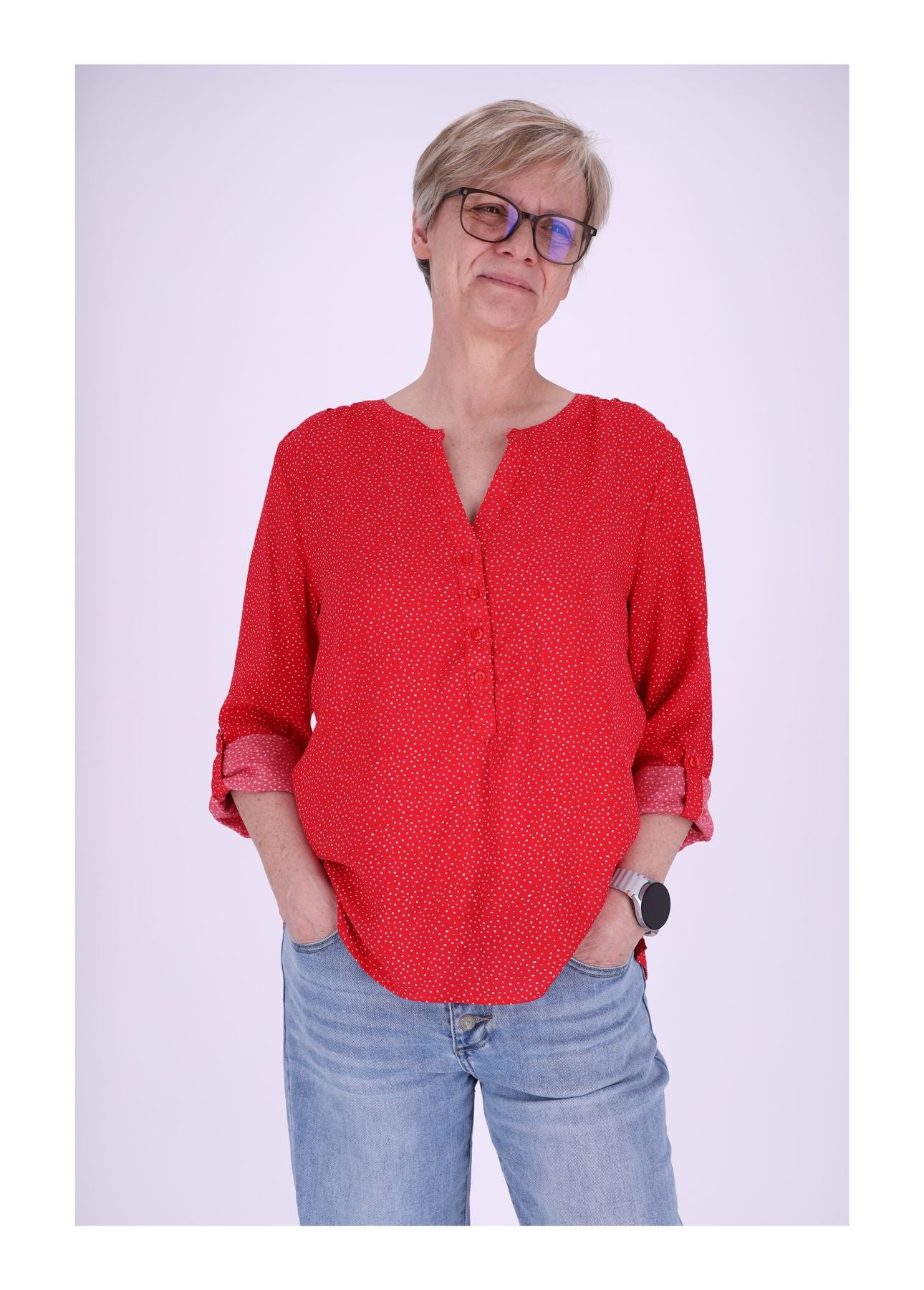 Größenausfall: Dieses Blusenshirt ist bequem geschnitten und kann durchaus eine Größe kleiner getragen werden. Auf den Fotos trage ich meine reguläre Konfektionsgröße 38, die Größe 36 würde mir in dieser Bluse auch gut passen. Wer es also etwas figurbetonter mag kann die kleinere Größe wählen, dann sind die Ärmel auch etwas kürzer.