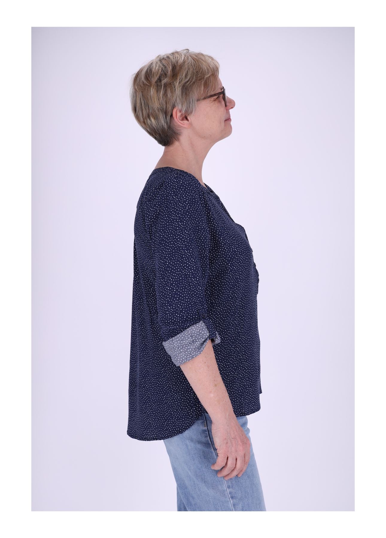 Mit vier verspielten Knöpfen am Ausschnitt und krempelbaren, fixierbaren Ärmeln bietet das Shirt unzählige Stylingmöglichkeiten – von casual bis chic. Die schmale Manschette formt eine feminine Silhouette, während der rund geschnittene Saum mit längerem Rückenteil und seitlichen Schlitzen für modernen Schwung sorgt.