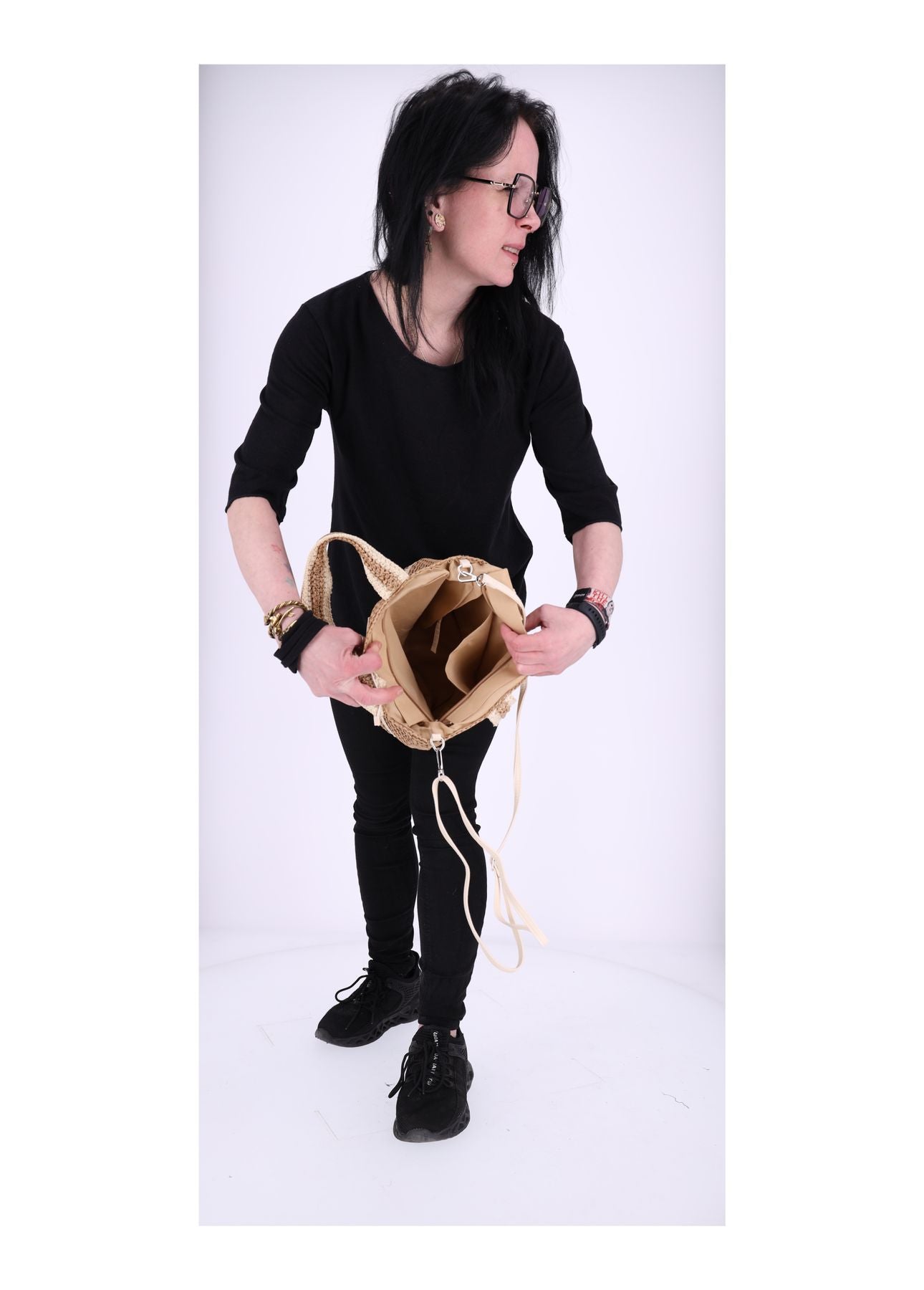 Diese elegante gestrickte Handtasche aus Bast vereint Natürlichkeit mit modernem Design. Die feine Strickoptik verleiht ihr eine besondere Struktur, während ihr wandelbares Design sowohl als Handtasche als auch als Schultertasche genutzt werden kann. Leicht, stilvoll und geräumig – perfekt für den Alltag oder besondere Anlässe.