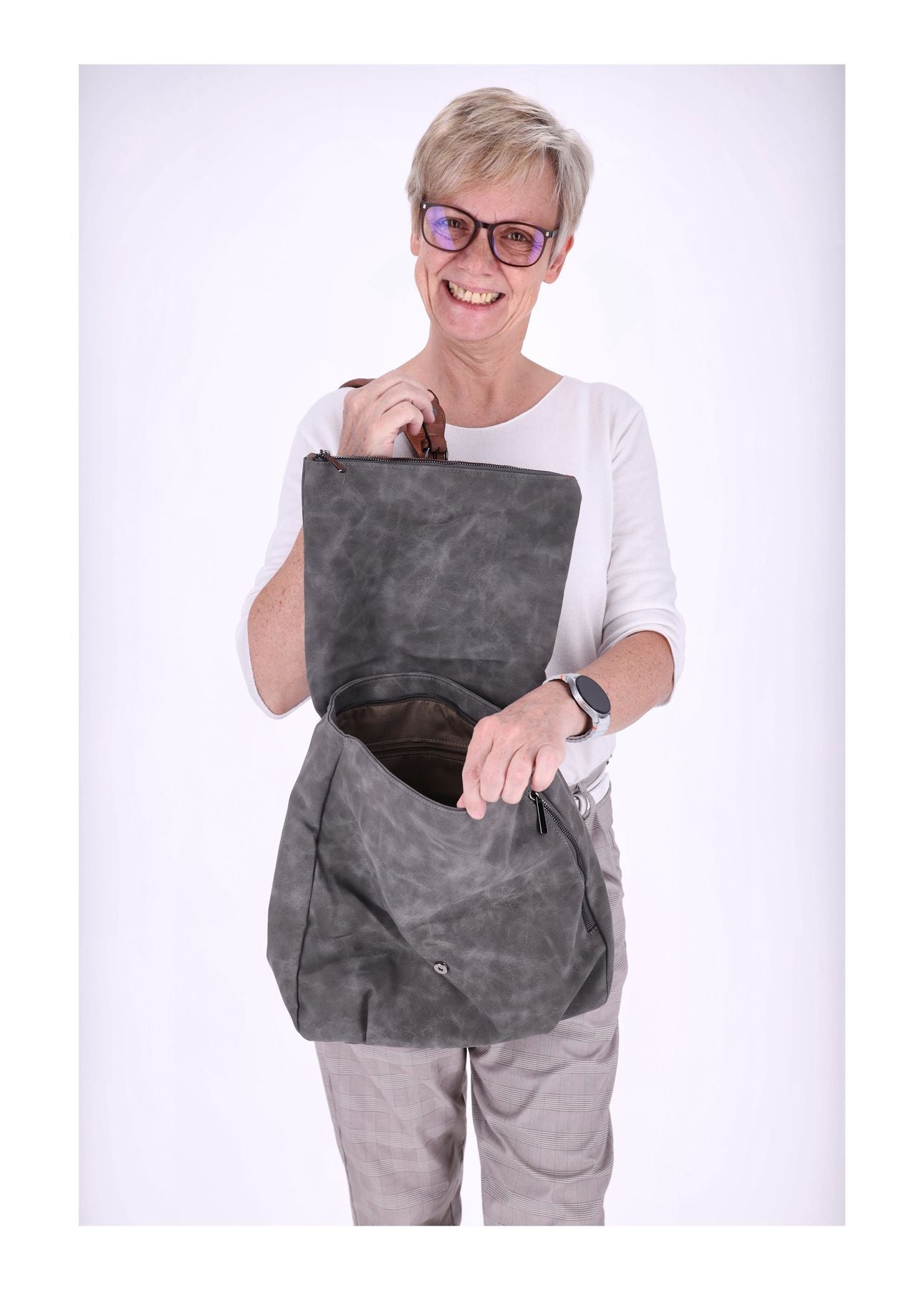 Im umklappenden Teil ebenfalls eine Reißverschlusstasche – clever versteckt und praktisch für kleine Essentials.