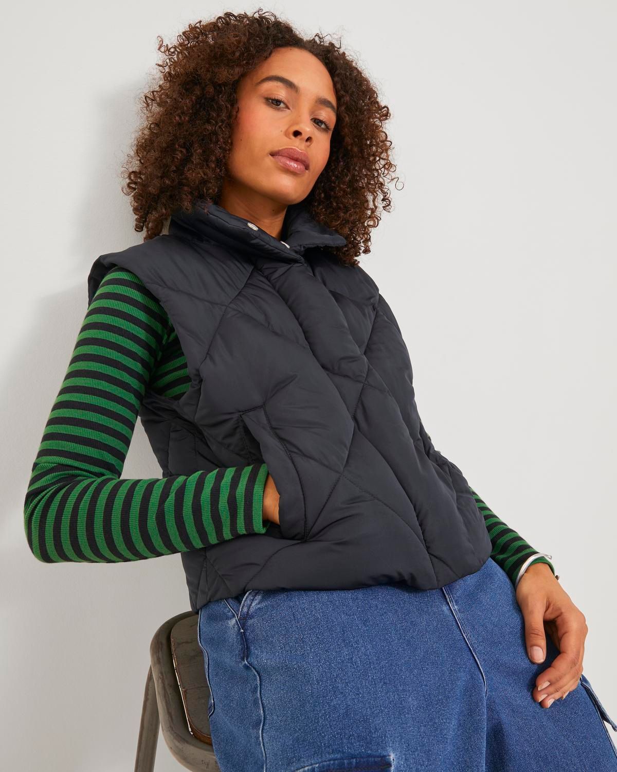 Bequeme Weste für jeden Tag.Gesteppter Stoff mit Stichmuster. - Produkttyp : Steppweste - Hals : Stehkragen - Ärmel : Ohne Ärmel - Verschluss : Durchgehender Reißverschluss