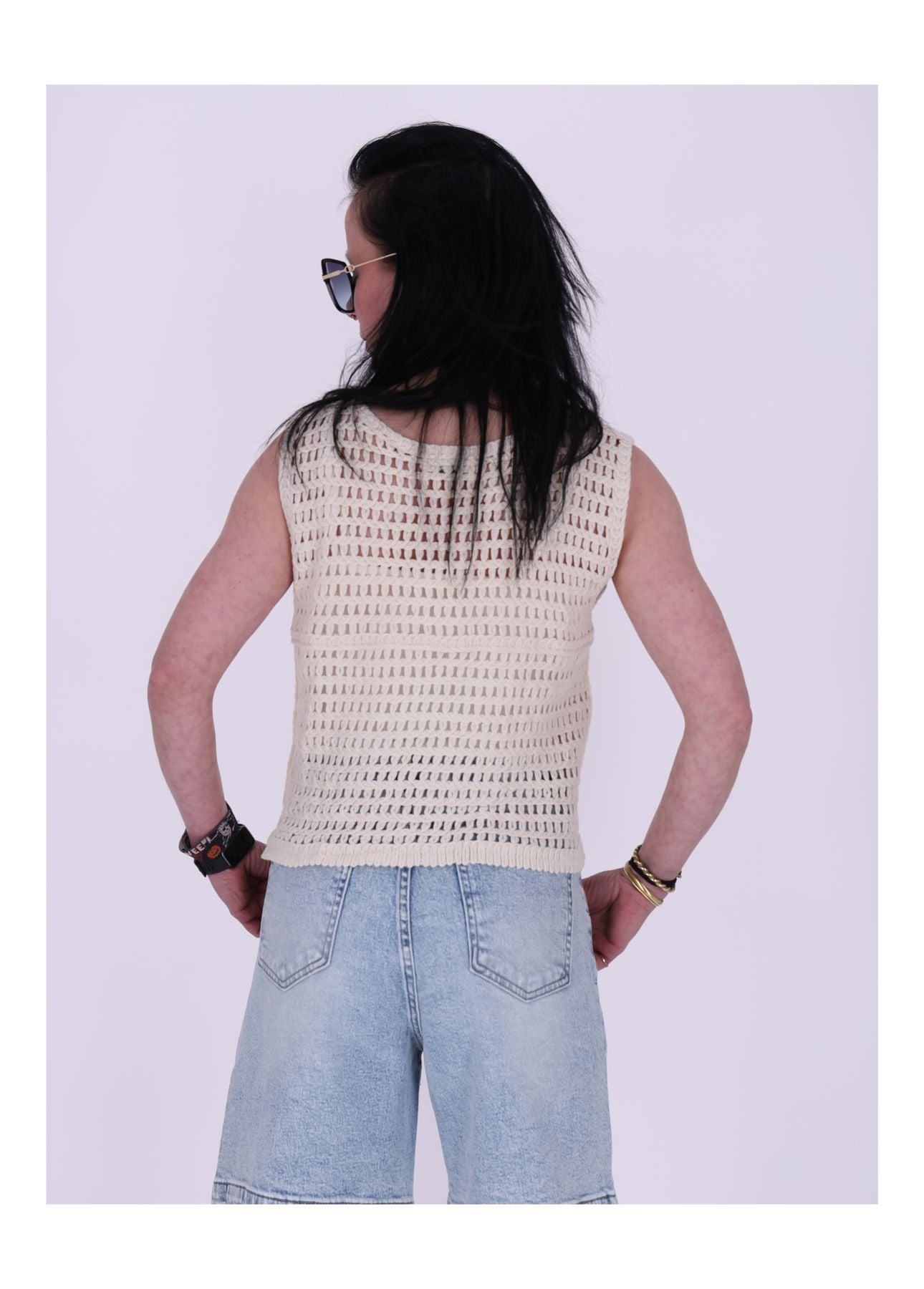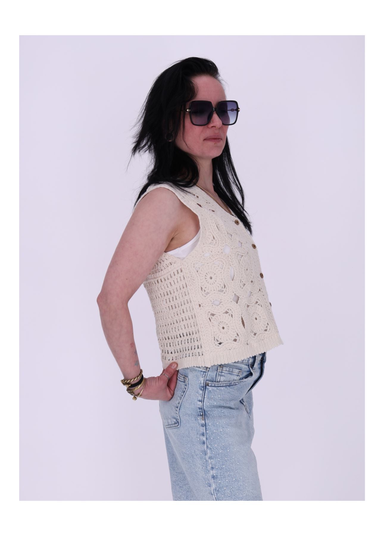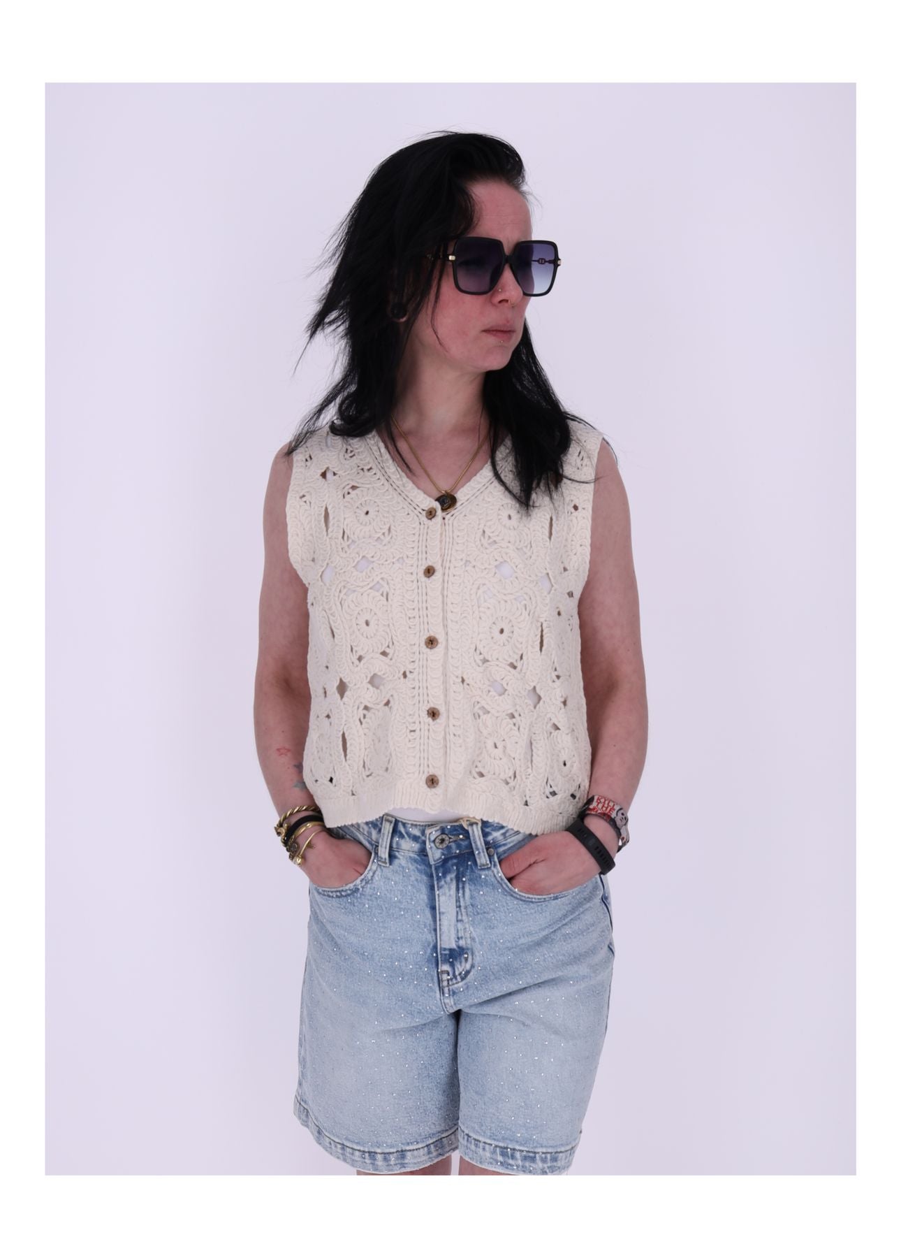 Mit einem 1/2 Brustumfang von 48 cm und einer Länge von 50 cm sitzt die Weste locker und luftig – ideal für warme Tage. Der ärmellose Schnitt und der leicht verlängerte Fall sorgen für eine fließende, schmeichelhafte Silhouette. Ob offen getragen oder mit Knöpfen geschlossen – diese Häkelweste verleiht jedem Outfit einen Hauch Boho-Charme.
