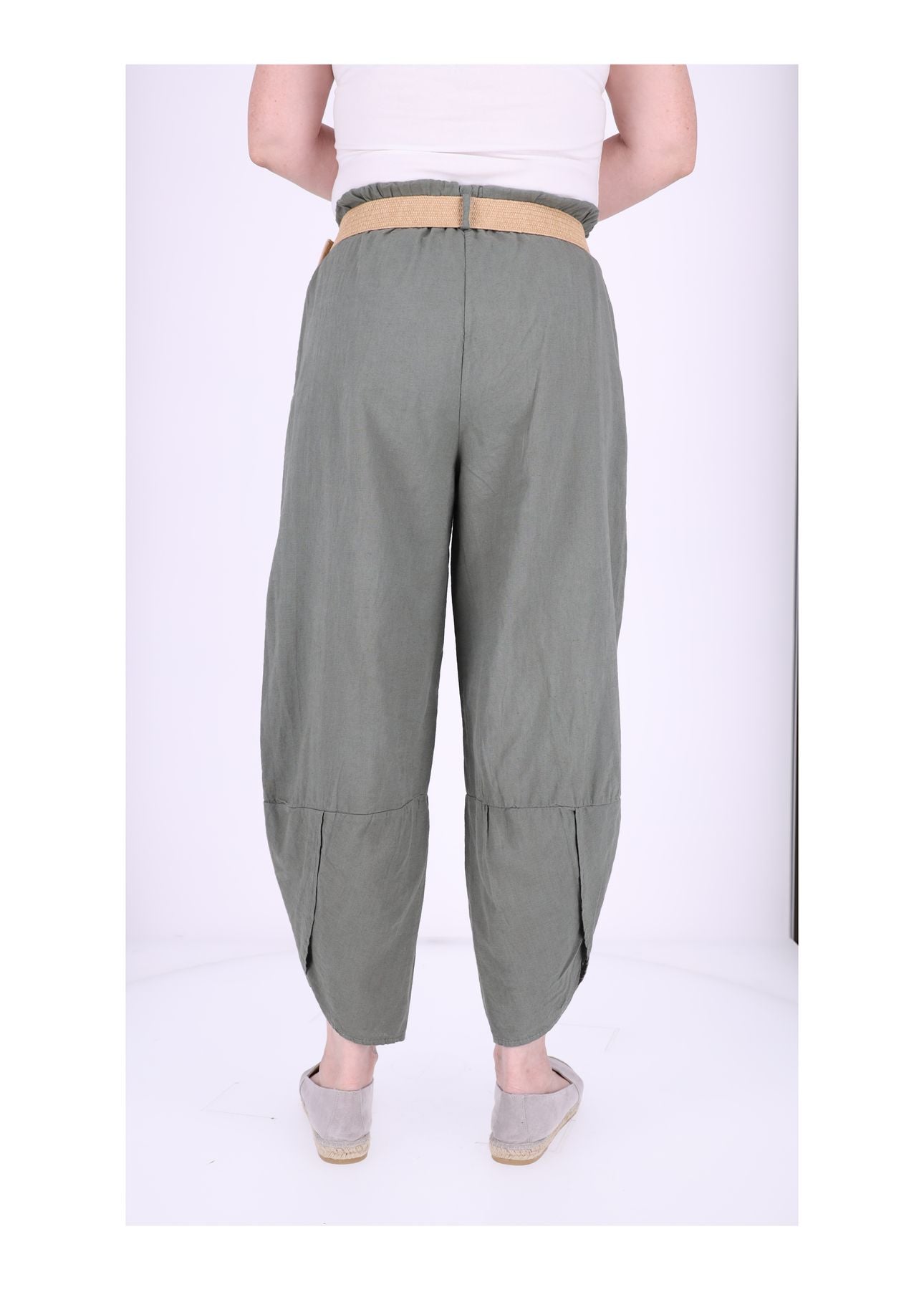 Ein echtes Highlight ist der elastische, geflochtene Gürtel, der der Hose einen charmanten, sommerlichen Akzent verleiht. Die großen, aufgesetzten Taschen vorn bringen nicht nur einen coolen Look, sondern auch praktischen Stauraum für deine Essentials. Ab der Wade überrascht die Hose mit einem raffinierten Einsatz, der sich nach hinten hin überlappt und dem Bein eine leichte Bewegung und einen besonderen Touch verleiht.
