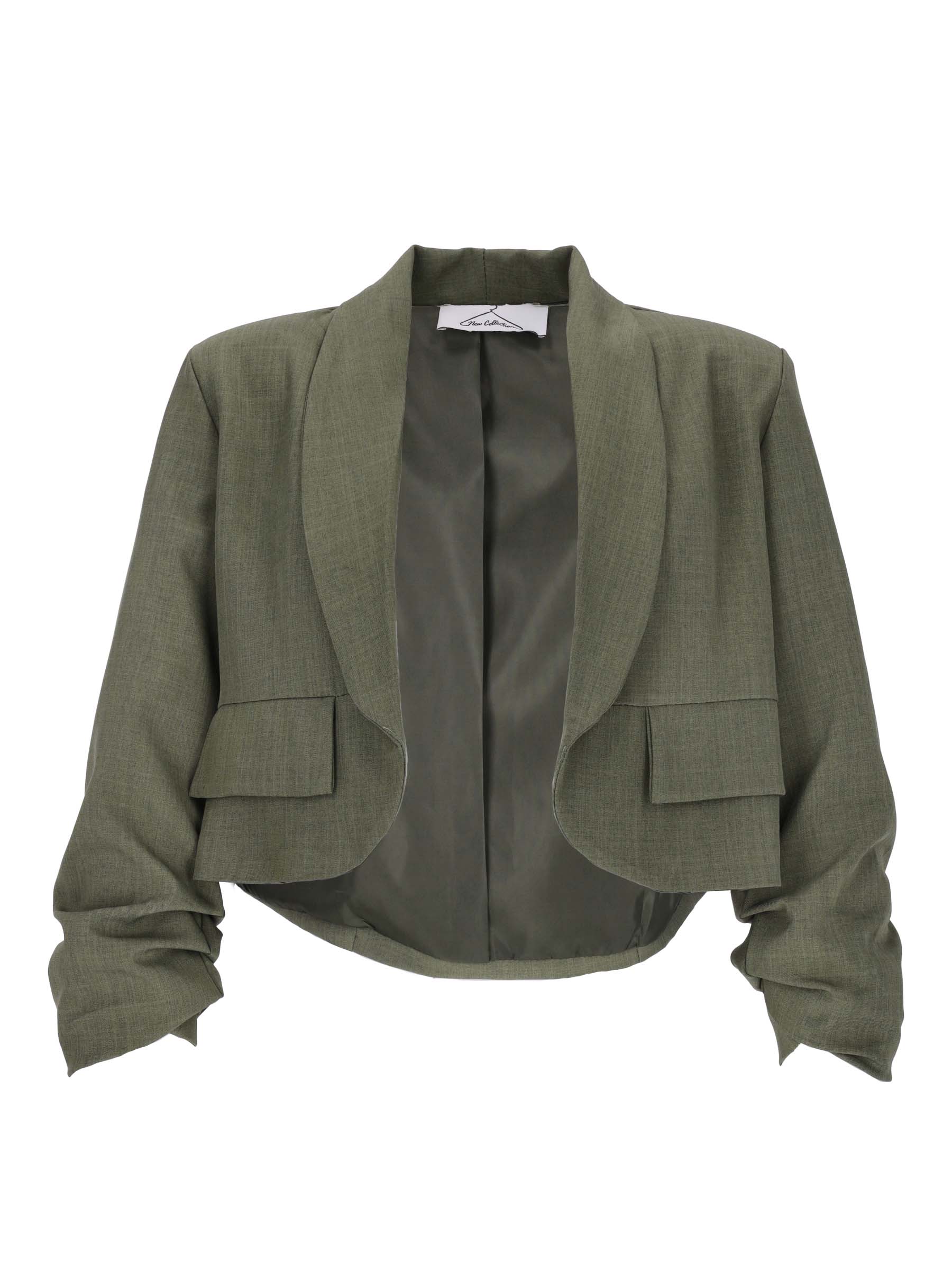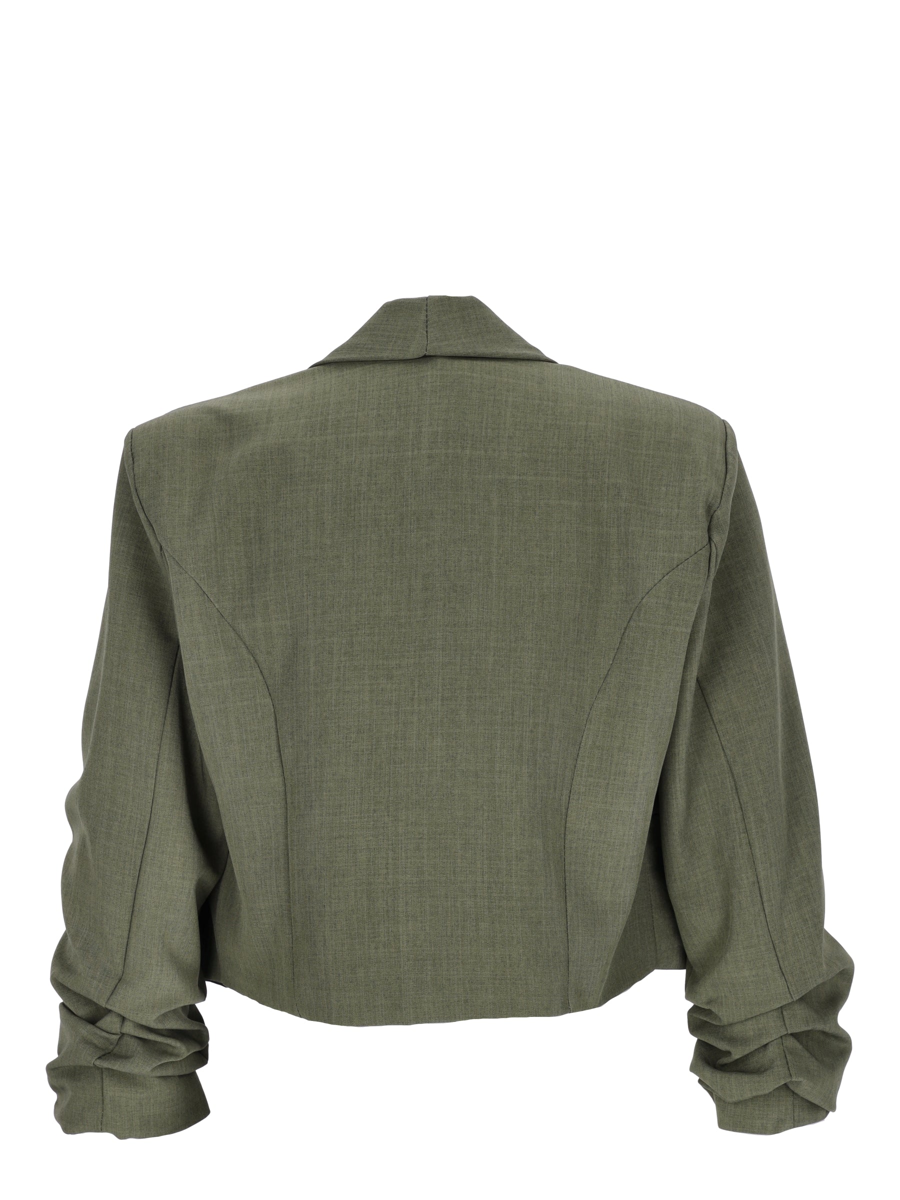 Der kurz geschnittene Stil dieses Blazers verleiht Ihrem Look eine moderne Note und betont Ihre Figur auf elegante Weise. Die Schulterpolster sorgen für eine markante Silhouette. Die angedeuteten Taschen verleihen diesem Blazer einen Hauch von Raffinesse und Funktionalität, während die gerafften Ärmel einen verspielten Akzent setzen und Ihrem Outfit das gewisse Etwas verleihen.