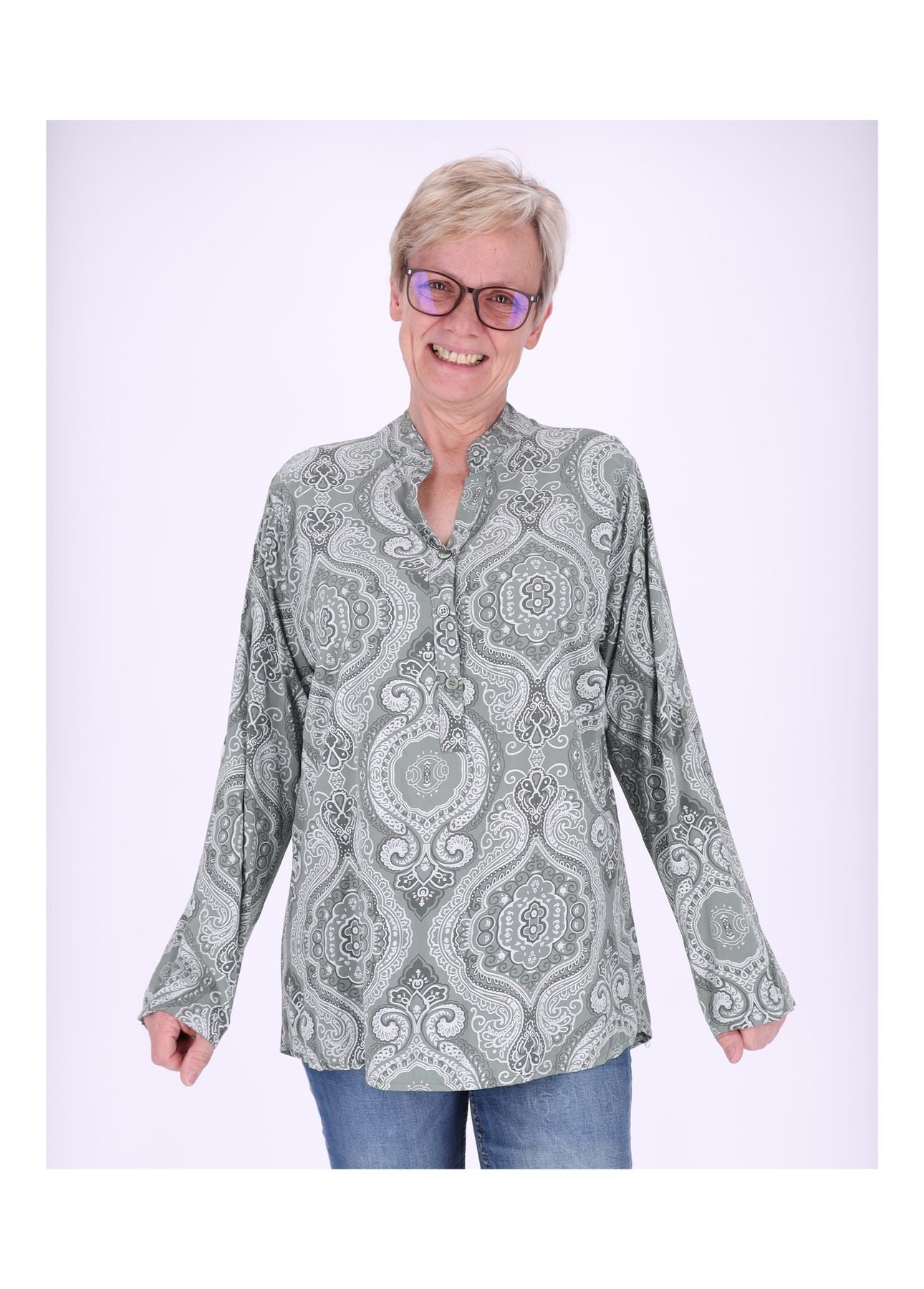 Dieses Damen-Blusenshirt ist der Inbegriff von lässiger Eleganz – unkompliziert, bequem und vielseitig kombinierbar. Der V-Ausschnitt mit dekorativer Knopfleiste verleiht dem Look eine feminine Note, während der lockere Schnitt für Bewegungsfreiheit und Komfort sorgt.