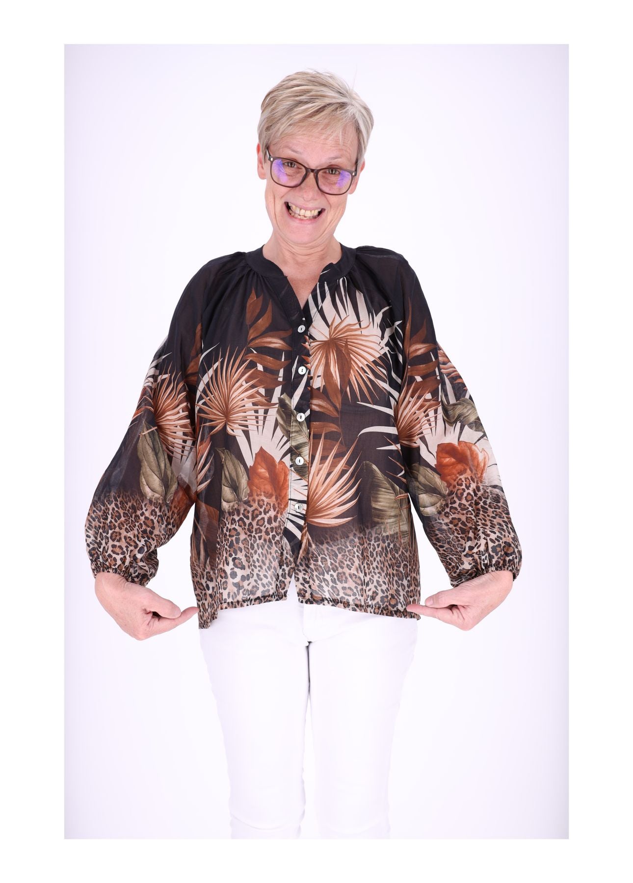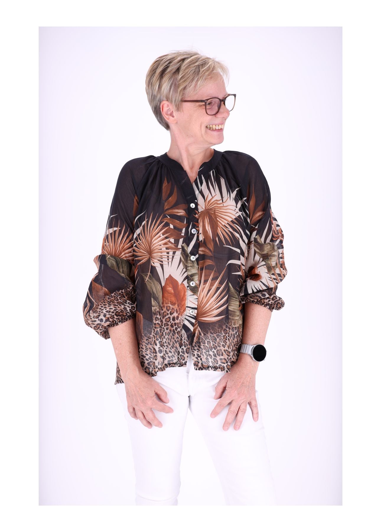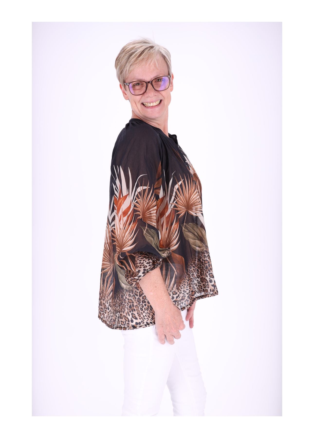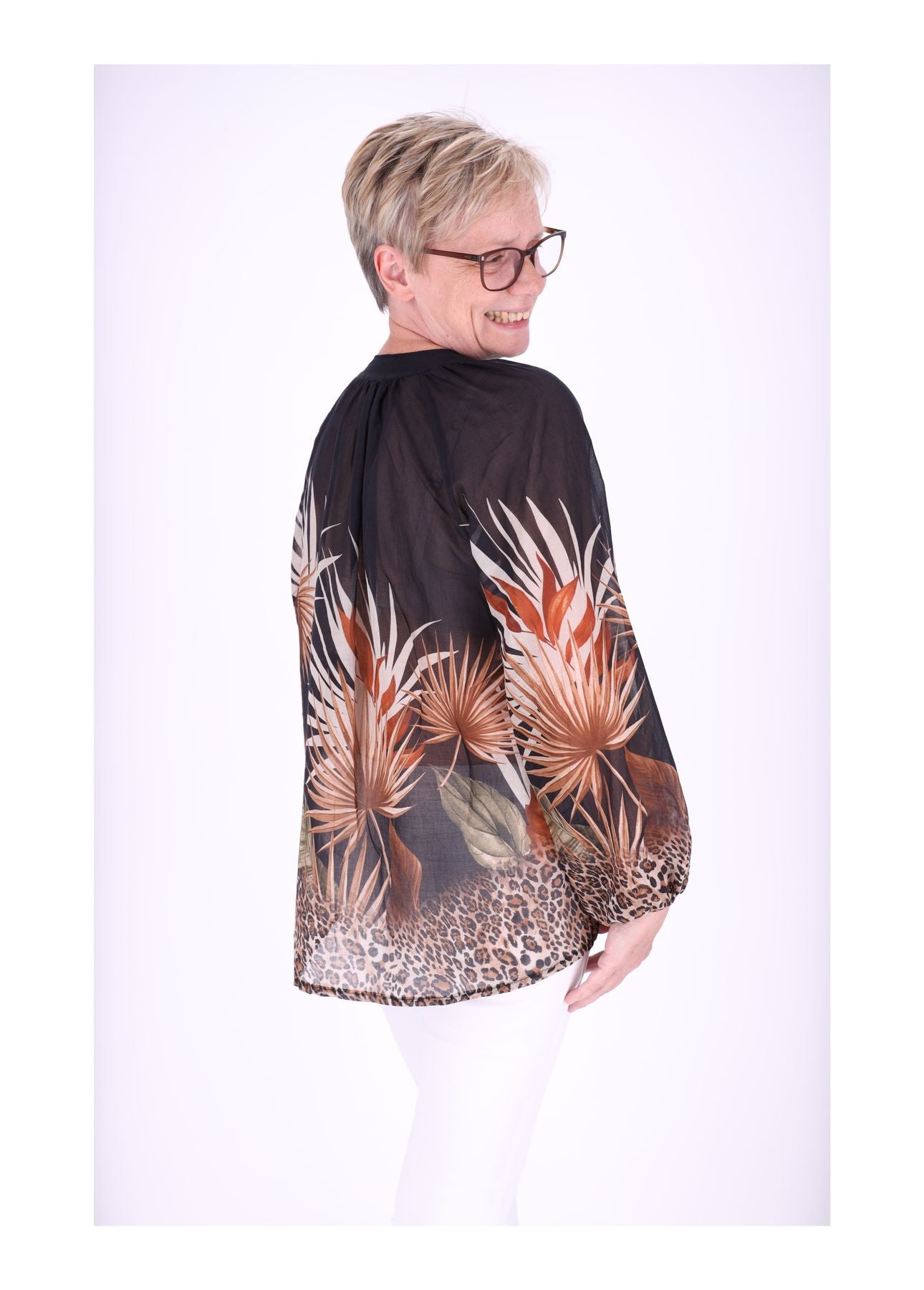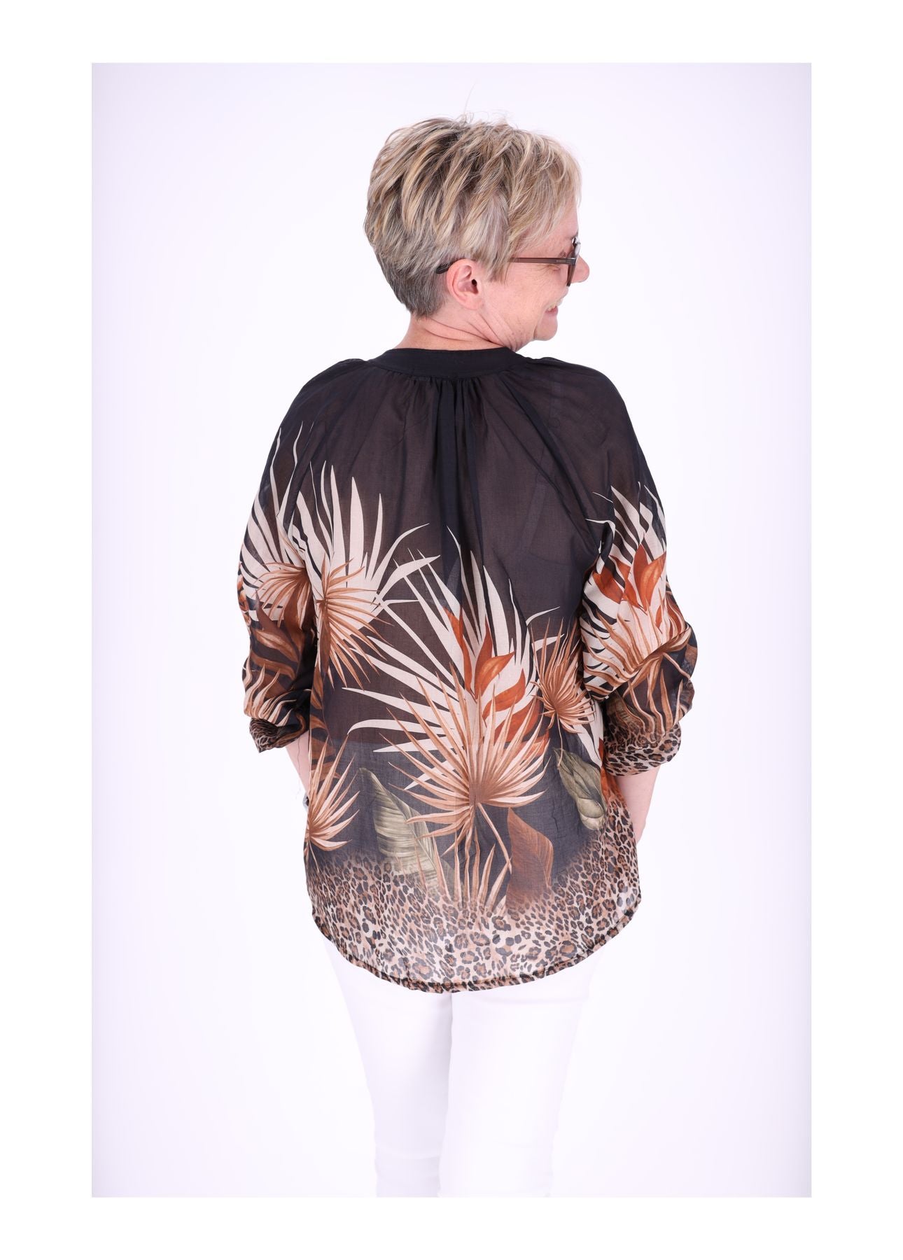 Damen Blusenshirt langarm mit Rundhals-V-Ausschnitt & Dschungel-Allover – bequem & trendig
