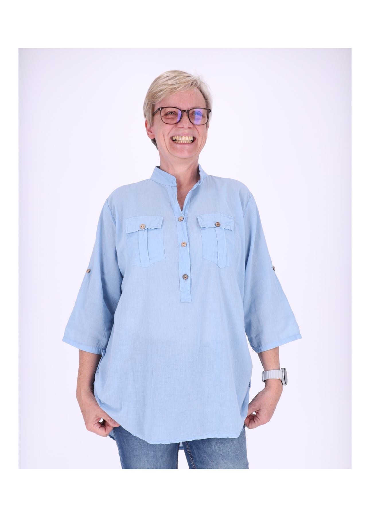 Das One-Size-Design (passt bequem Größen von ca. 38–44) umspielt die Figur locker, ohne aufzutragen. Die Ärmel lassen sich hochkrempeln – ideal, wenn es lässiger sein darf oder die Sonne rauskommt. Auch an den Seiten im Hüftbereich kannst du das Shirt nach Belieben hochknöpfen, um den Look zu variieren.