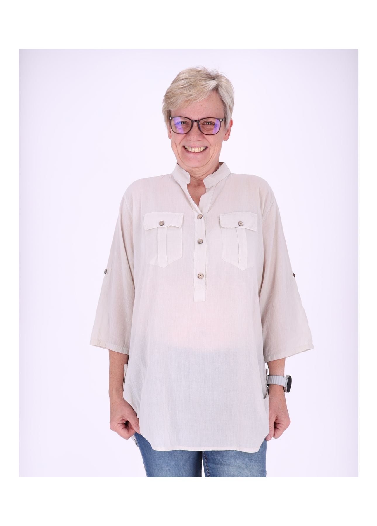 Das One-Size-Design (passt bequem Größen von ca. 38–44) umspielt die Figur locker, ohne aufzutragen. Die Ärmel lassen sich hochkrempeln – ideal, wenn es lässiger sein darf oder die Sonne rauskommt. Auch an den Seiten im Hüftbereich kannst du das Shirt nach Belieben hochknöpfen, um den Look zu variieren.