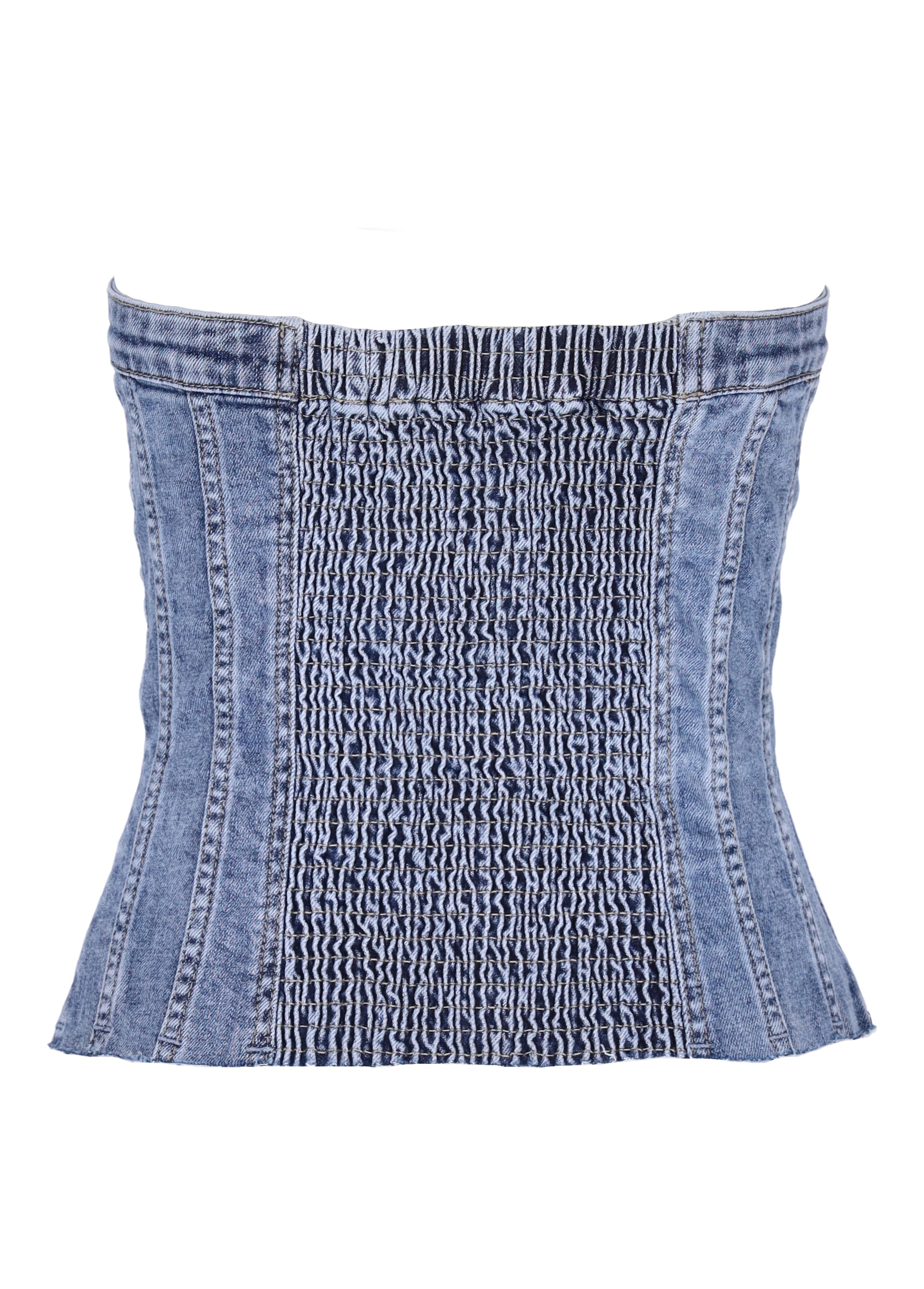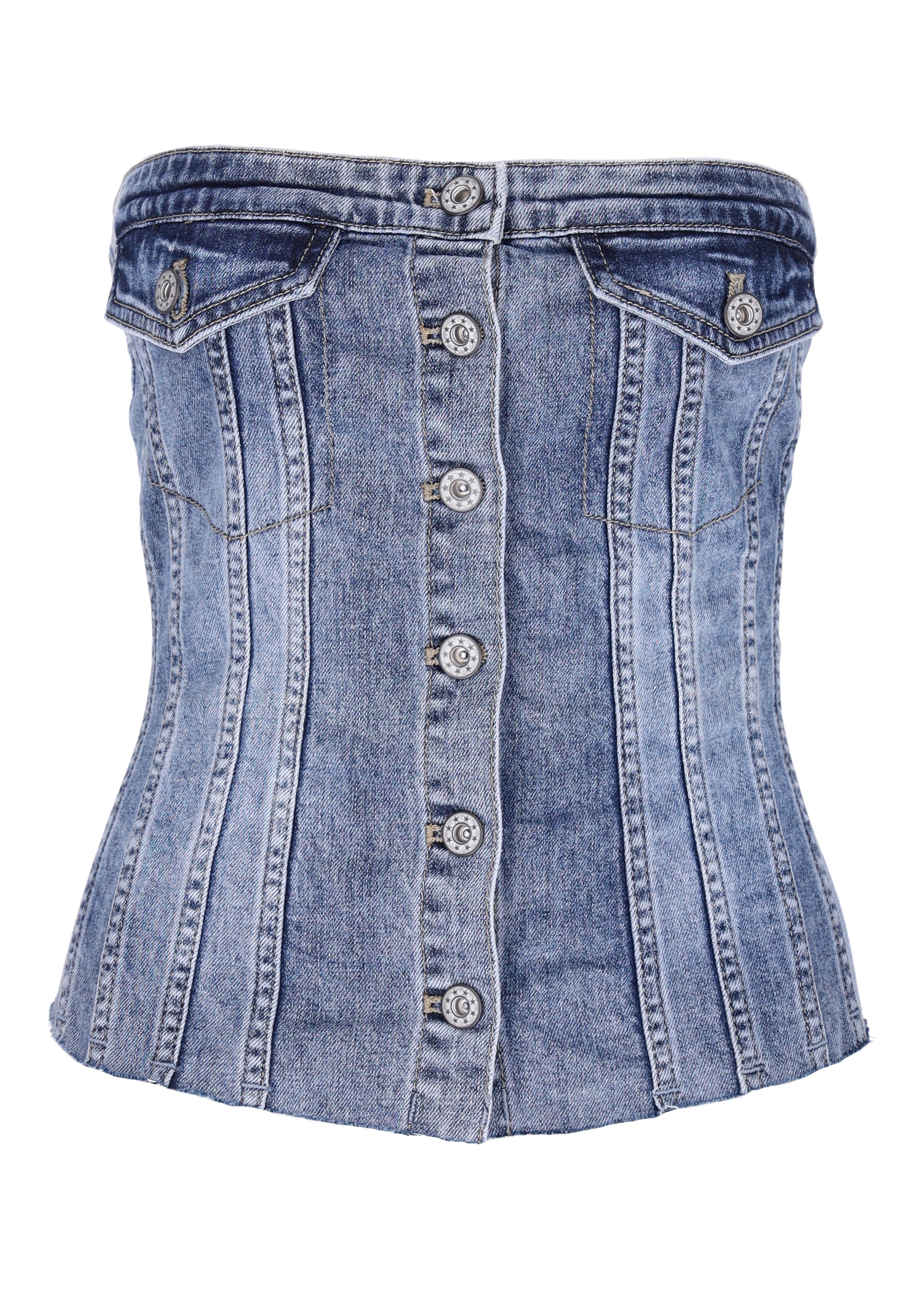 Tauchen Sie ein in lässige Eleganz und unverkennbaren Stil mit unserem trendigen trägerlosen Jeans-Bustier - ein unverzichtbares Must-have für Ihre Garderobe. Die durchgehende Knopfleiste verleiht diesem Bustier eine lässige Note und ermöglicht einfaches An- und Ausziehen. Der trägerlose Schnitt betont Ihre Schultern auf elegante Weise und verleiht Ihrem Look eine raffinierte Note. Dieses vielseitige Bustier ist die perfekte Wahl für verschiedene Anlässe. Tragen Sie es solo für einen lässigen Look oder kombinieren Sie es mit einer Jacke für einen trendigen Layering-Effekt.
