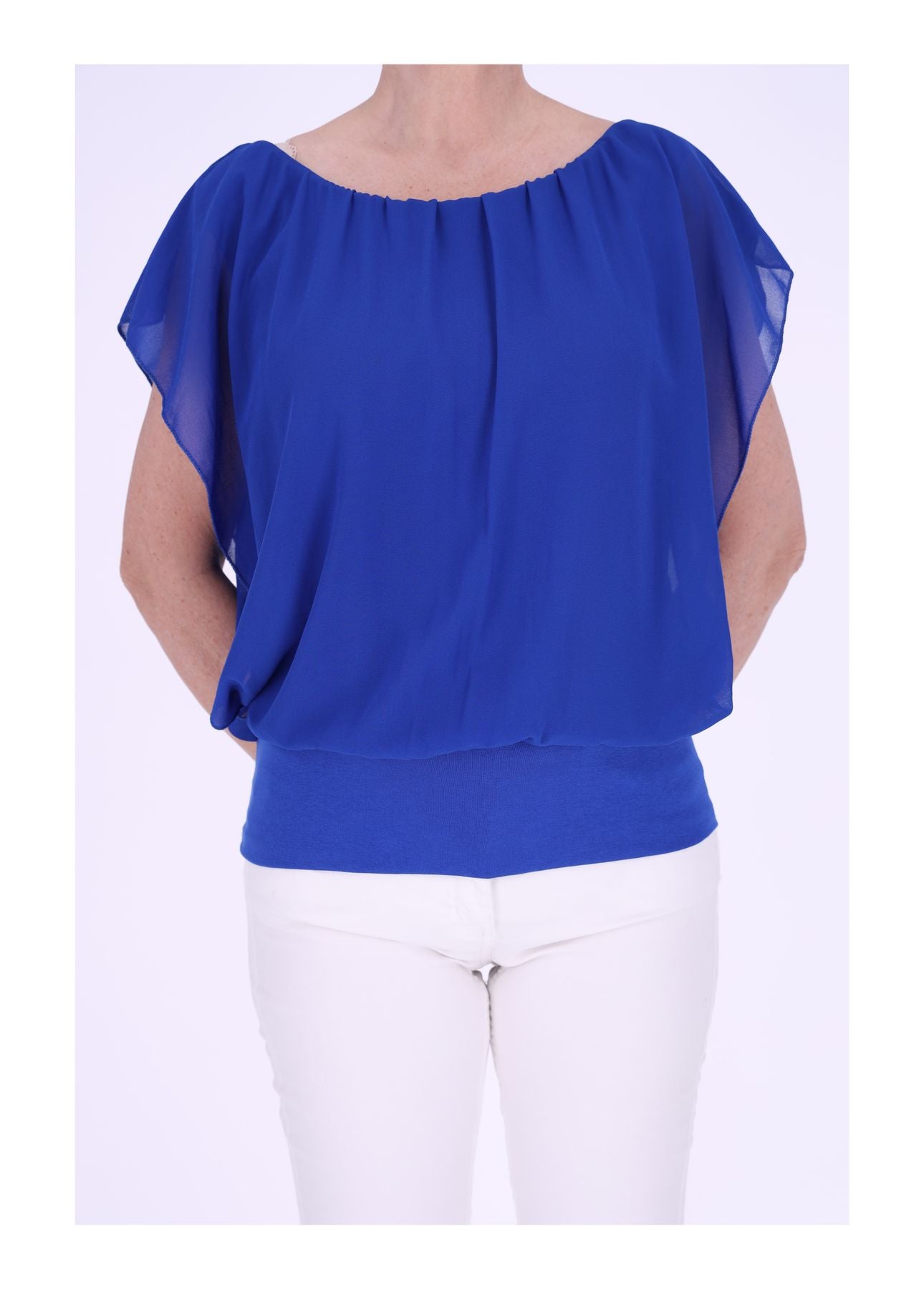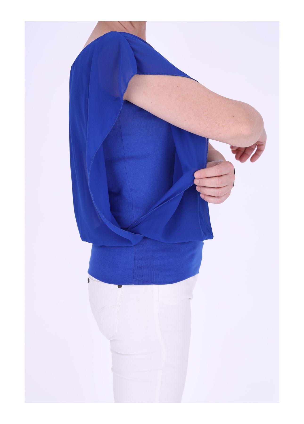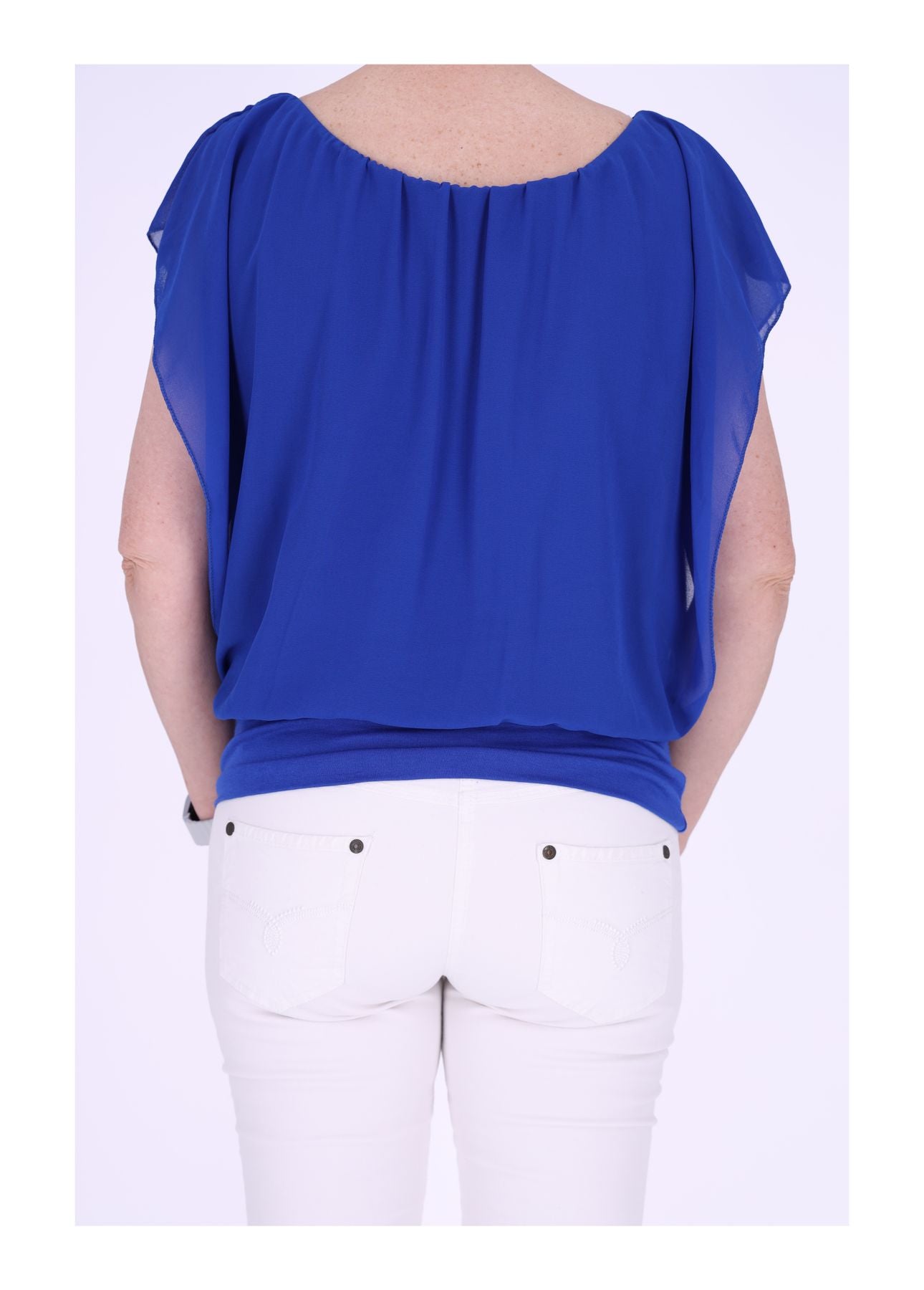 Dieses T-Shirt ist zweilagig und hat ein Obermaterial in eleganter Tülloptik, während das Untermaterial aus weichem Jersey besteht. Durch den Bund am unteren Saum fällt der Stoff des Shirts besonders luftig und locker. Der Kragen ist gerafft und verleiht dem T-Shirt einen besonderen Akzent. Das zweilagige Design sorgt dafür, dass das T-Shirt sehr bequem ist. Das untere Top ist enganliegend, wodurch das Shirt in jeder Situation blickdicht ist.