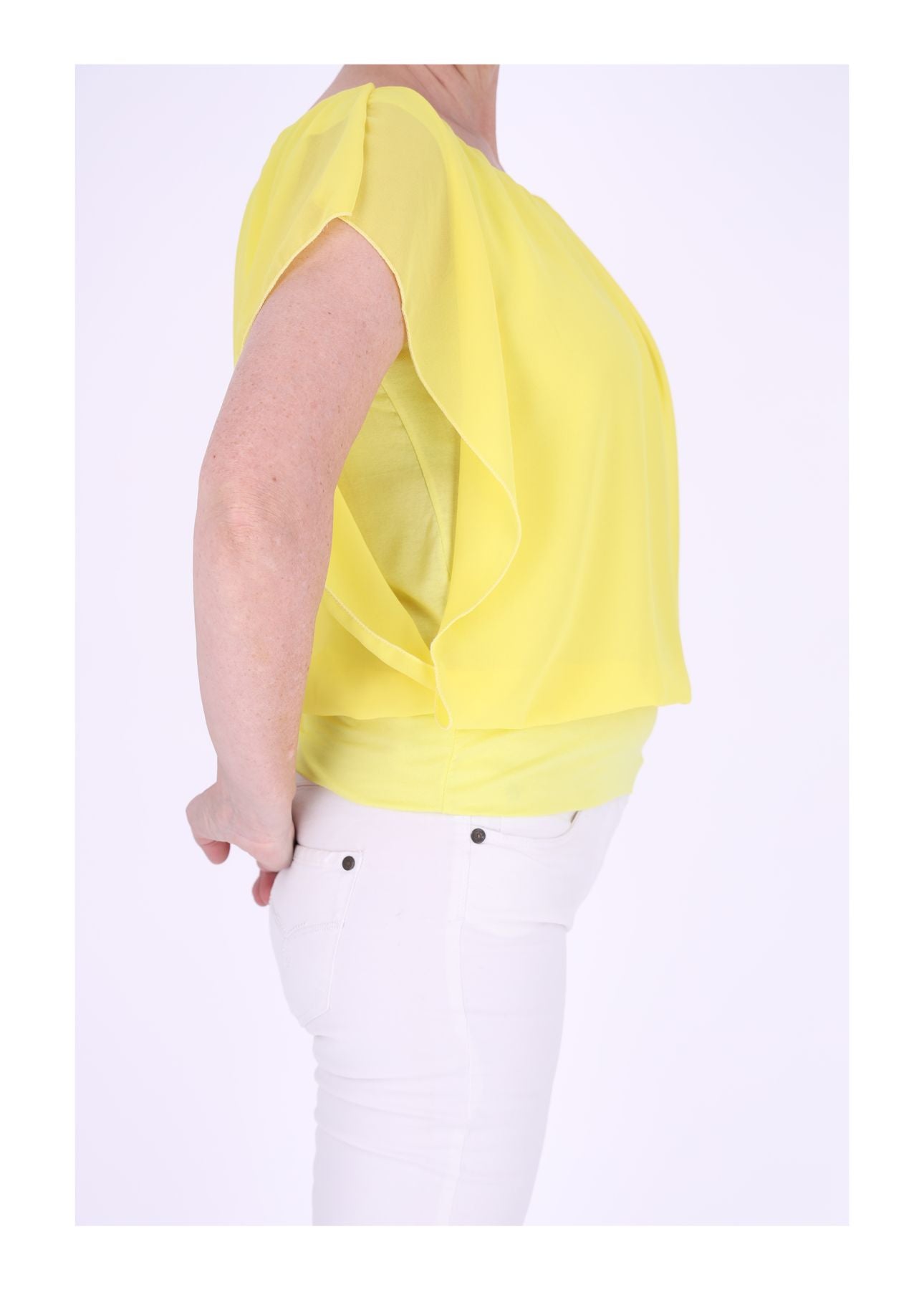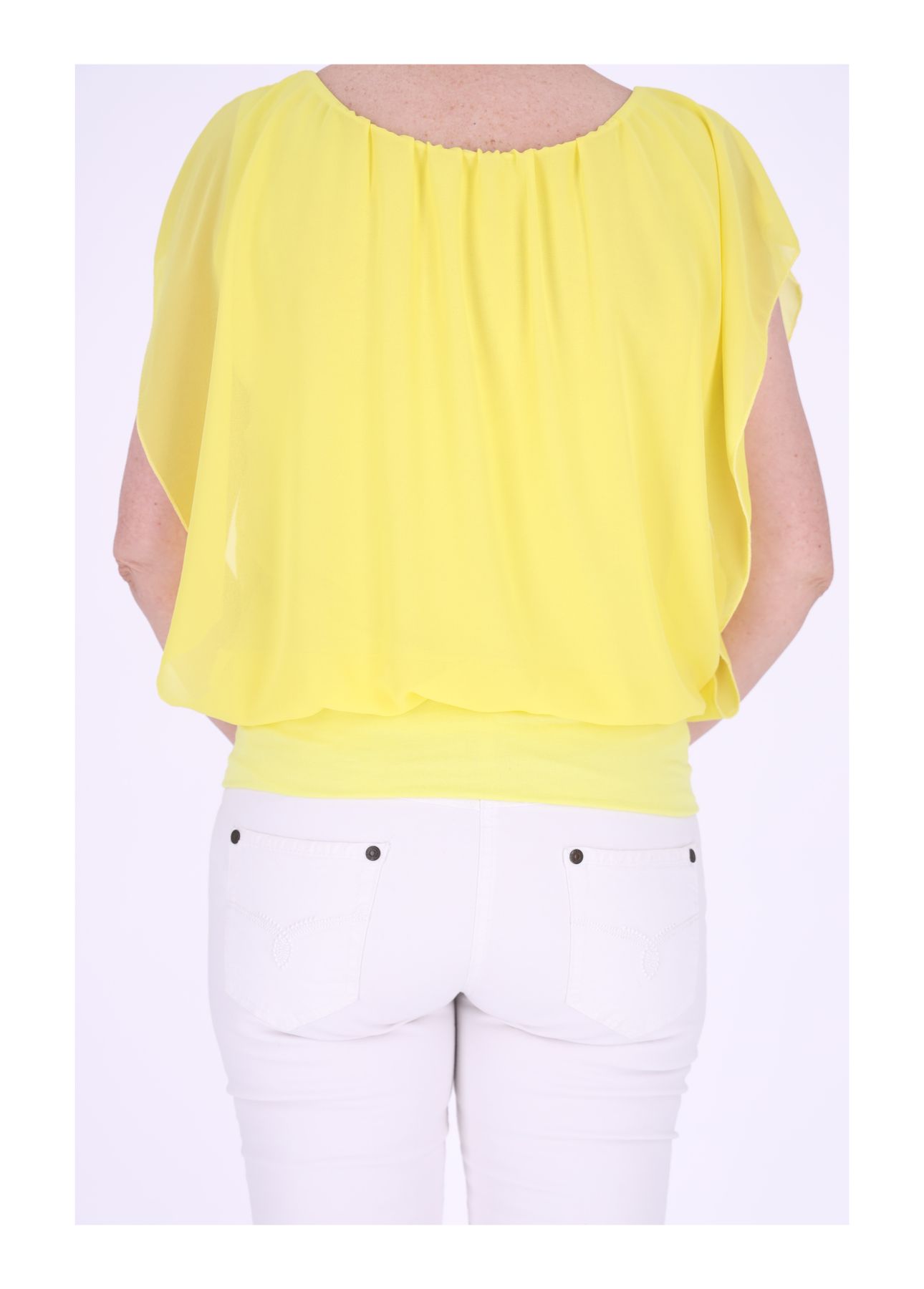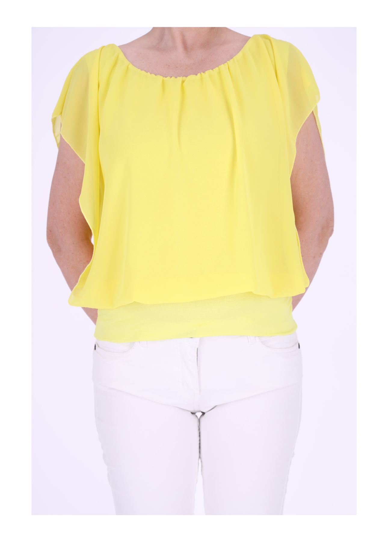 Dieses T-Shirt ist zweilagig und hat ein Obermaterial in eleganter Tülloptik, während das Untermaterial aus weichem Jersey besteht. Durch den Bund am unteren Saum fällt der Stoff des Shirts besonders luftig und locker. Der Kragen ist gerafft und verleiht dem T-Shirt einen besonderen Akzent. Das zweilagige Design sorgt dafür, dass das T-Shirt sehr bequem ist. Das untere Top ist enganliegend, wodurch das Shirt in jeder Situation blickdicht ist.