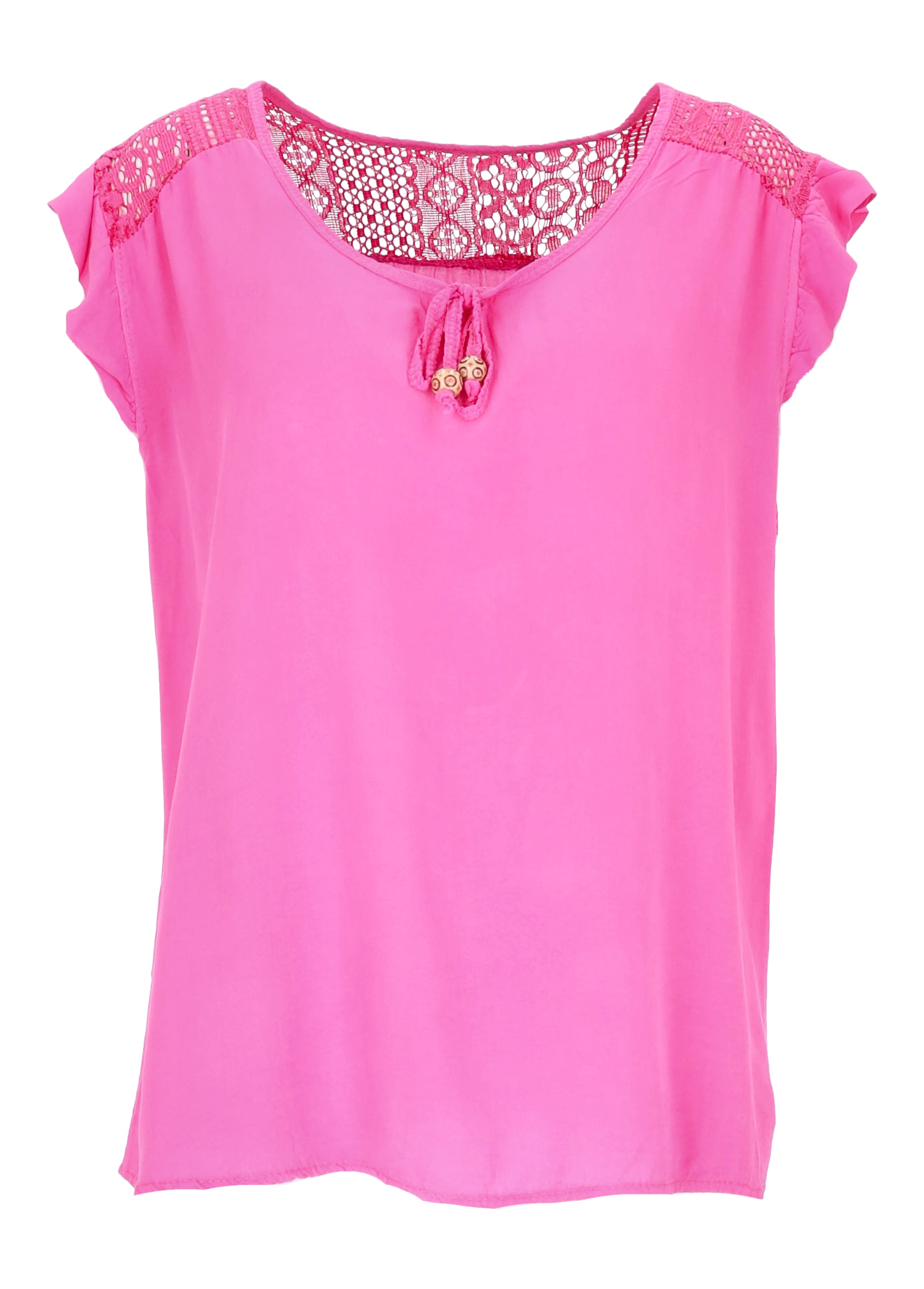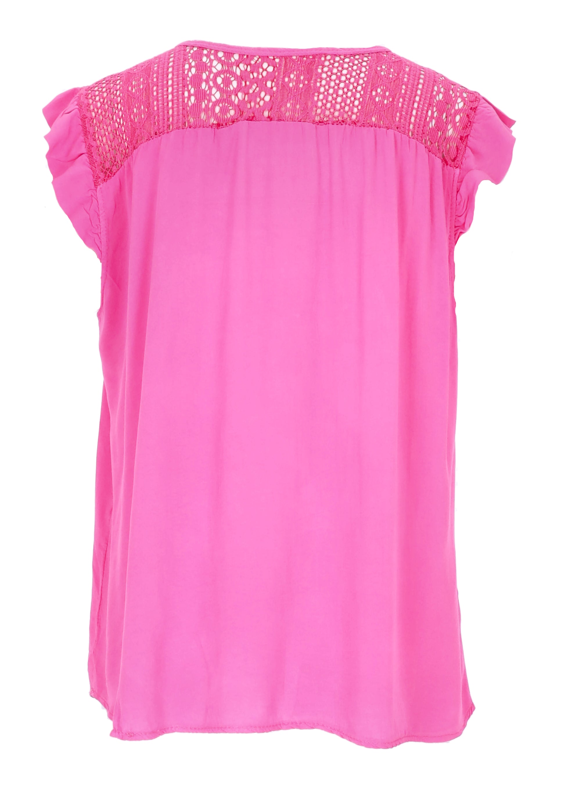 Der Spitzeneinsatz verleiht diesem Top eine zarte und feminine Note, während das Detail vorne zum Binden eine verspielte Akzentuierung ermöglicht. Die kurzen Volantärmel verleihen diesem Top eine luftige Leichtigkeit und einen Hauch von Vintage-Charme. Dieses Top ist die perfekte Wahl für verschiedene Anlässe, ob für einen entspannten Tag im Park oder einen romantischen Abend zu zweit. Kombinieren Sie es mit Jeans für einen lässigen Look oder einer schicken Hose für einen eleganten Auftritt.