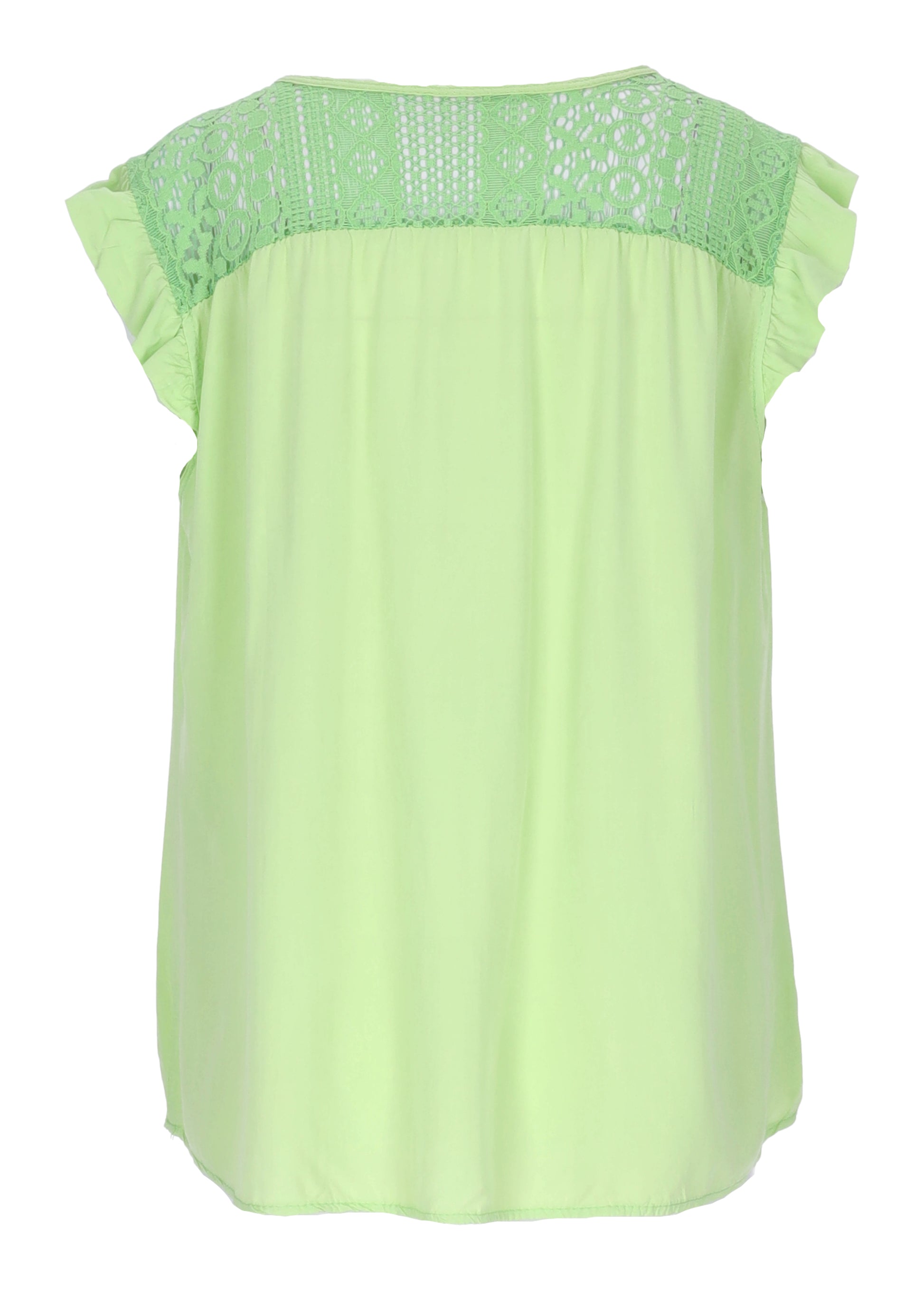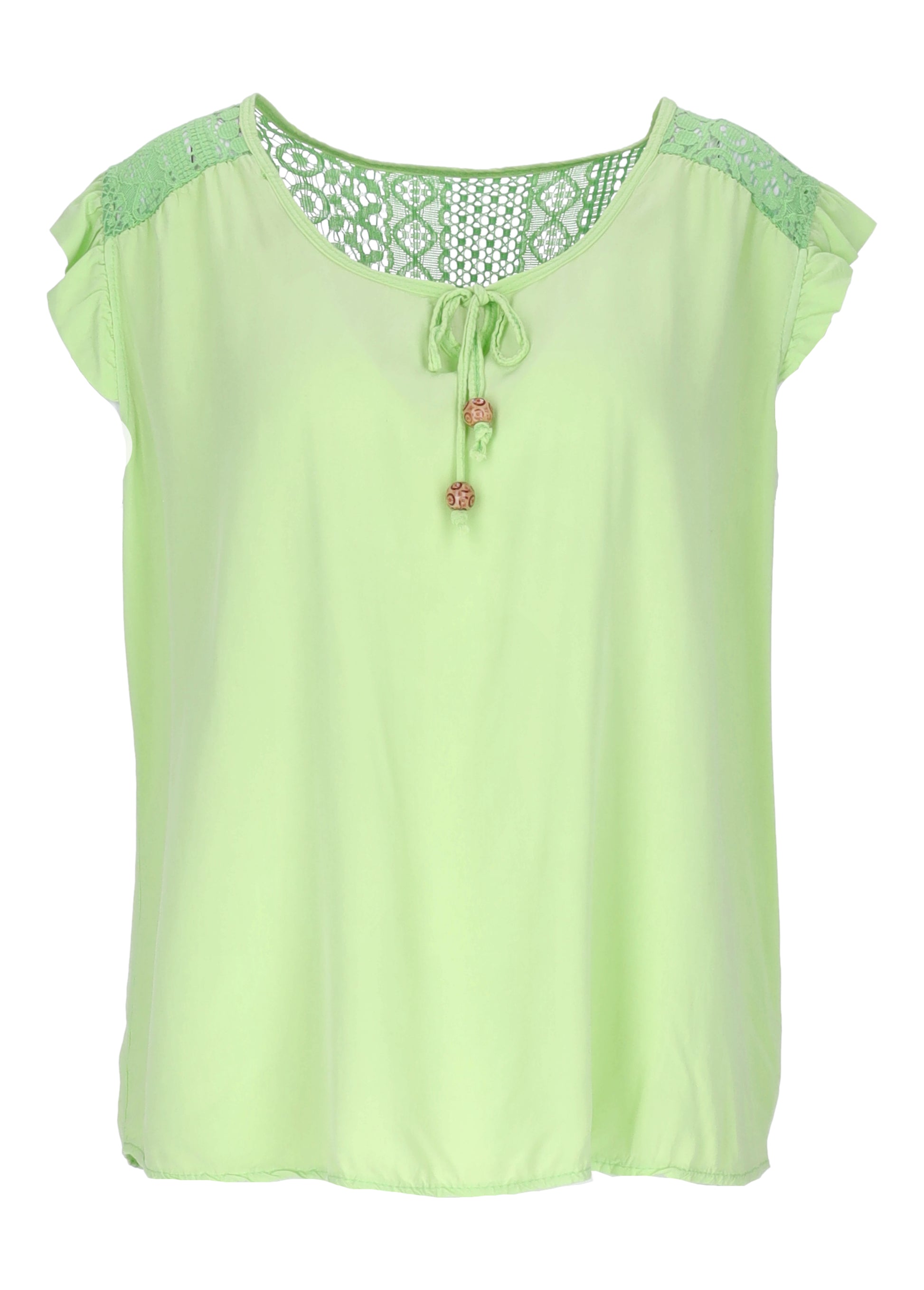 Der Spitzeneinsatz verleiht diesem Top eine zarte und feminine Note, während das Detail vorne zum Binden eine verspielte Akzentuierung ermöglicht. Die kurzen Volantärmel verleihen diesem Top eine luftige Leichtigkeit und einen Hauch von Vintage-Charme. Dieses Top ist die perfekte Wahl für verschiedene Anlässe, ob für einen entspannten Tag im Park oder einen romantischen Abend zu zweit. Kombinieren Sie es mit Jeans für einen lässigen Look oder einer schicken Hose für einen eleganten Auftritt.