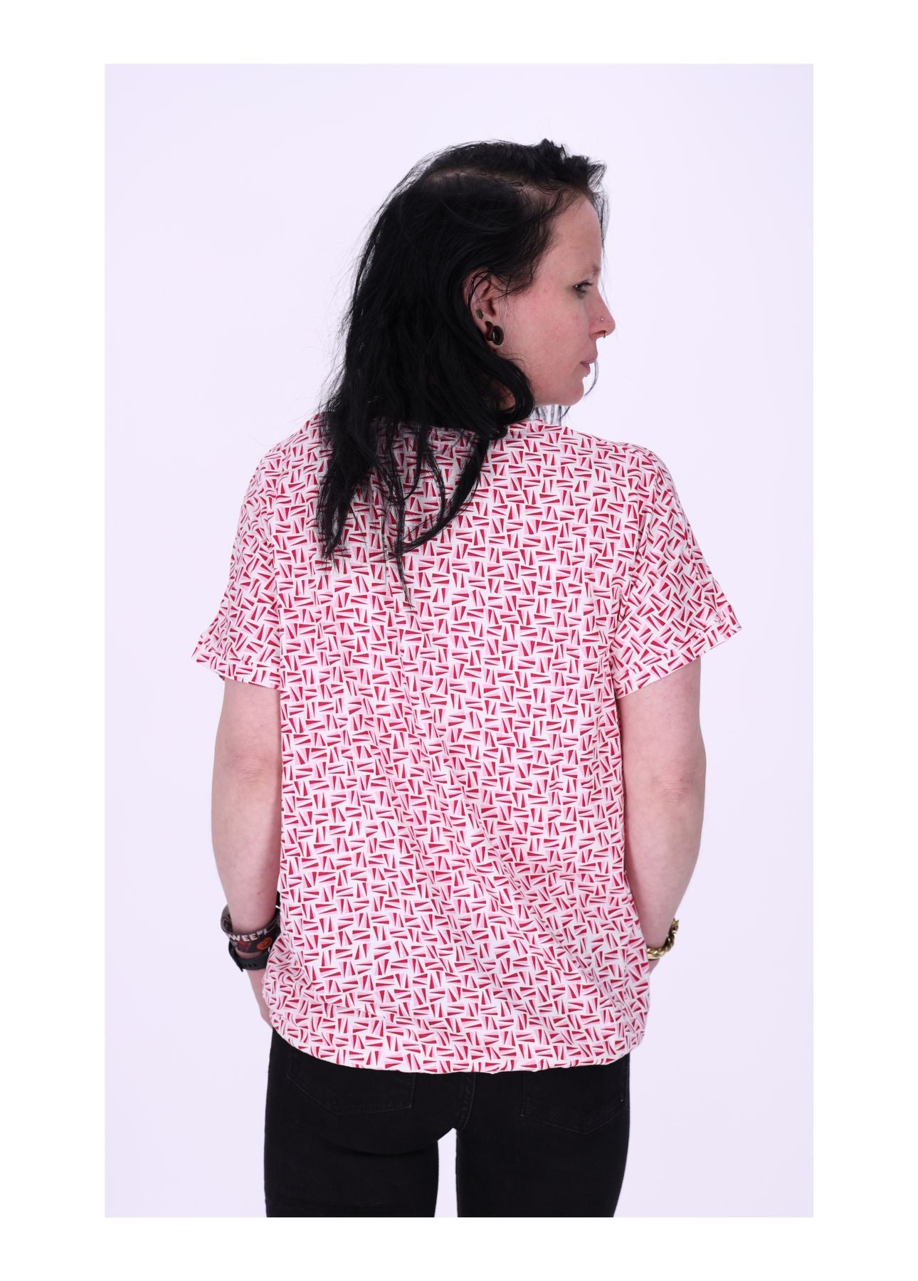 Dieses modisch gemusterte Damen T-Shirt begeistert mit einem geometrischen Allover-Print, der jedem Outfit eine stilvolle, moderne Note verleiht. Der weich fallende Stoff schmiegt sich angenehm an die Haut und sorgt für ein komfortables Tragegefühl – ideal für den Alltag, den Urlaub oder den City-Bummel.
