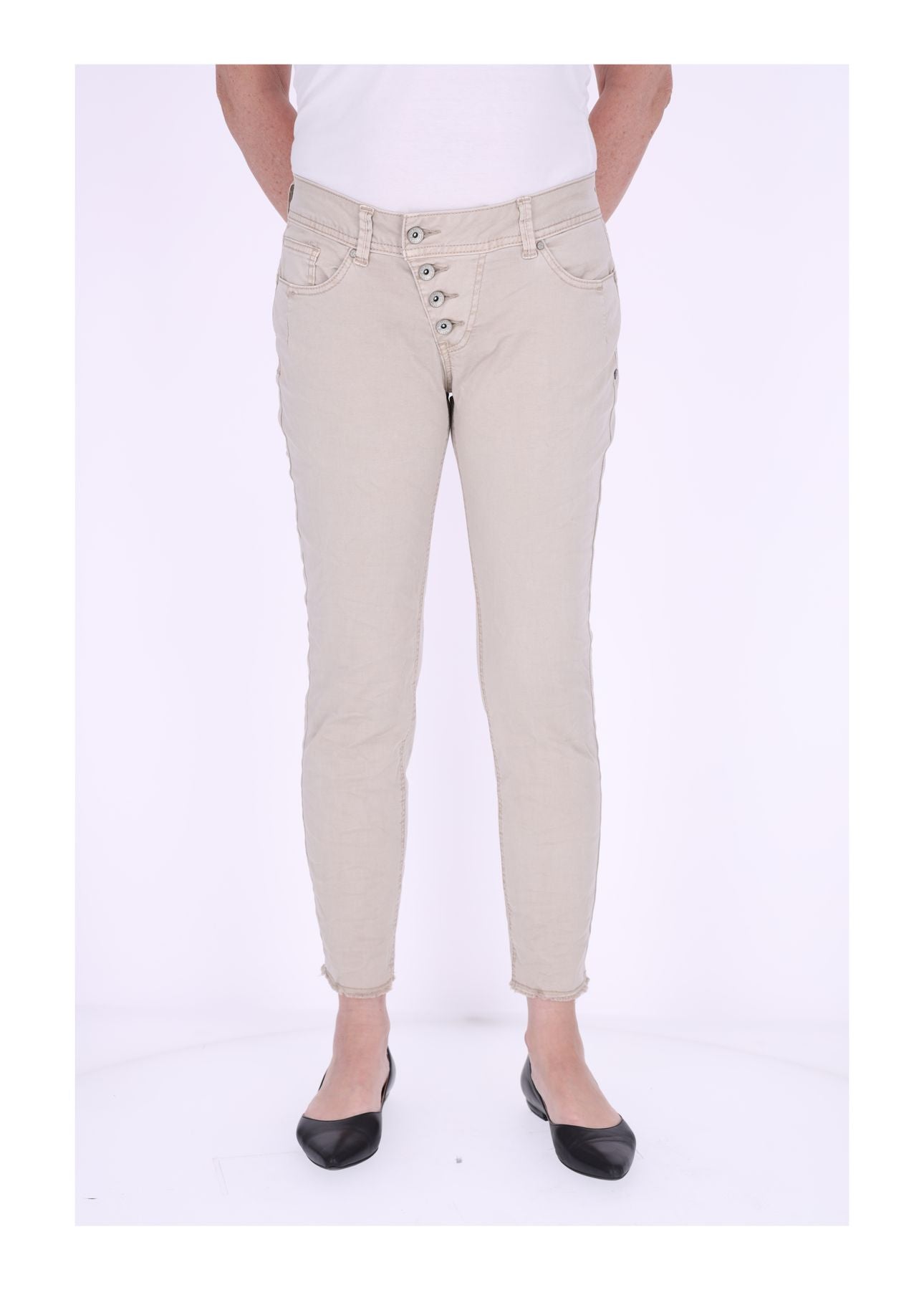 Entdecken Sie die perfekte Kombination aus Stil und Komfort mit unserer Damen Jeans in 7/8-Länge. Das Highlight: die modische schräge Knopfleiste, die der Jeans eine trendige Note verleiht. Dank der praktischen Taschen vorne und hinten bietet sie zudem Funktionalität für den Alltag. Die figurbetonte Passform schmeichelt der Silhouette und macht diese Jeans zum idealen Begleiter für vielseitige Looks – ob lässig mit Sneakern oder elegant mit Absatzschuhen. Ein Must-have für jede modebewusste Garderobe!