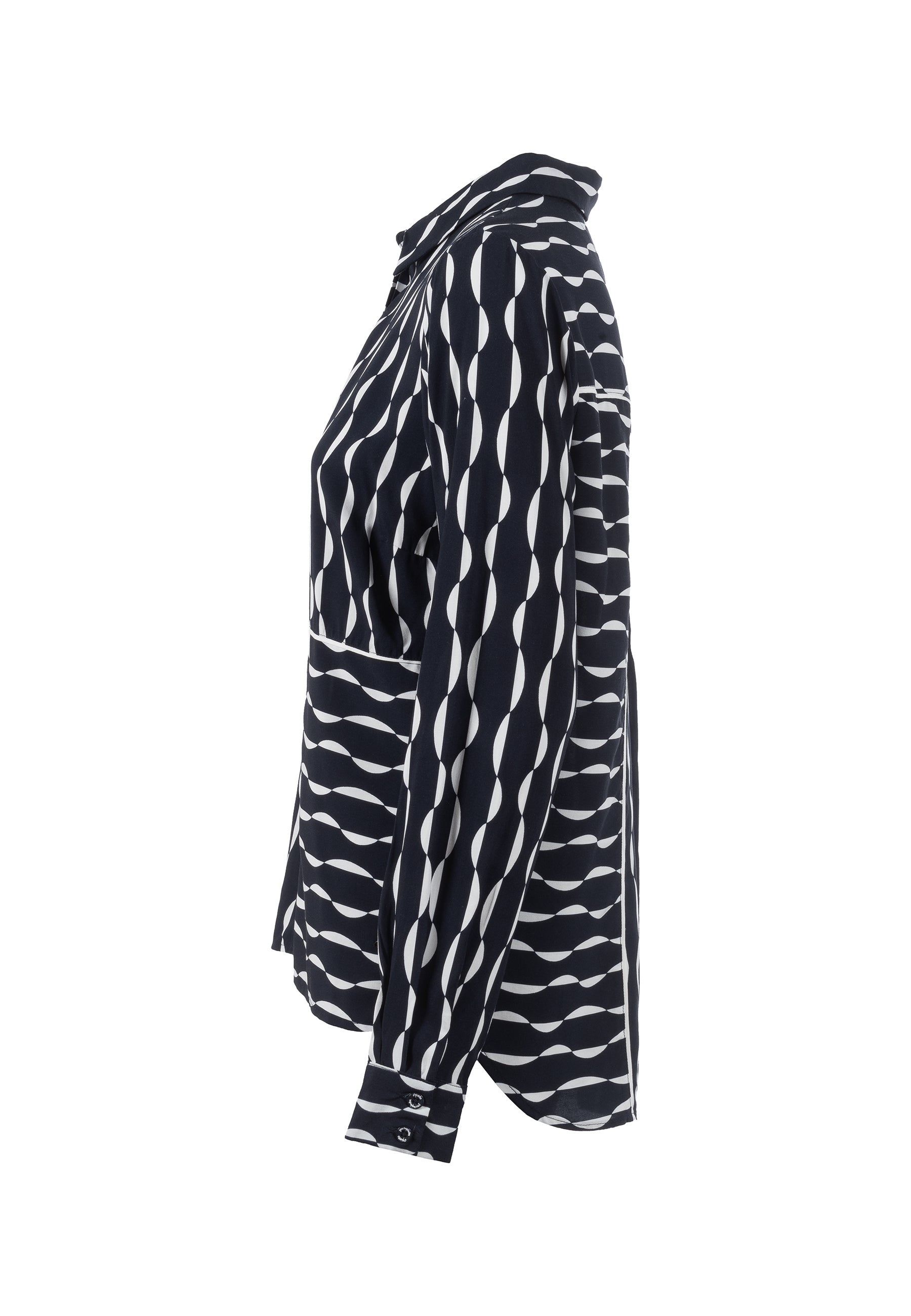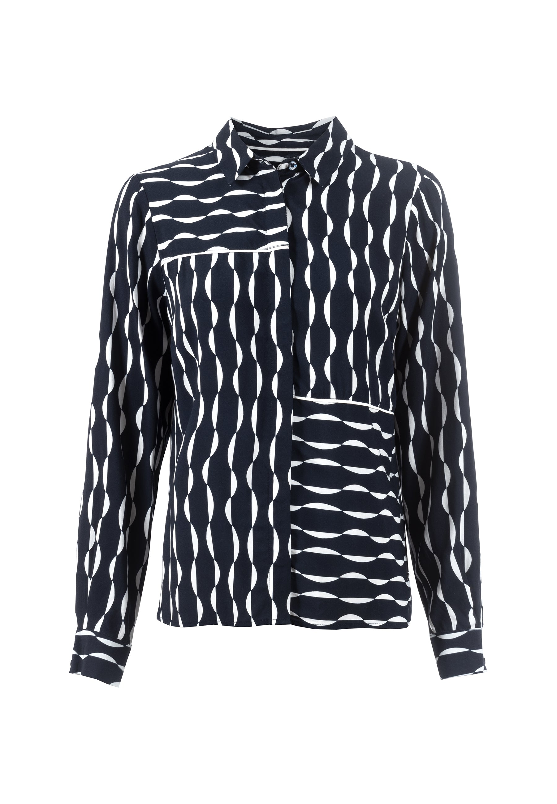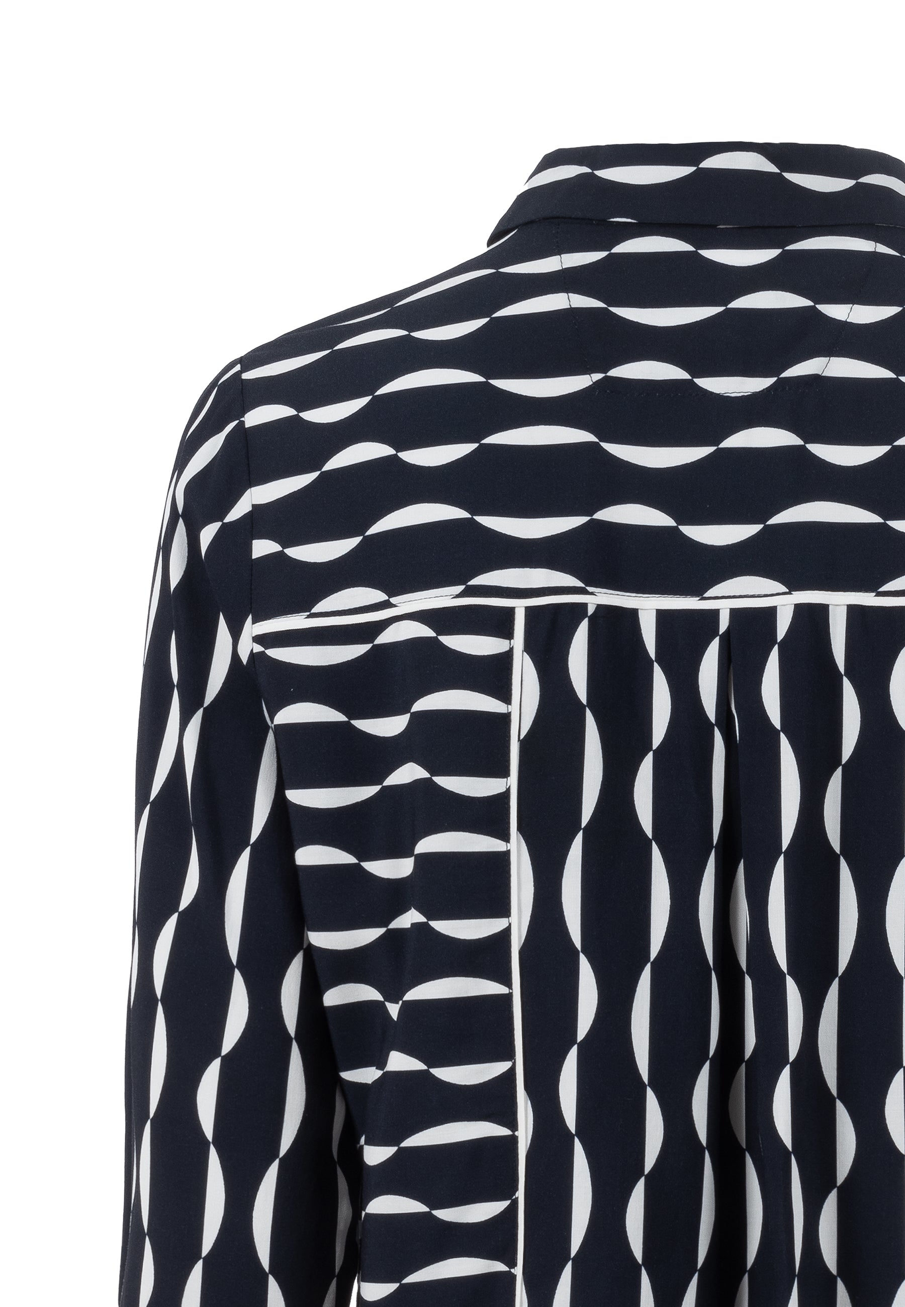 Bluse mit Hemdkragen und langen Ärmeln. Mit grafischem Allover-Print in origineller Streifenoptik. Zu jedem Anlass eine gute Wahl, auch durch die schlichte Farbgestaltung in navy mit weiß.