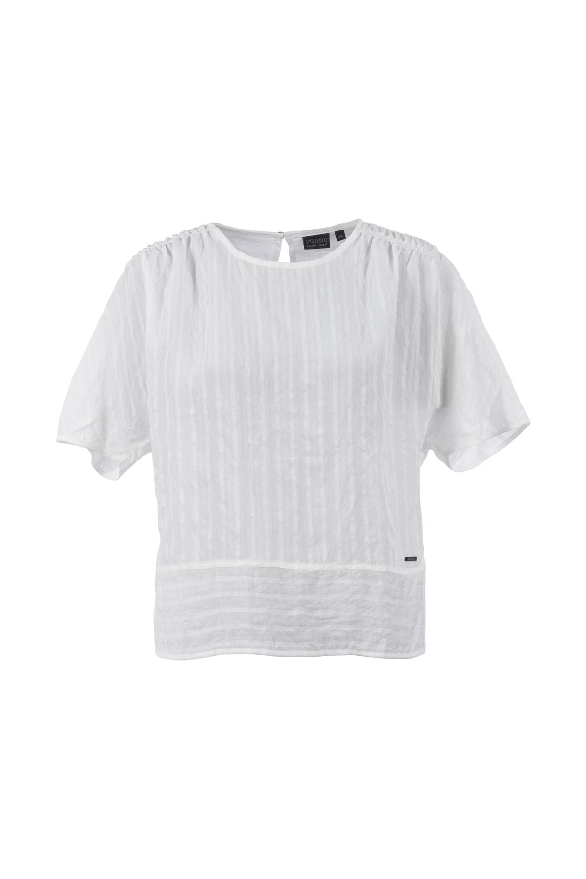 Diese stilvolle Damenbluse überzeugt mit einer dezenten, tonigen Streifenoptik und einem femininen Schnitt – ideal für sommerliche Tage. Die locker fallende Passform mit überschnittenen Schultern sorgt für einen modernen, entspannten Look und angenehmen Tragekomfort. Raffungen an den Schultern verleihen der Bluse eine zarte, verspielte Note. Ein besonderer Hingucker ist der elegante Schlitz mit Knopfverschluss im Rücken, der zusätzlich Leichtigkeit und Raffinesse ins Design bringt. Ob zur Jeans, Stoffhose oder zum Rock – diese Bluse lässt sich vielseitig kombinieren und passt sowohl ins Büro als auch in die Freizeit.