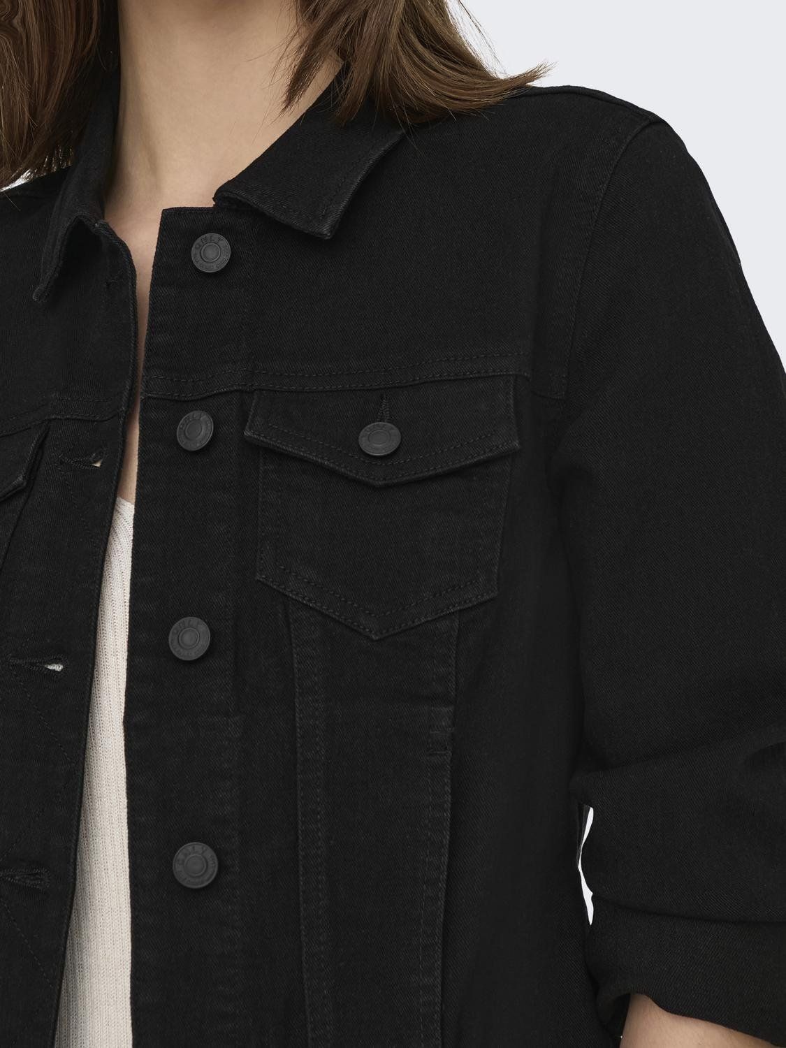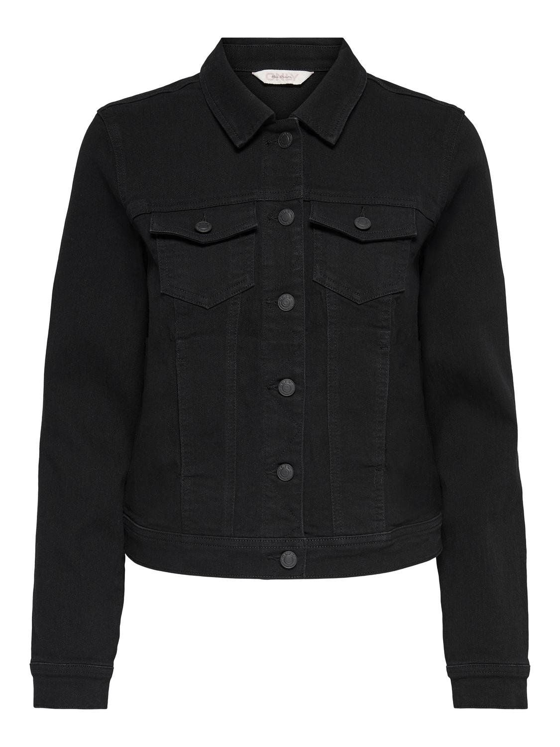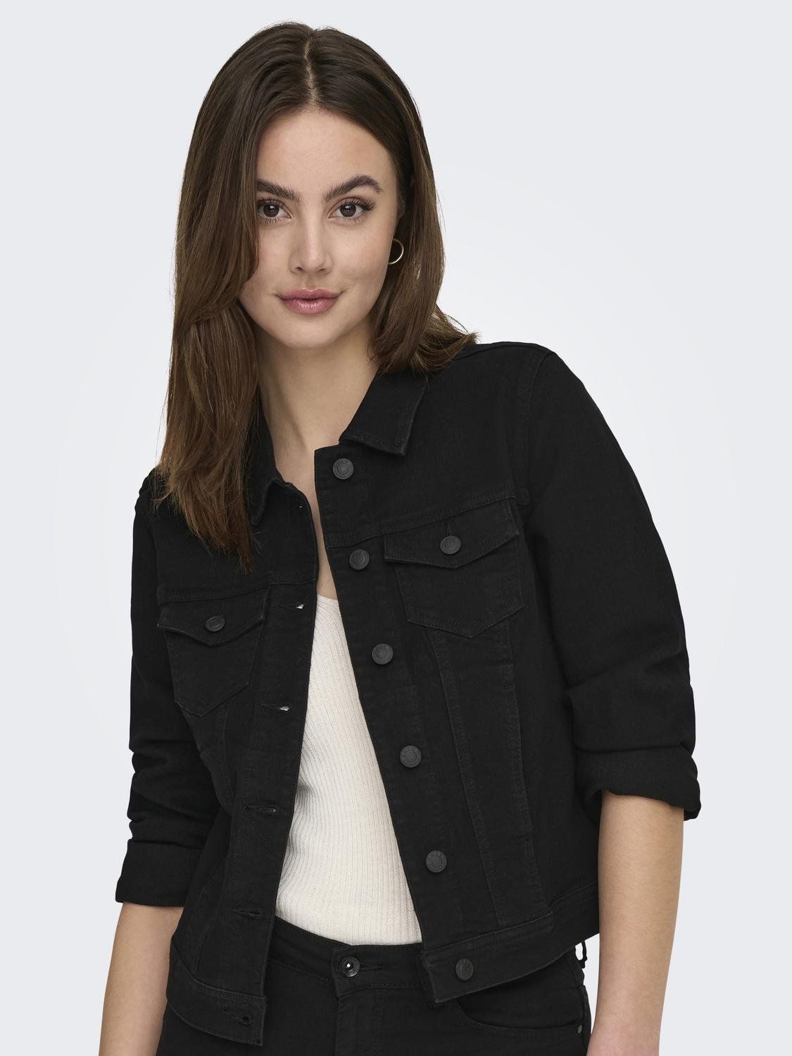 Produkttyp : Jeansjacke - Neck : Fly-Away Kragen - Ärmel : Langarm - Manschetten : Ärmelbündchen mit Knopf - Verschluss : Knopfleiste - Taschen : Brusttaschen mit Knopfleiste - Länge/Größe : Kurz