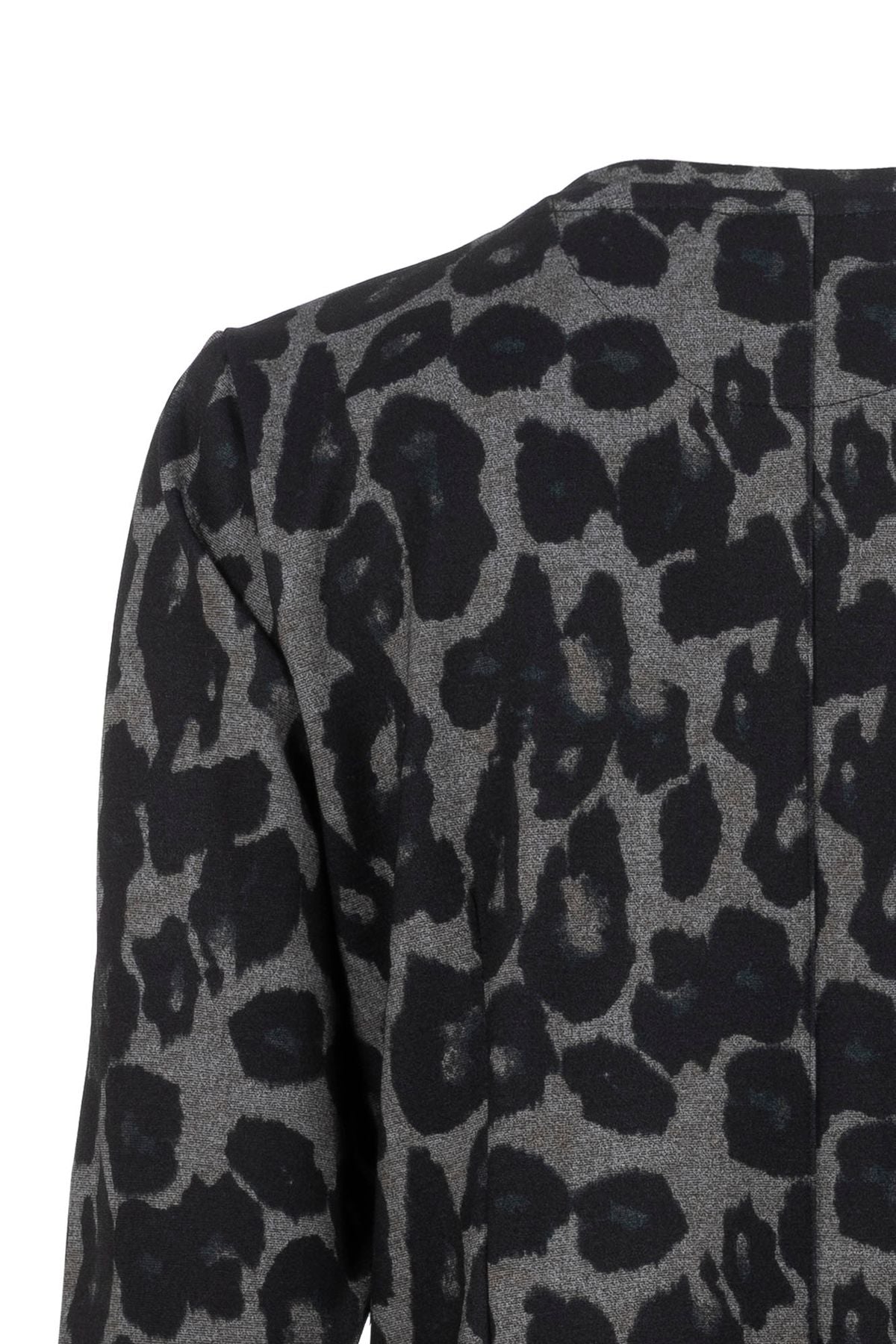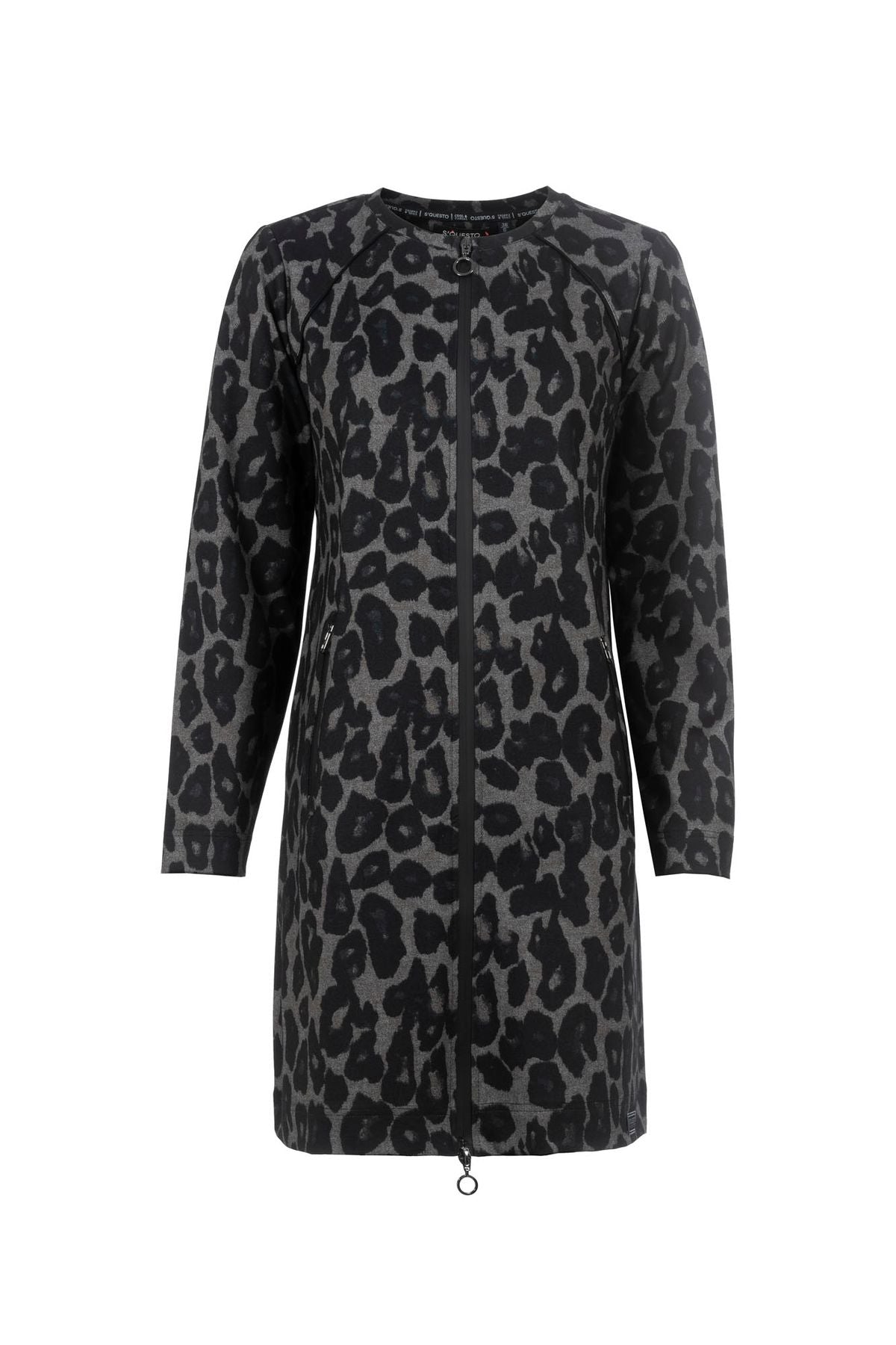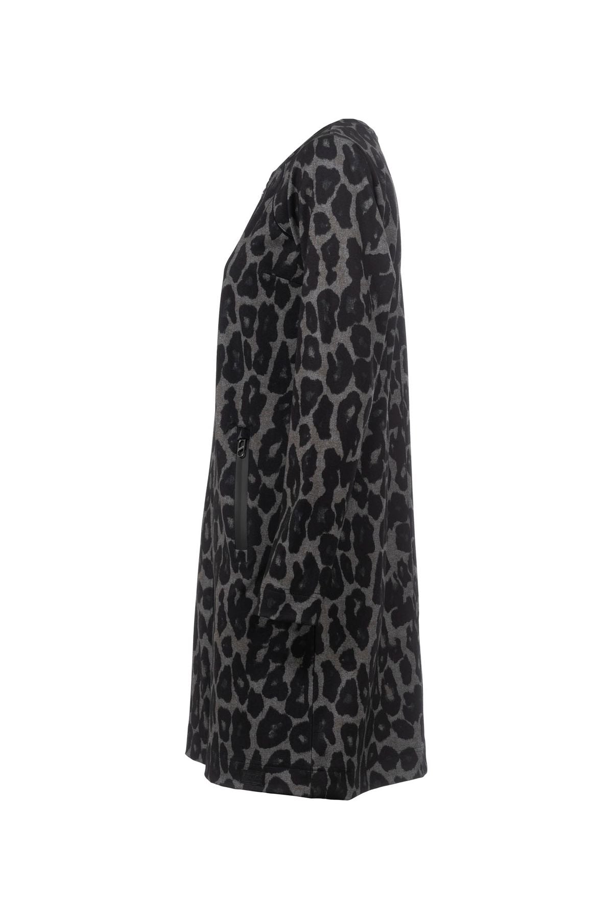 Rundhals Kleid mit zwei praktischen Reißverschlusstaschen in angesagtem Leomuster. Durch den durchgezogenen Reißverschluss kann das Kleid auch als Longjacket getragen werden.