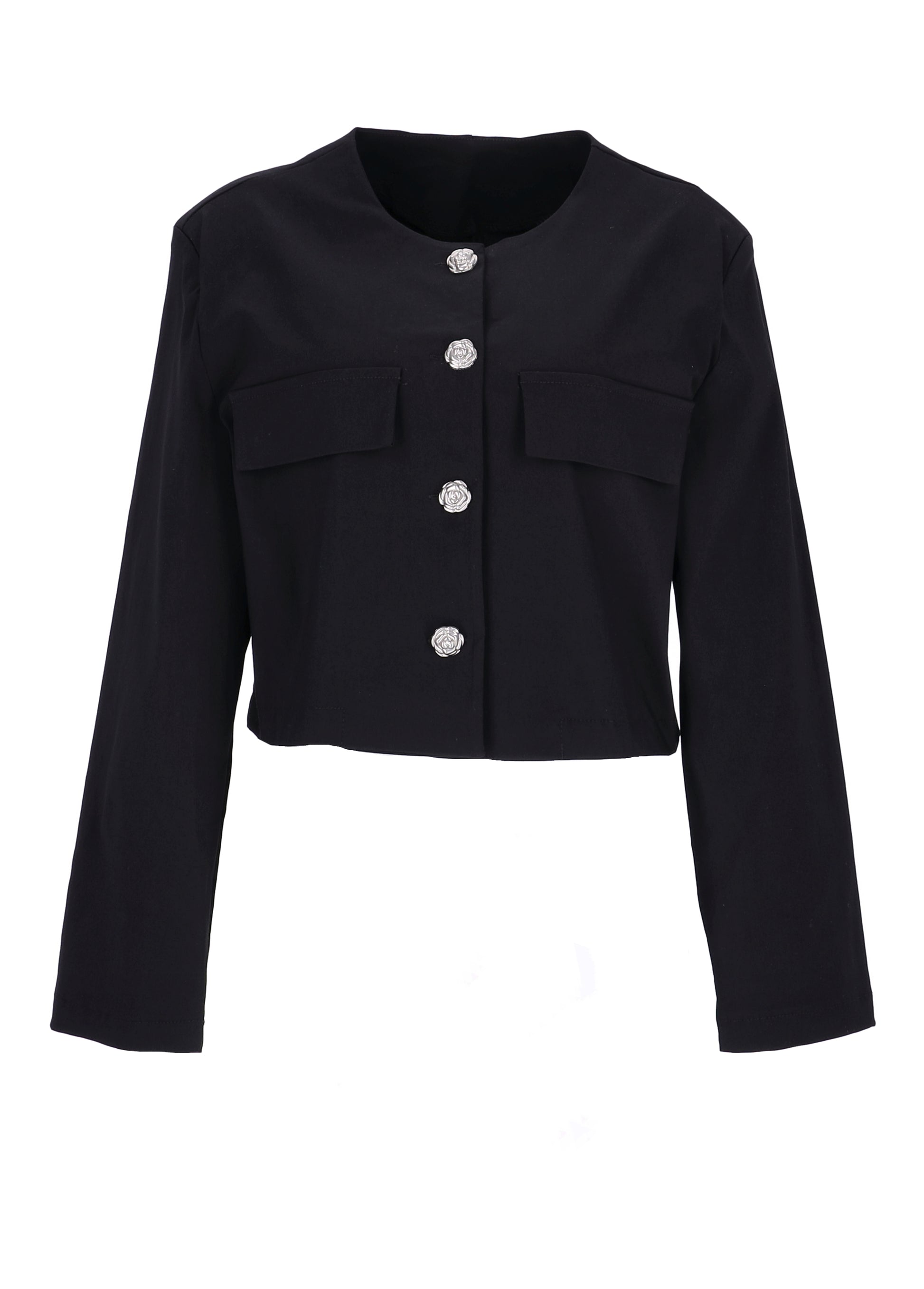 Der Kurzblazer besticht durch sein schickes und feminines Design. Besonders auffällig sind die einzigartigen Rosenknöpfe, die dem Blazer einen romantischen und dennoch professionellen Touch verleihen. Die taillierte Passform betont Ihre Figur und sorgt für eine schlanke Silhouette.
