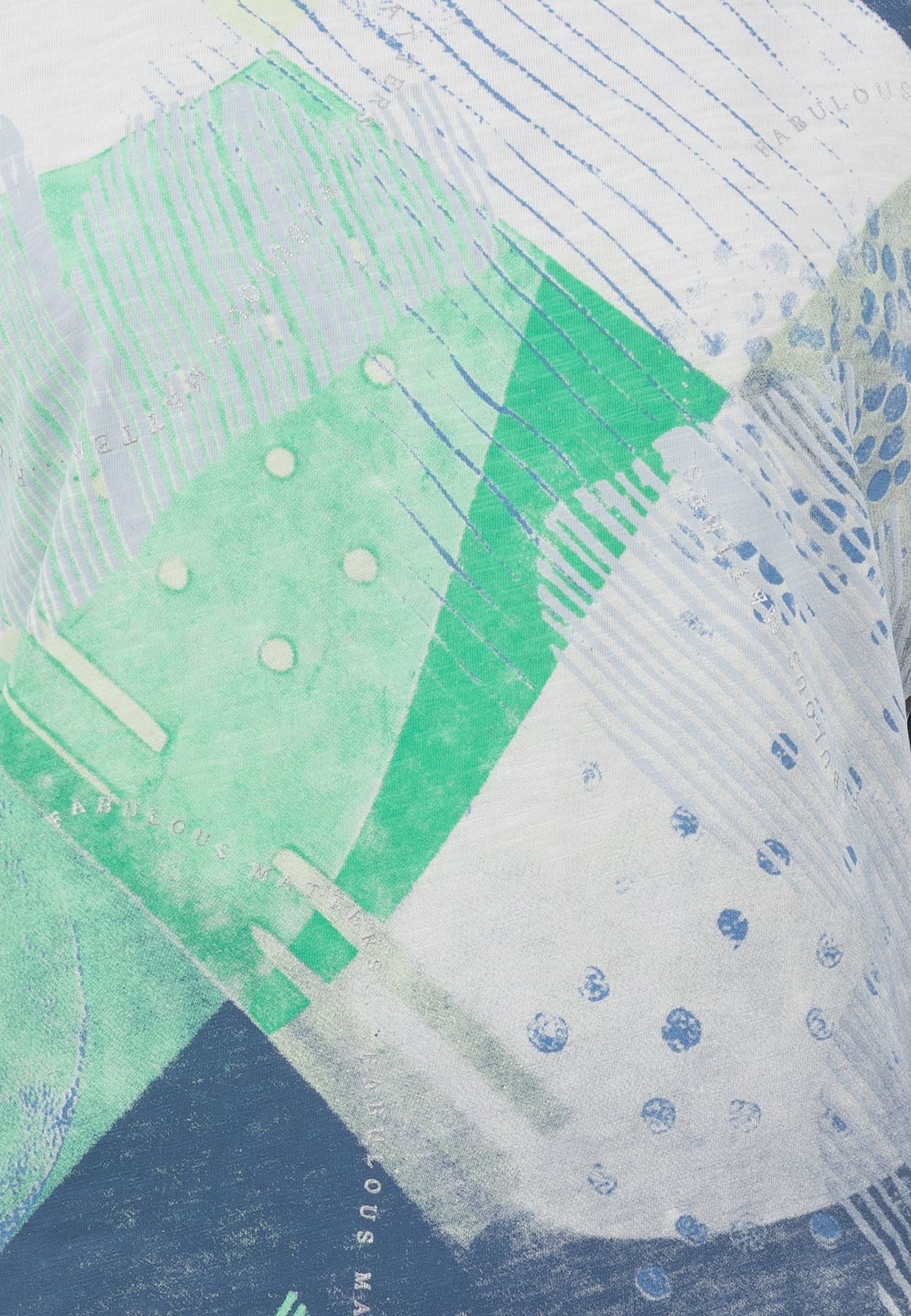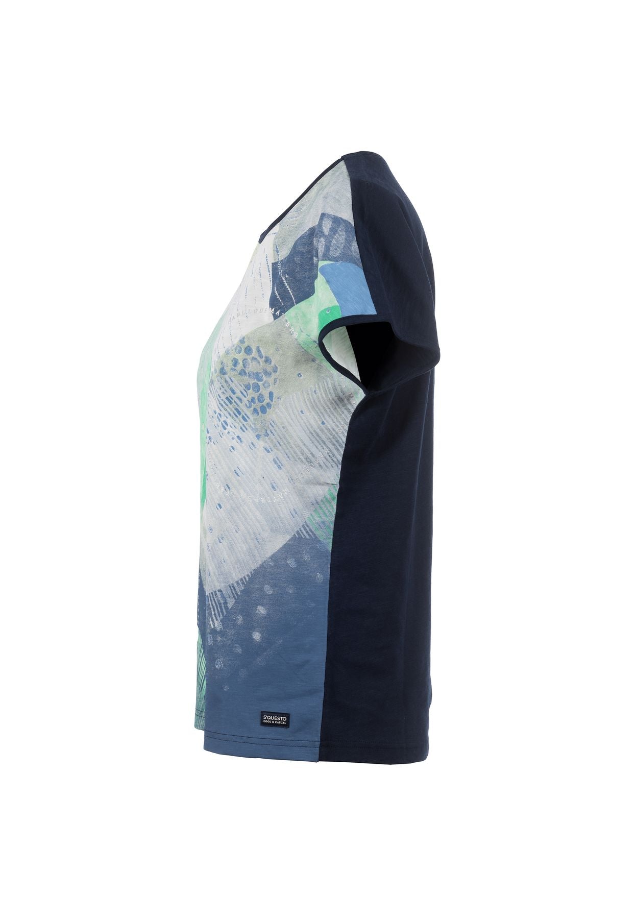 Leichtes T-Shirt mit Rundhalsausschnitt und überschnittenem Ärmel. Das Shirt zeichnet sich durch ein großflächiges, abstraktes Frontmotiv aus. Die Rückseite ist hingegen einfarbig gehalten für ein ausgeglichenes Gesamtbild.