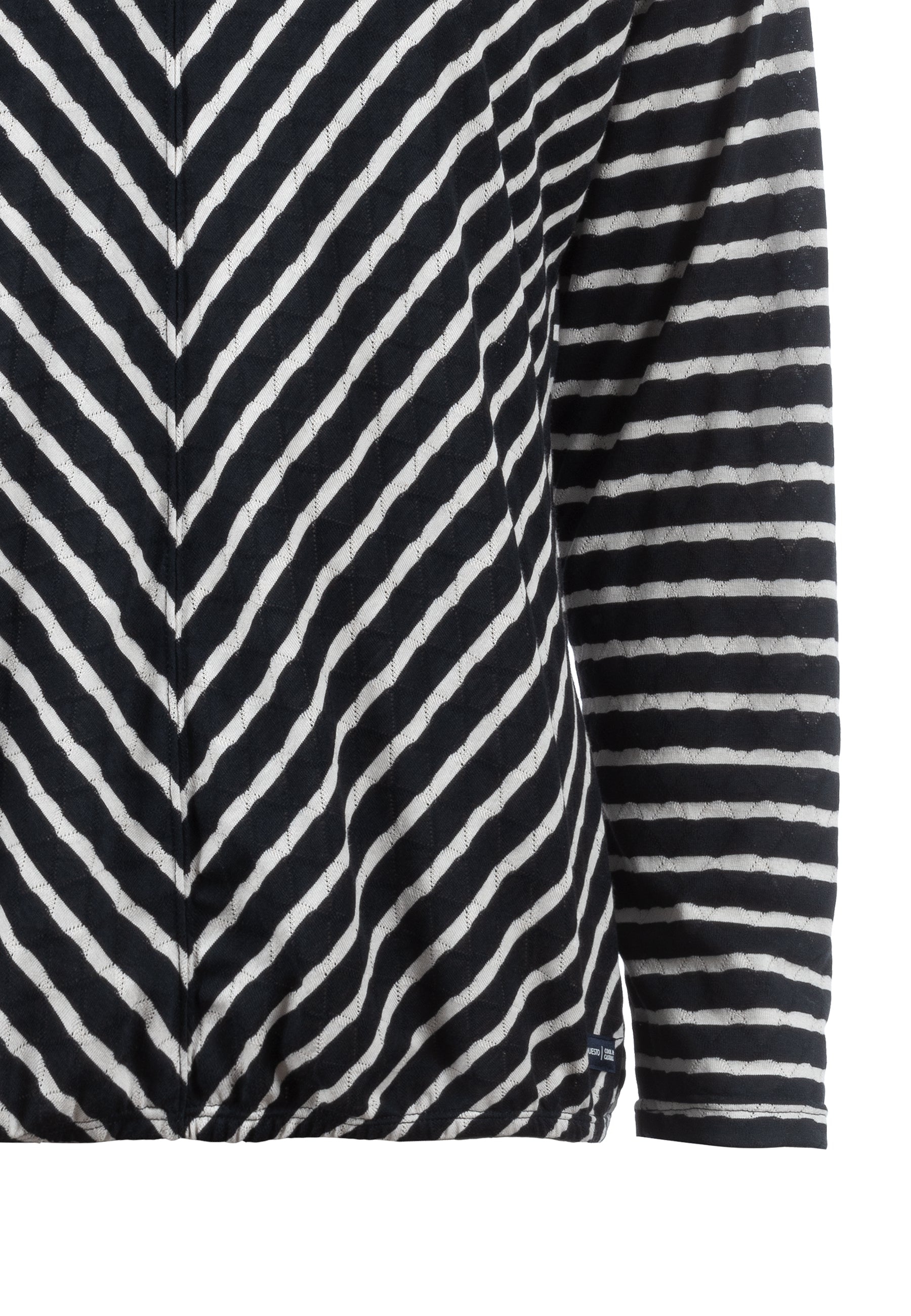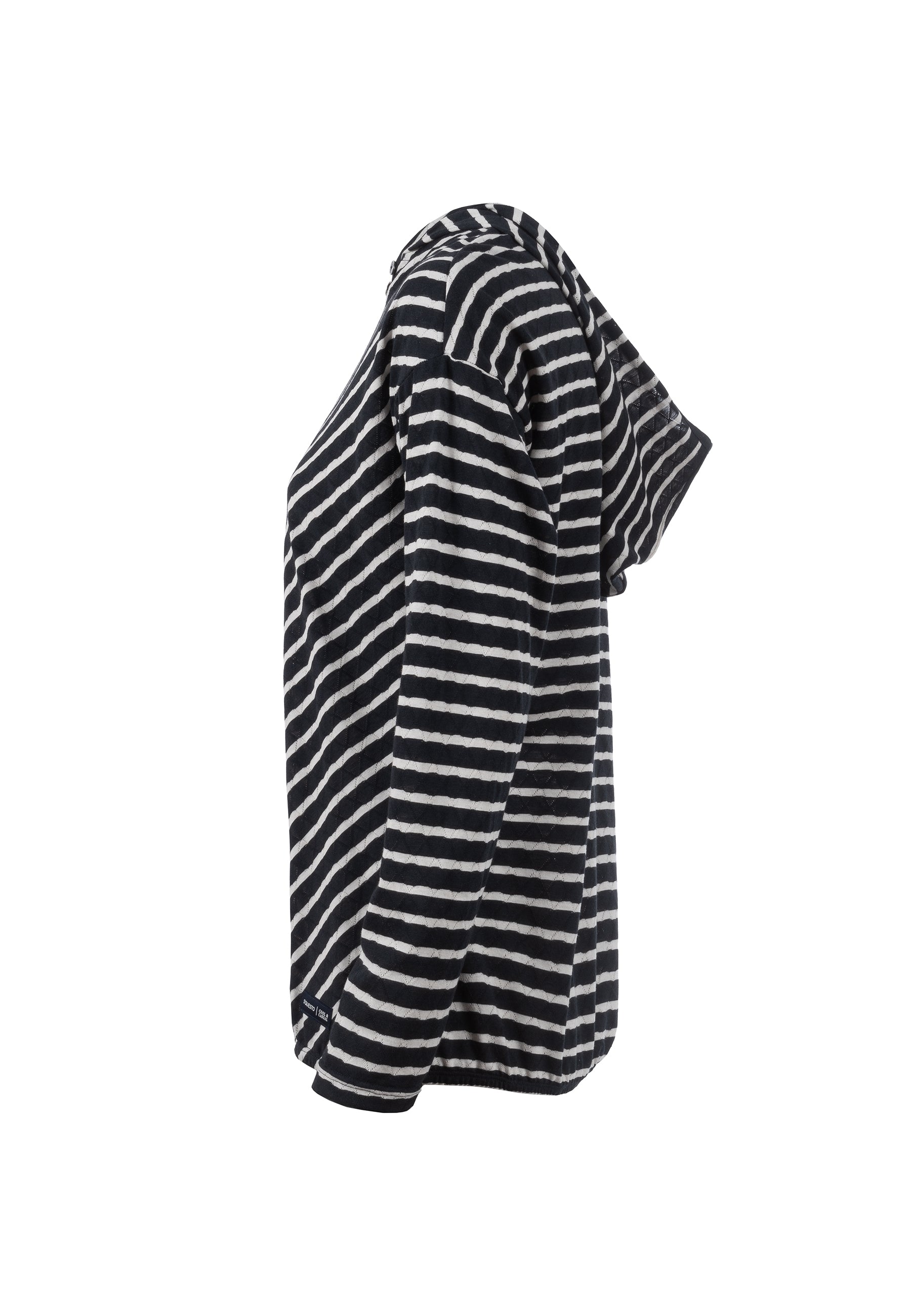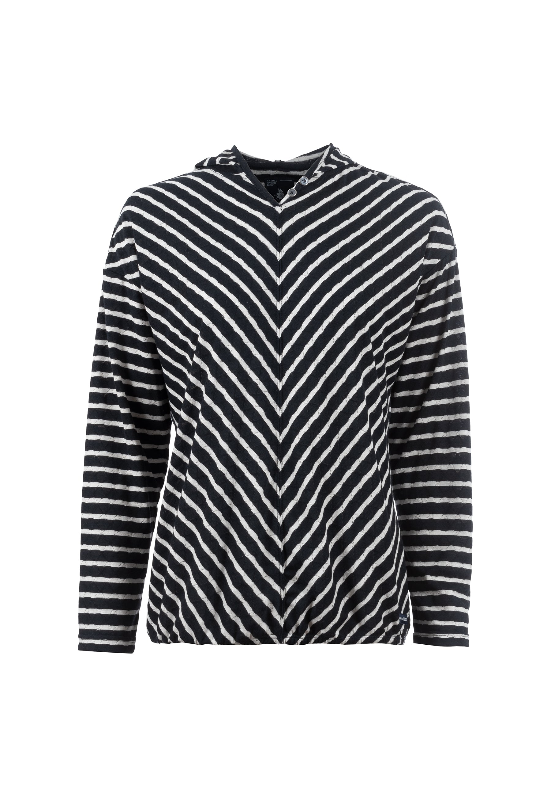 Leichtes Langarm-Shirt in moderner Streifenoptik. Mit überschnittener Schulter und Gummizug am Bund für einen sportiven Look, welcher auch durch die Kapuze unterstrichen wird.