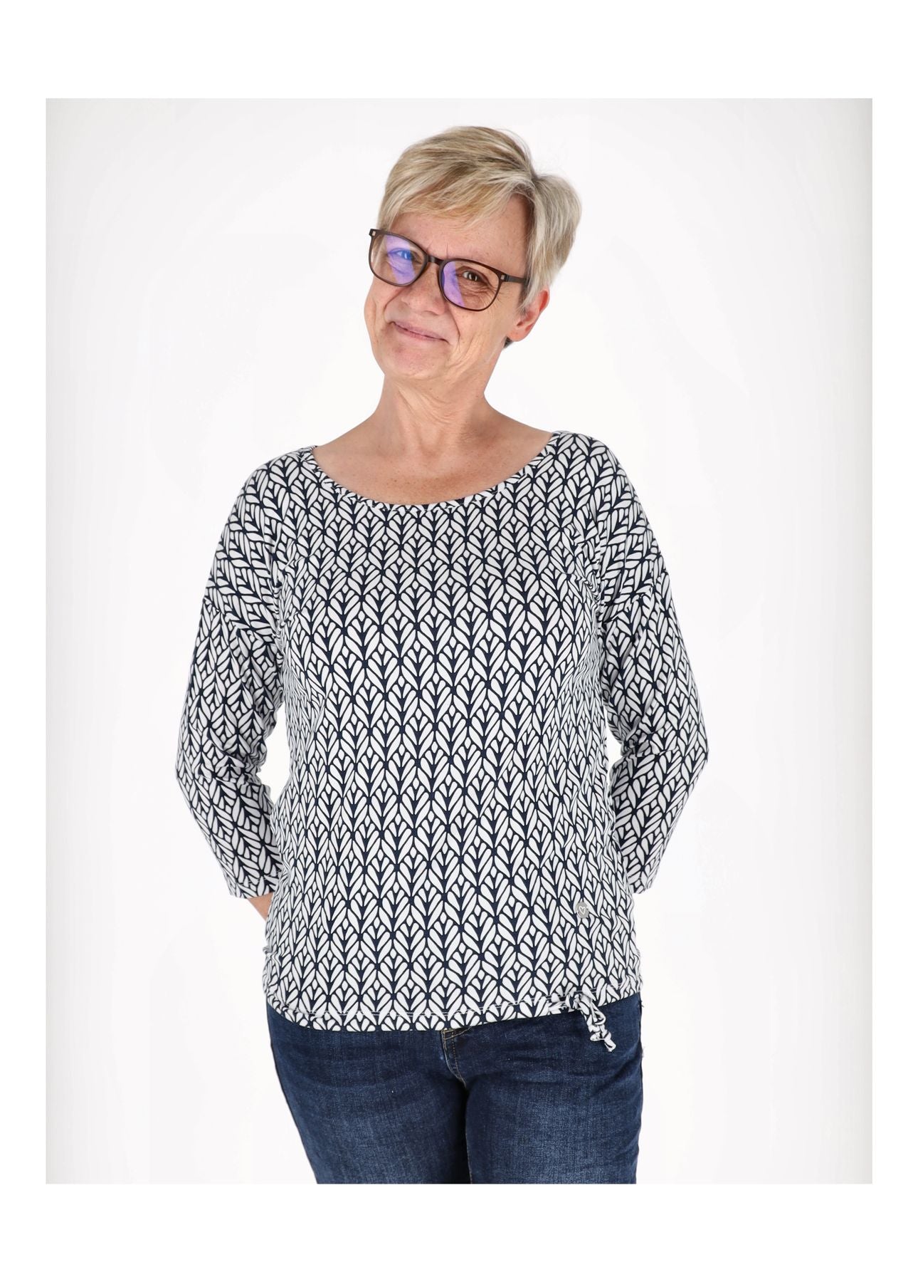Dieses sommerliche Damen-Shirt überzeugt durch seinen weichen, anschmiegsamen Stoff und den verspielten floralen Blattprint – ein femininer Touch für jede Gelegenheit. Der 3/4-Arm macht es ideal für wechselhafte Temperaturen, während der Tunnelzug am Saum die Passform individuell anpassen lässt – ob leger oder tailliert.
