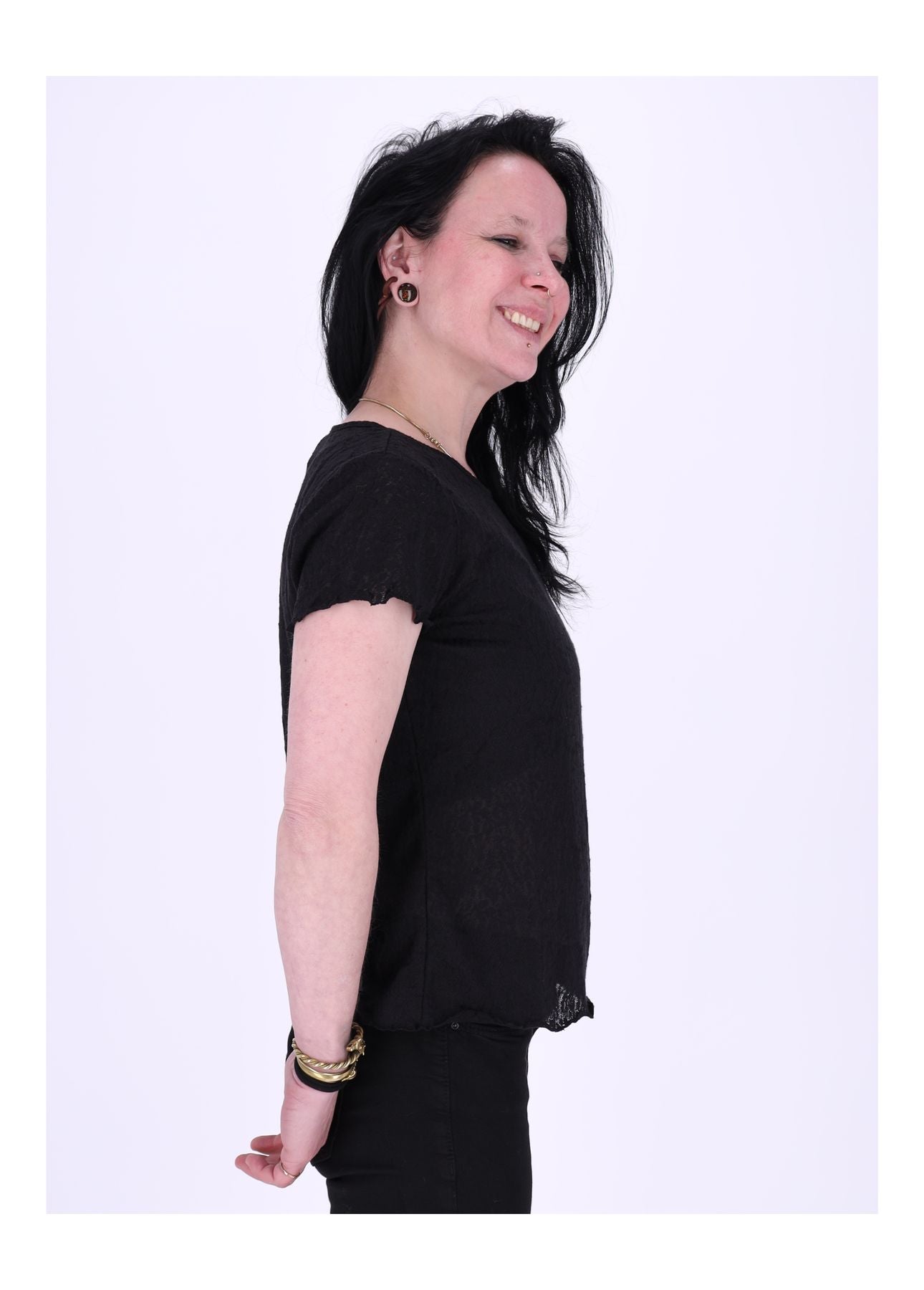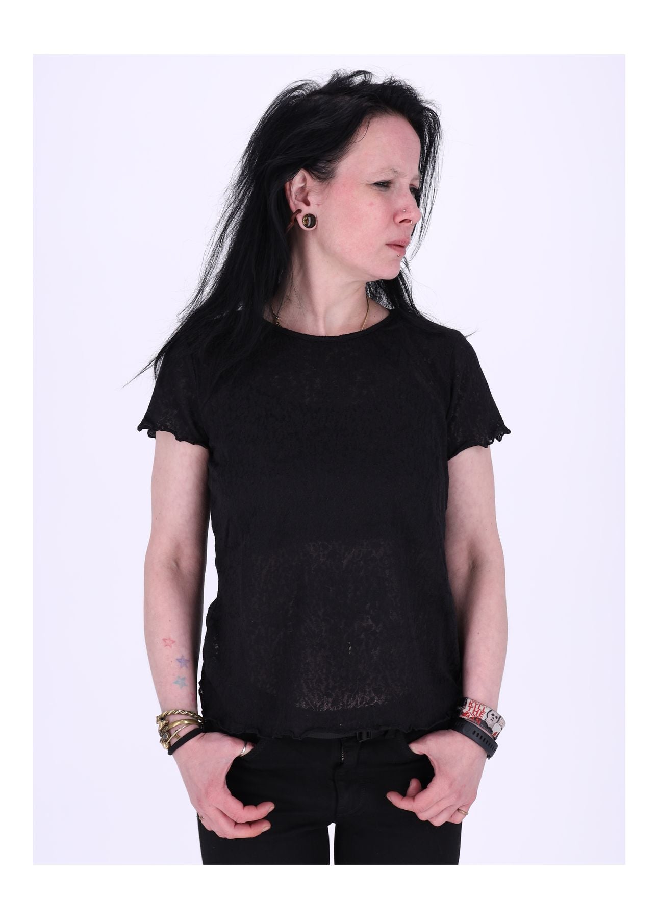 Dieses Damen T-Shirt aus leicht durchsichtiger Spitze verleiht jedem Look eine feminine Note. Der zarte Stoff schmiegt sich angenehm an die Haut und sorgt für ein luftig-leichtes Tragegefühl. Perfekt für stilvolle Outfits mit romantischem Touch.