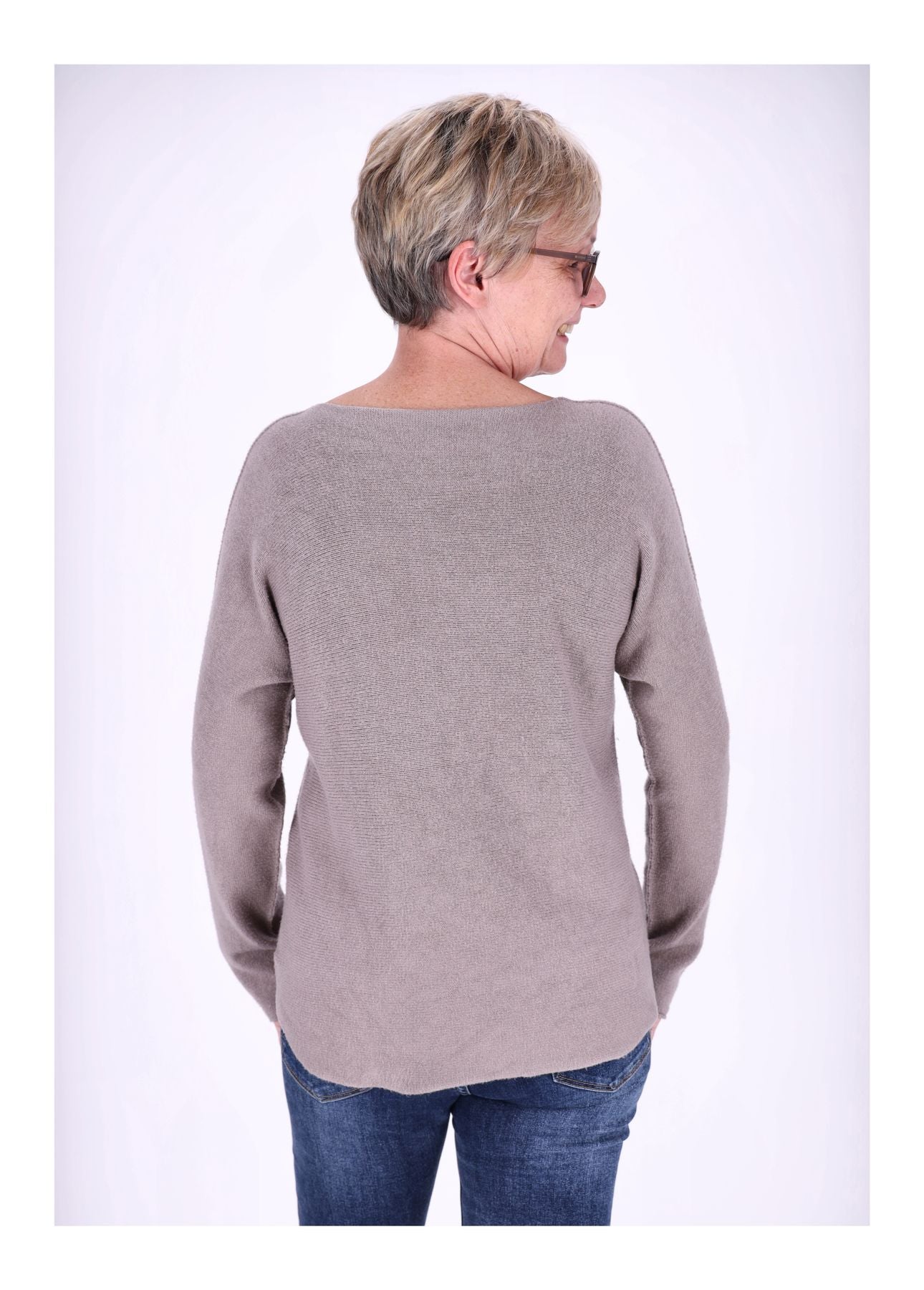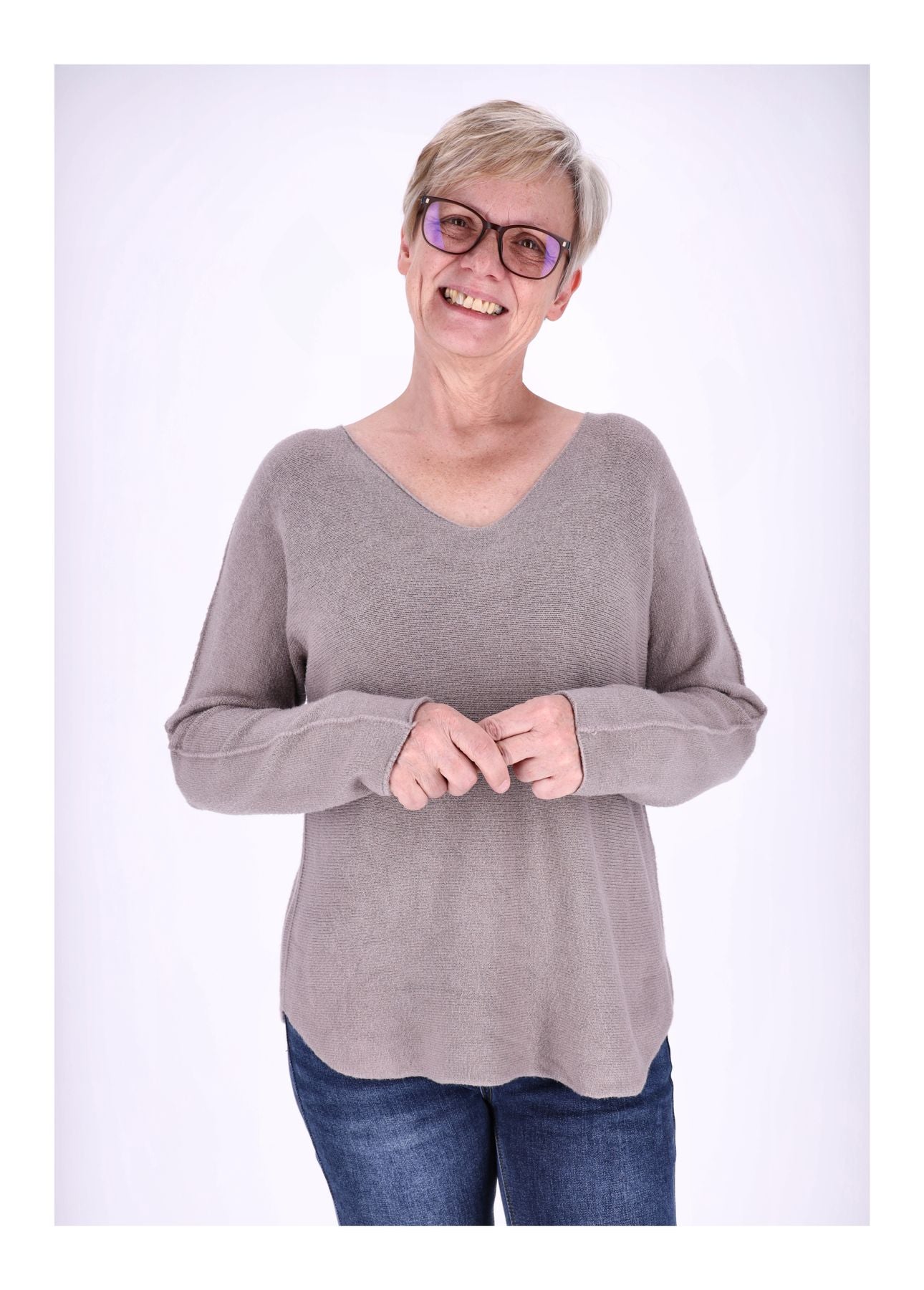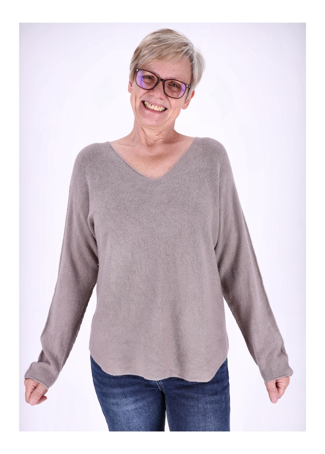 Der Pullover ist Onesize, passend etwa für die Konfektionsgrößen 38–42, mit einem halben Brustumfang von 54 cm und einer Länge von der Schulter ca. 60 cm. Aufgrund der Herstellung können die Maße leicht von der angegebenen Größe und Form abweichen. Der V-Ausschnitt sorgt für ein klassisches, zeitloses Design.