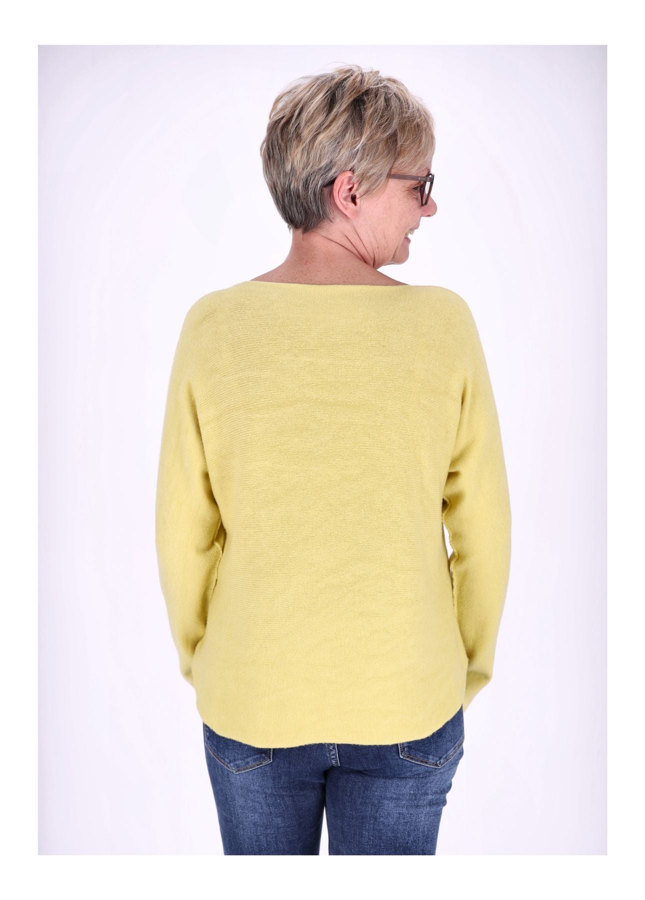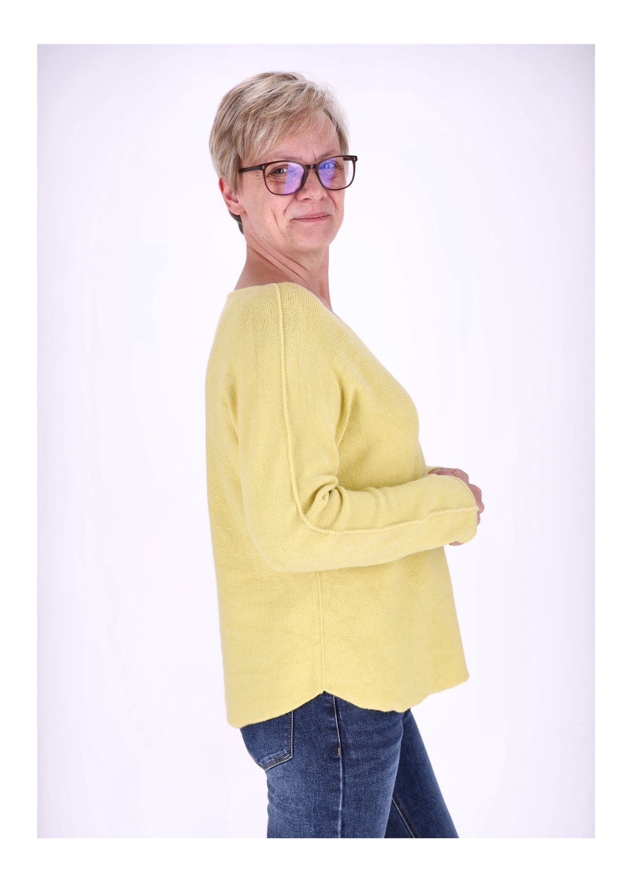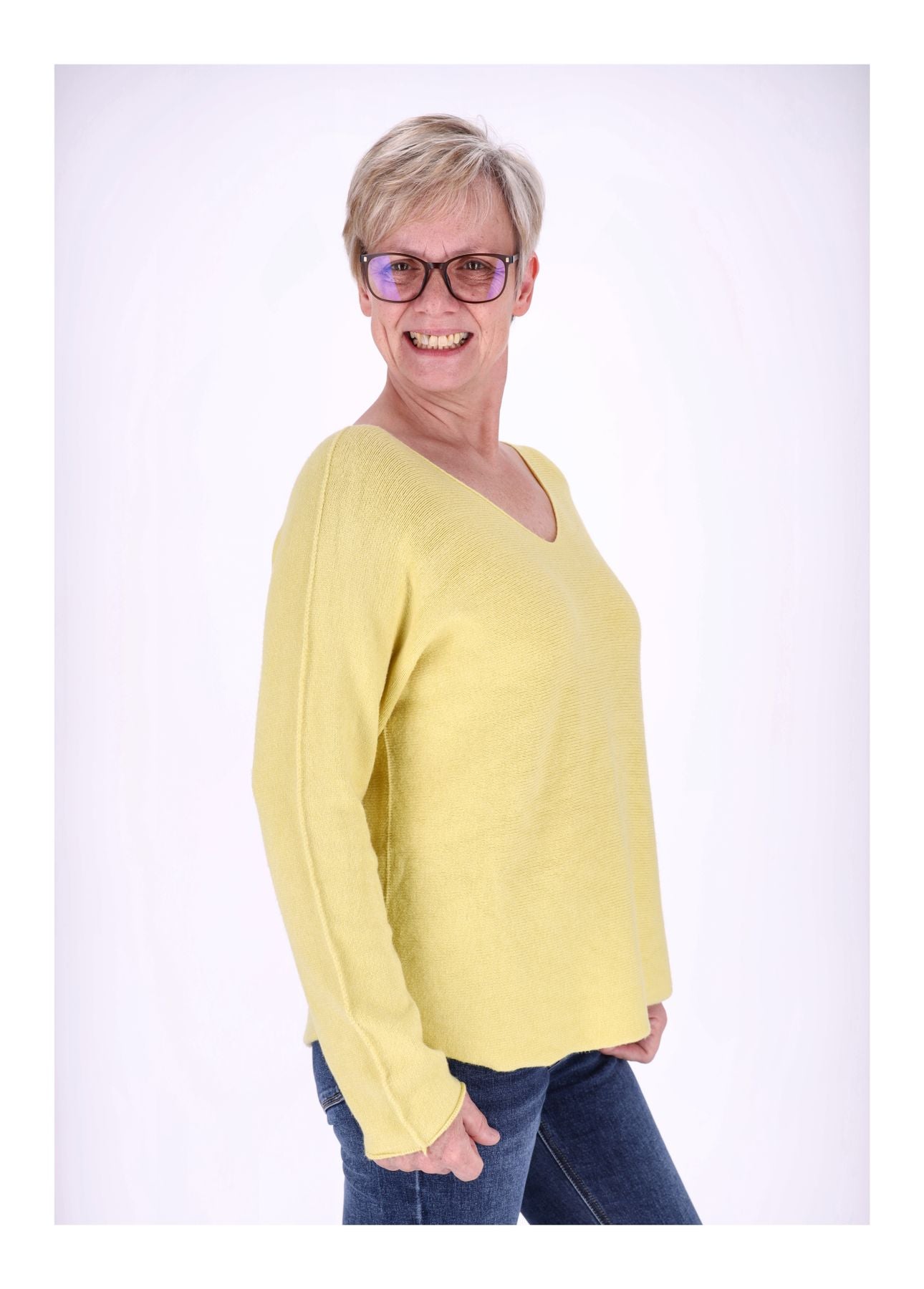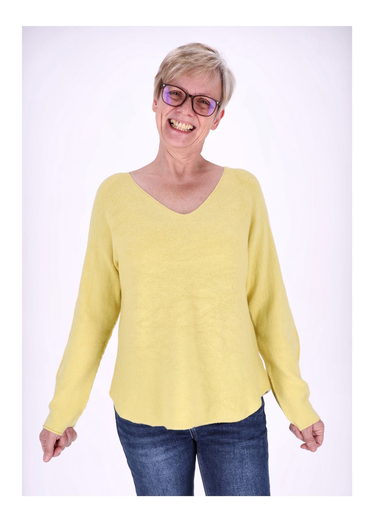 Der Pullover ist Onesize, passend etwa für die Konfektionsgrößen 38–42, mit einem halben Brustumfang von 54 cm und einer Länge von der Schulter ca. 60 cm. Aufgrund der Herstellung können die Maße leicht von der angegebenen Größe und Form abweichen. Der V-Ausschnitt sorgt für ein klassisches, zeitloses Design.