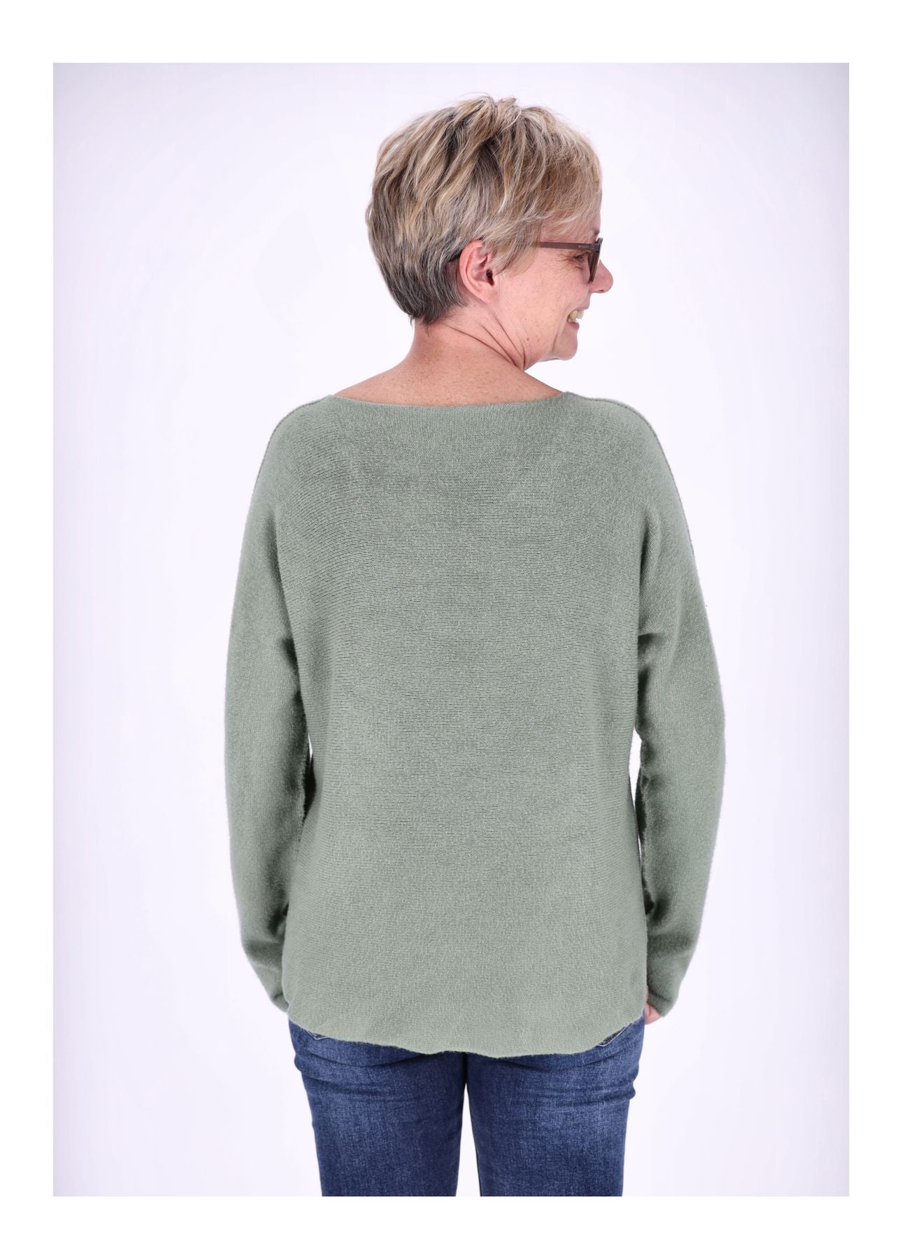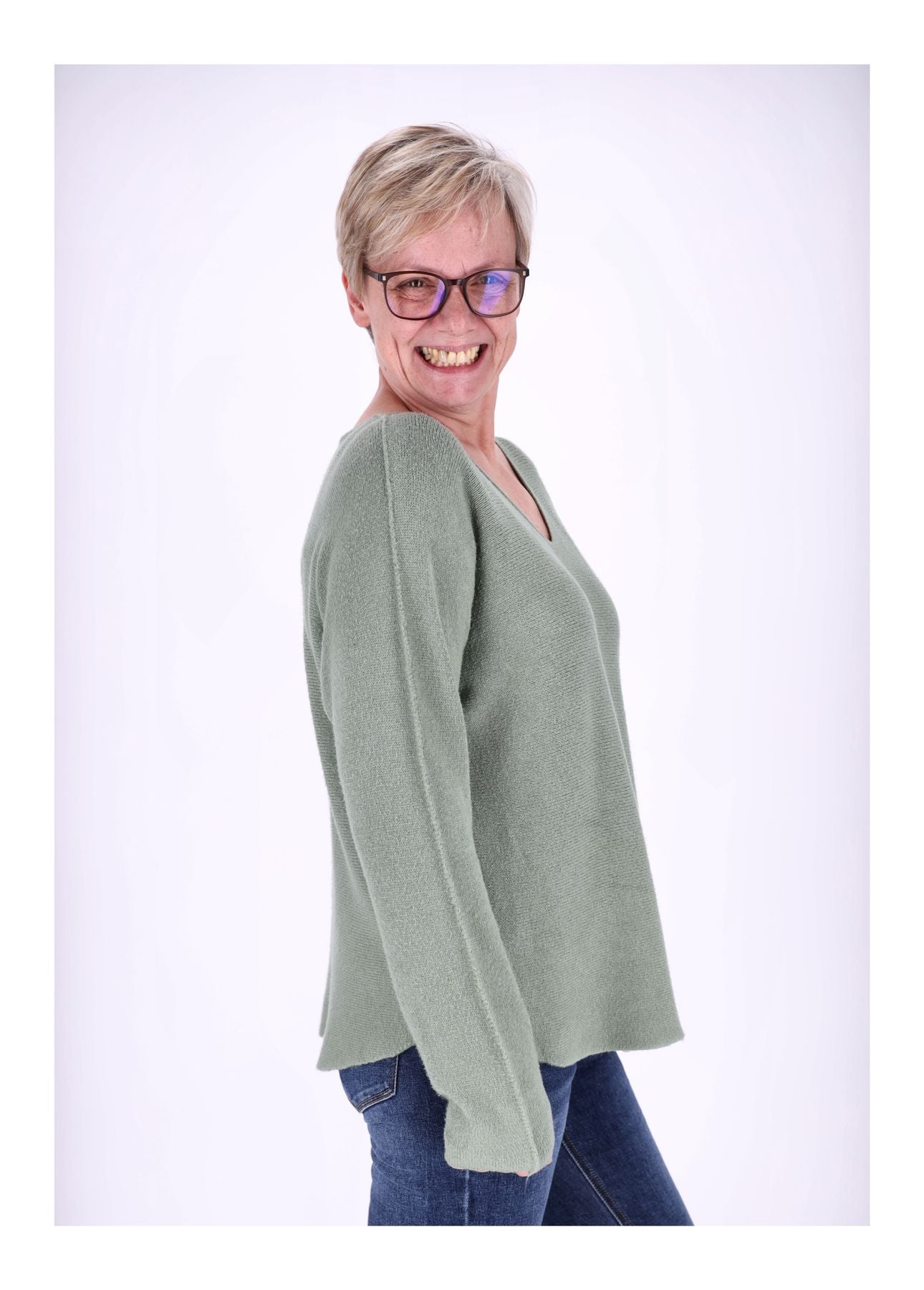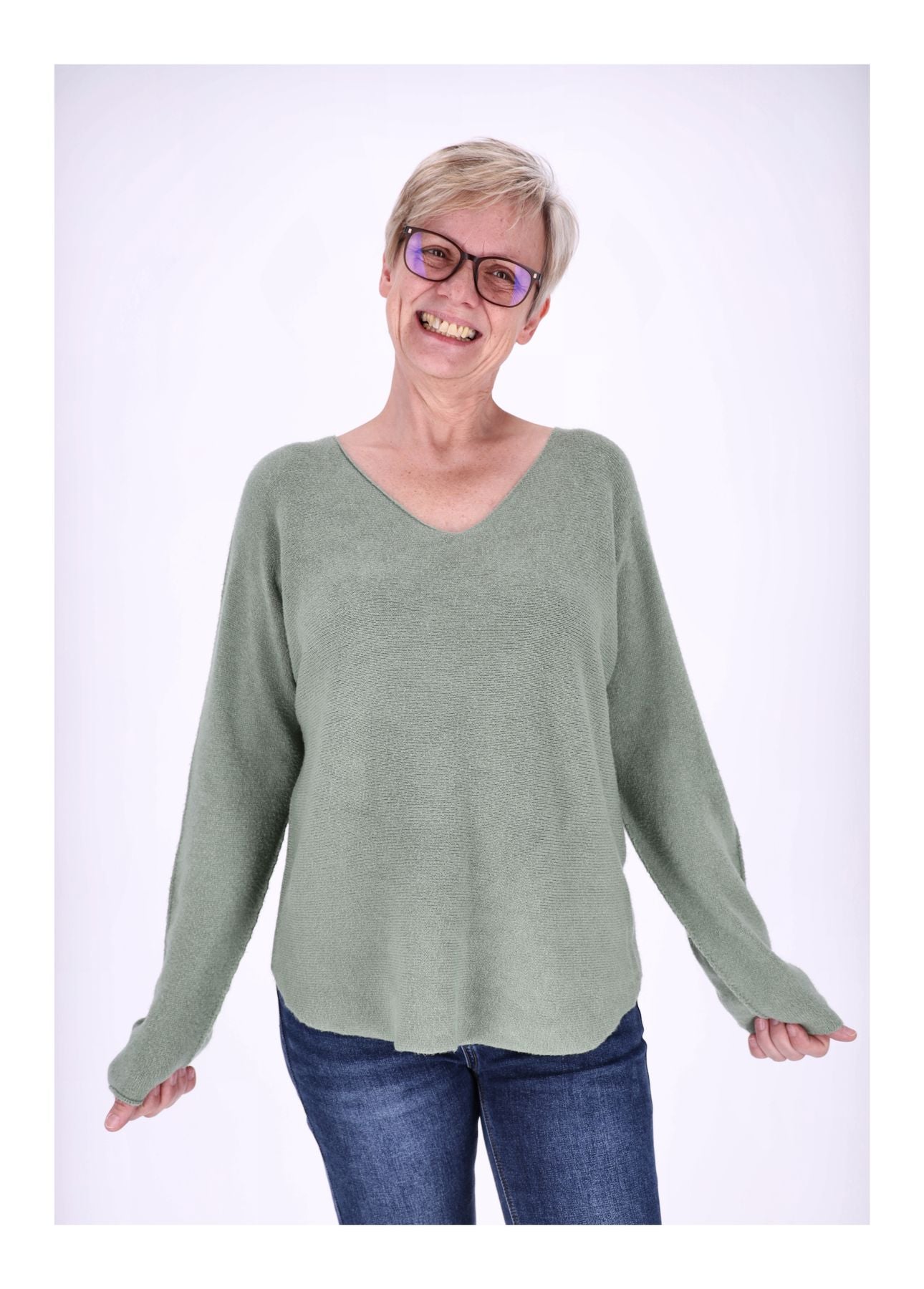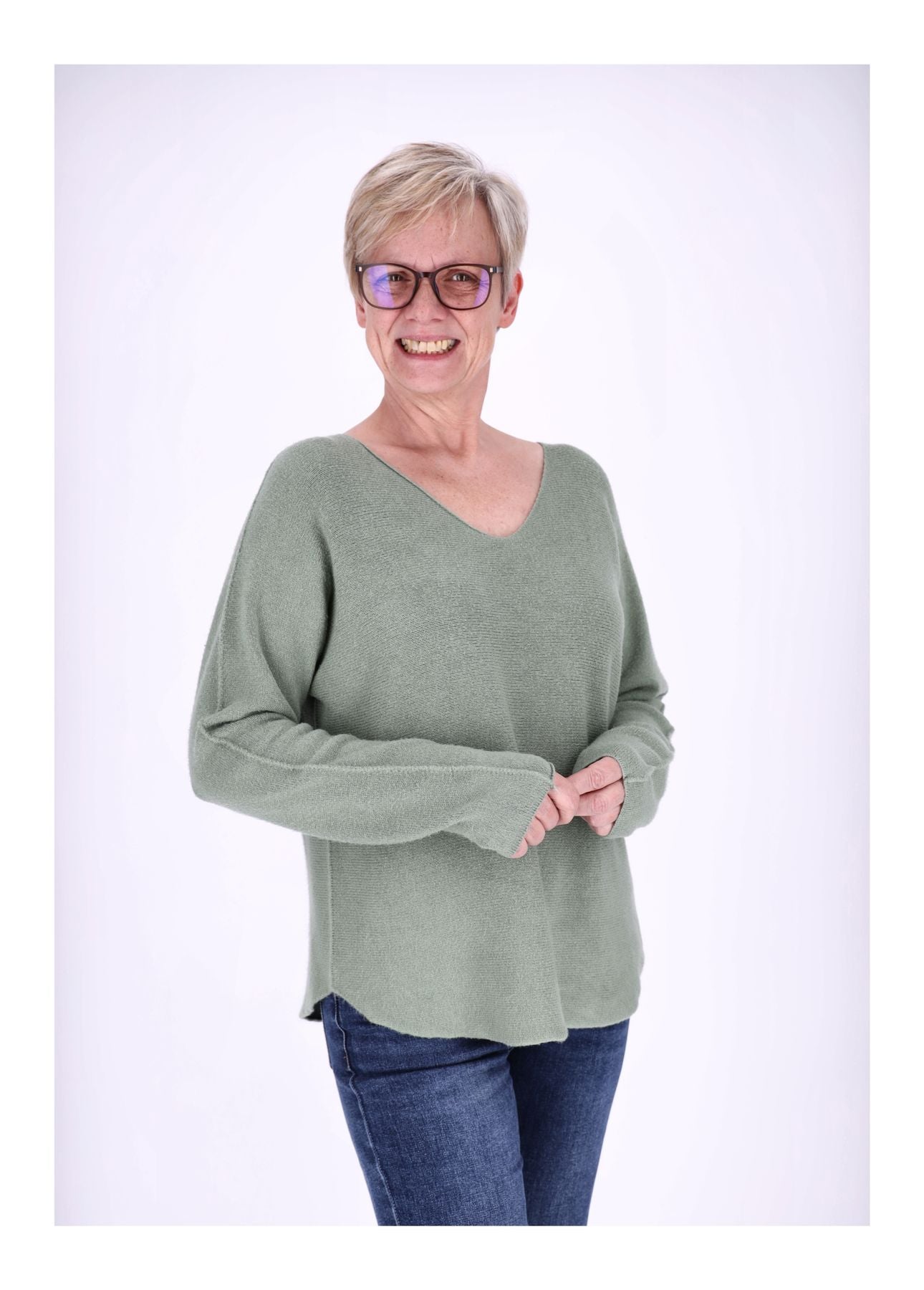 Der Pullover ist Onesize, passend etwa für die Konfektionsgrößen 38–42, mit einem halben Brustumfang von 54 cm und einer Länge von der Schulter ca. 60 cm. Aufgrund der Herstellung können die Maße leicht von der angegebenen Größe und Form abweichen. Der V-Ausschnitt sorgt für ein klassisches, zeitloses Design.
