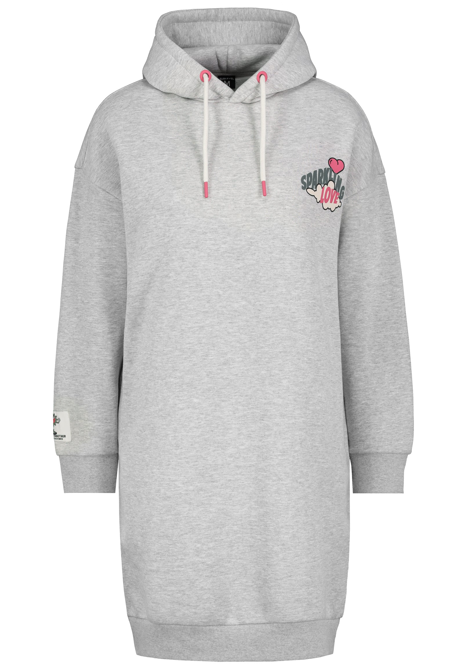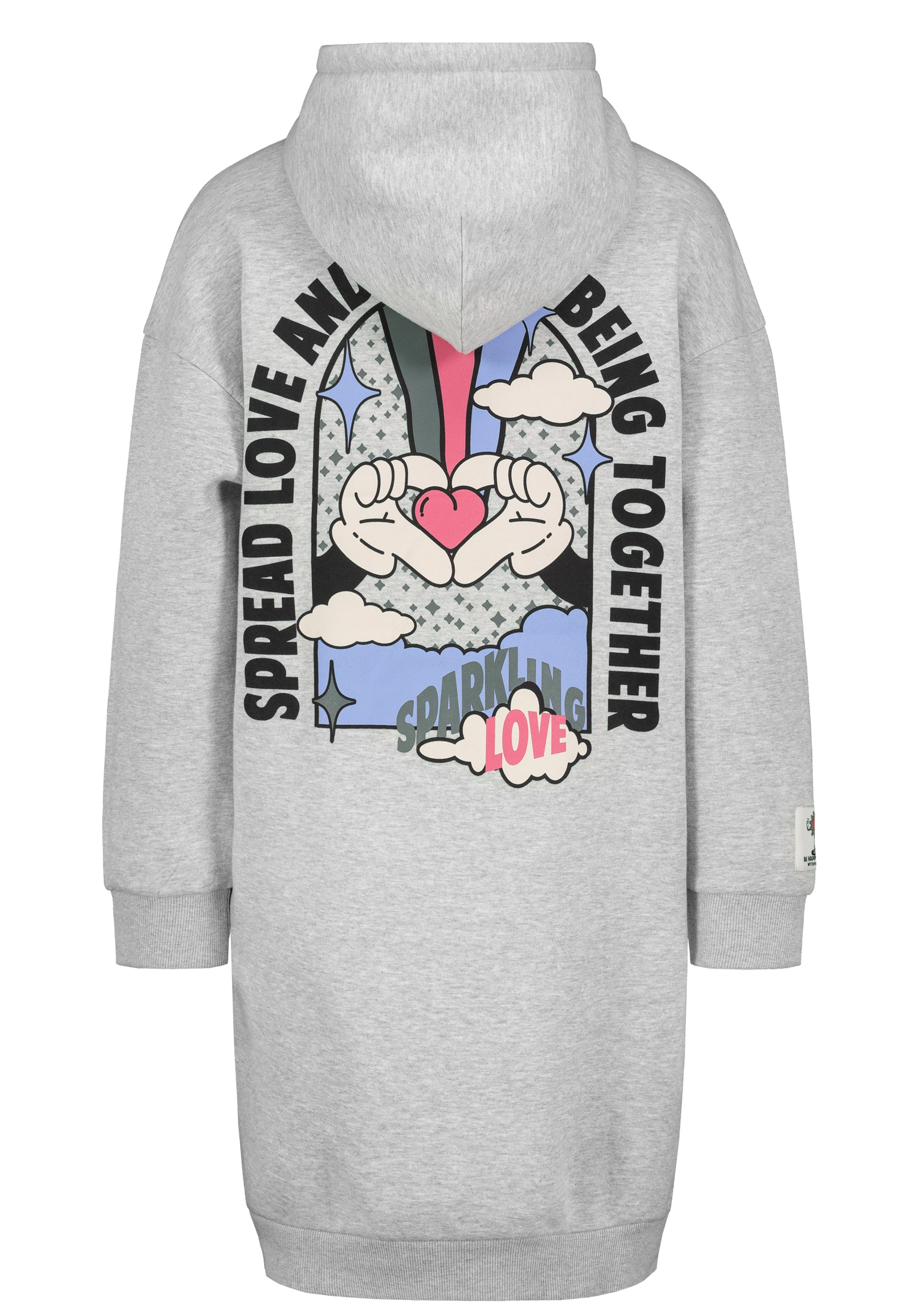 DOBSweatKleid,Oversize,MIDI Länge, Kapuzemit Kordeln & Abnäher,überschnittene Schulter,seitliche Taschen, Drucke auf VT+RT