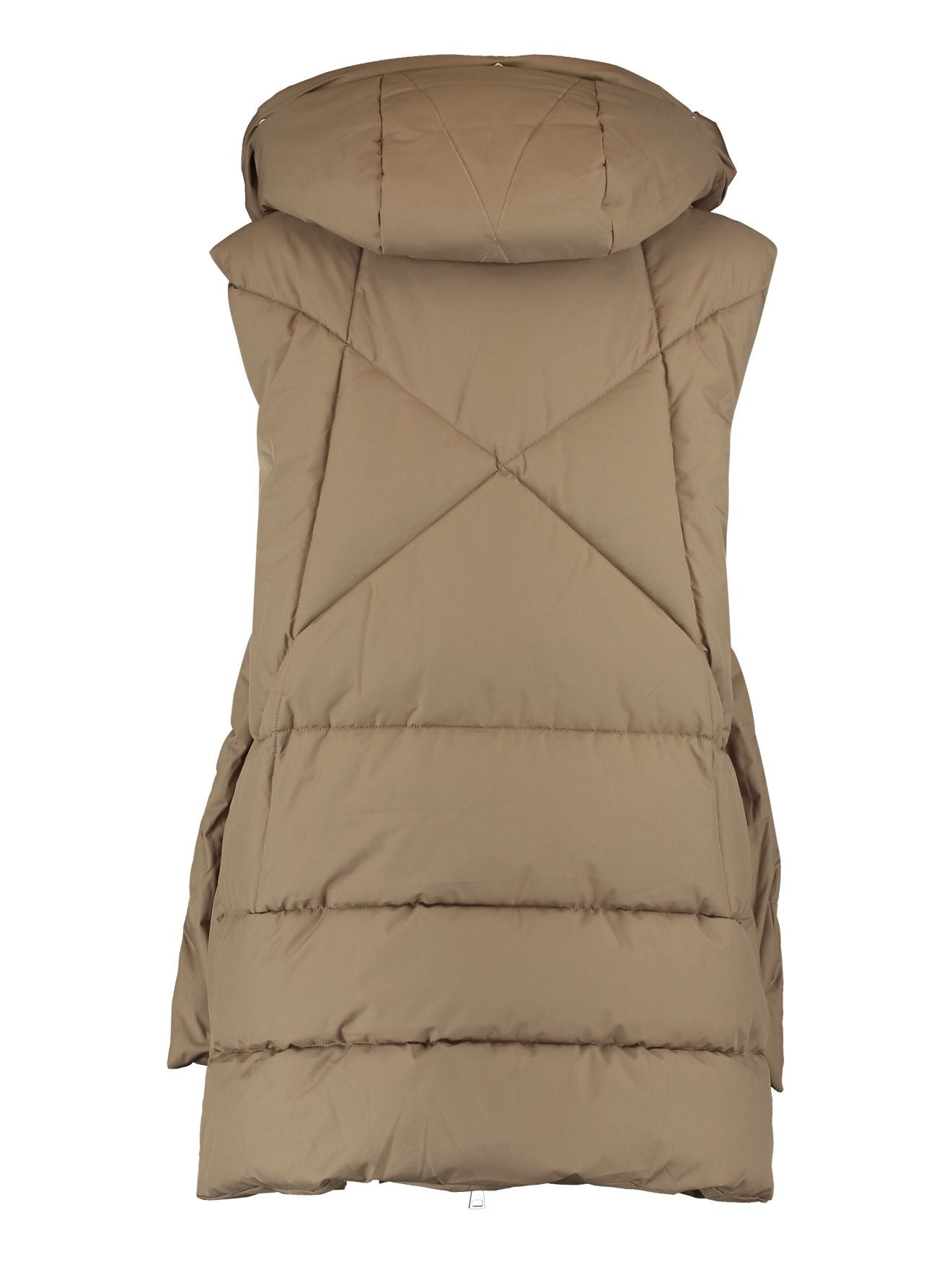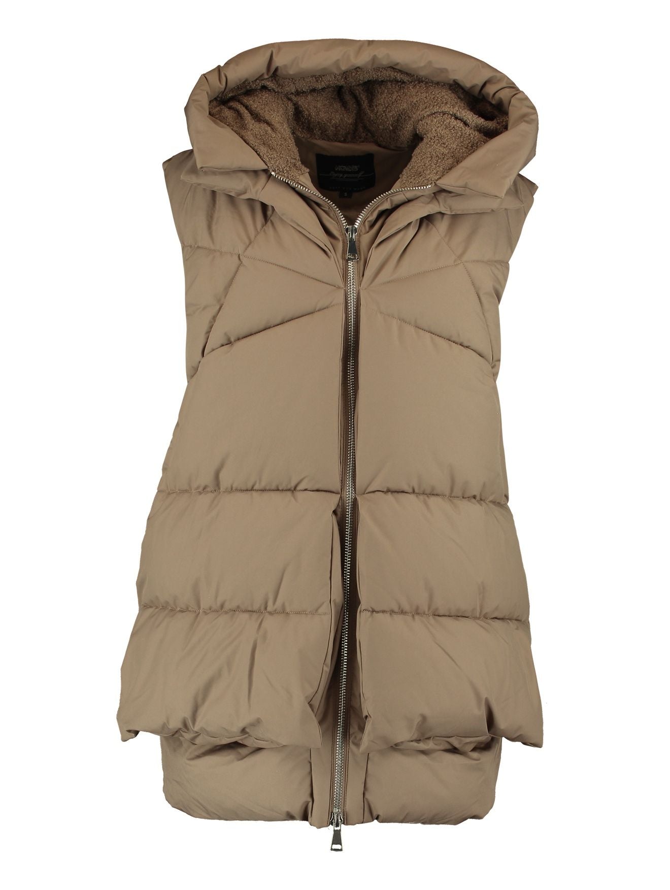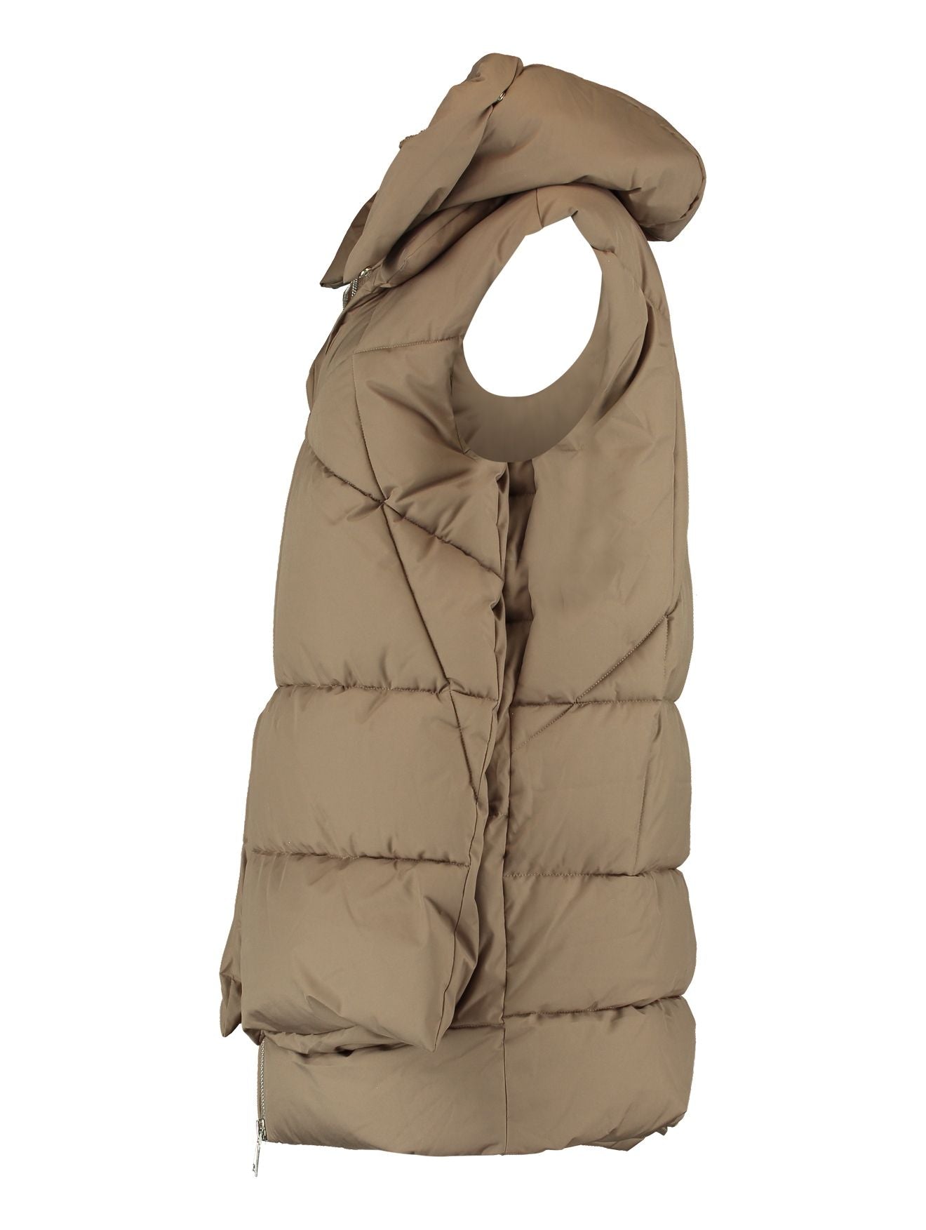 Ärmellose Weste mit Steppung und Hochabschließendem Kragen mit Kapuze.Gerader Schnitt mit Steppdesign und Lagenoptik.
