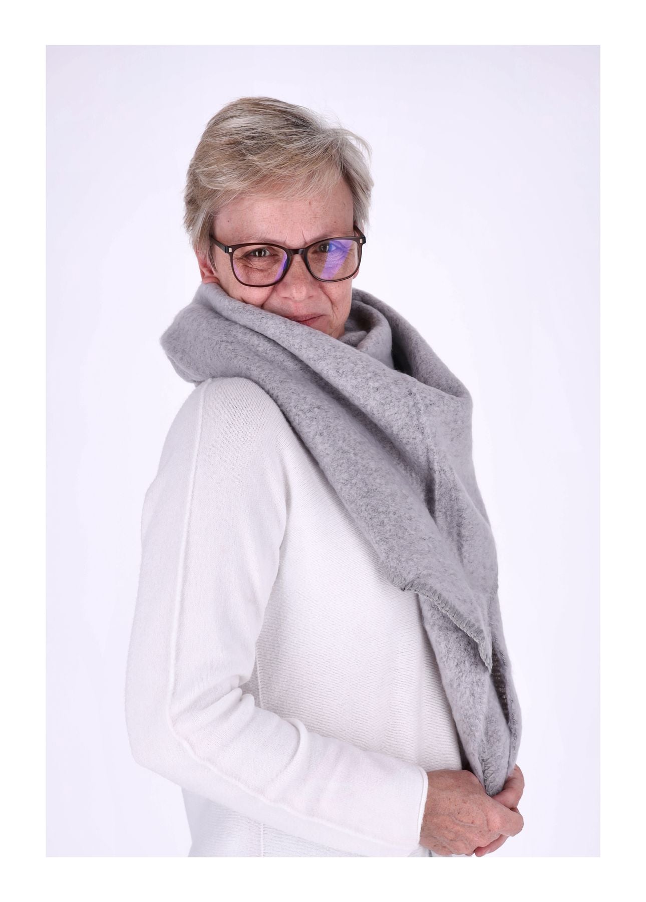 Das Tuch besticht durch seine zarte, melierte Farbgebung, die jedem Look sofort eine elegante und moderne Note verleiht. Dank der dreieckigen Form lässt es sich auf vielfältige Weise tragen – lässig um die Schultern gelegt, locker um den Hals geschlungen oder sogar als modisches Cape über der Jacke.