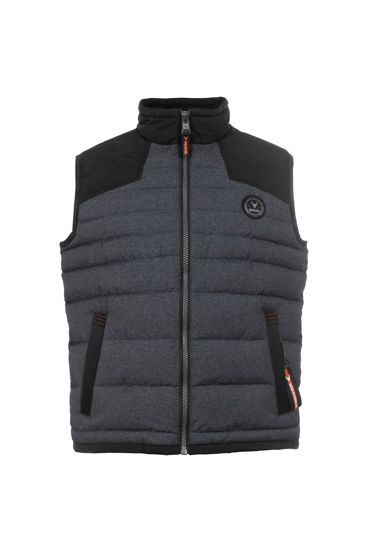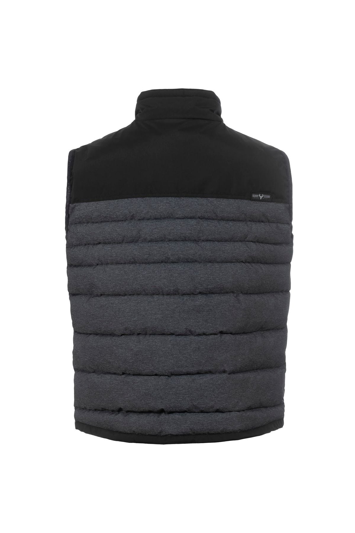 Stehkragen Steppweste in melierter Optik. Die Schulterpartie und der Kragen sind mit Nyloneinsätzen abgesetzt. Die praktischen Seitentaschen sind mit Reißverschlüssen zu verschließen.